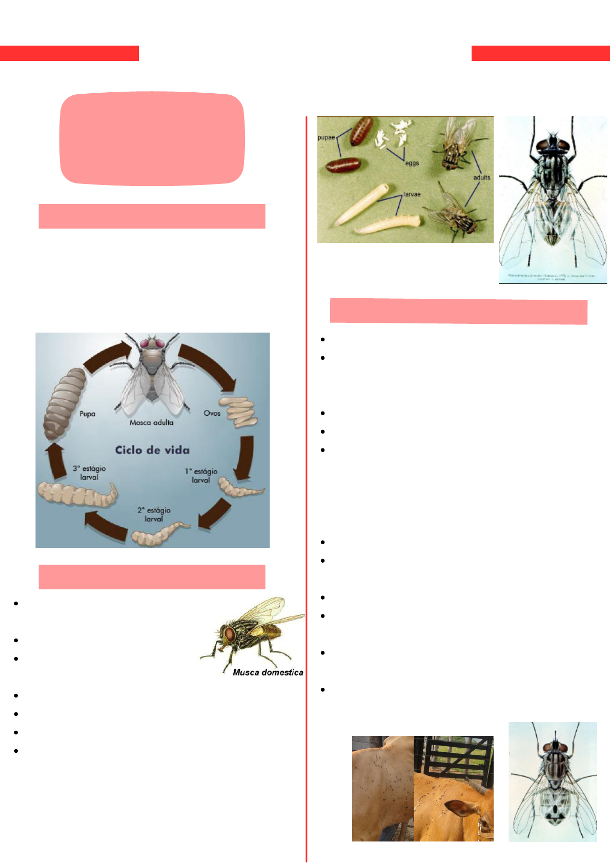 As moscas gostam de lugares que tem matéria orgânica. Ex: dejetos, lixos, etc. Elas são vetores mecânicos/biológicos de patógenos. Todo parasita gosta de calor e umidade. Parasitas hematófagos= se alimentam de sangue. Inseto: precisa ter três par patas, antenas e três partes no corpo: (cabeça, tórax, abdômen). Ectoparasitas: Moscas Introdução Musca domestica (Mosca doméstica) Stomoxys calcitrans (Mosca-dos-estábulos) Tórax de coloração cinza-amarelado a cinza-escuro. Possuem 4 faixas negras no dorso. Aparelho bocal lambedor Distribuição cosmopolita (está em todo lugar). Capaz de se desenvolver em vários tipos de matéria orgânica. Alimento: água e carboidratos. Tempo médio de vida de uma fêmea adulta varia de 25- 52 dias. E abdômen com lados amarelados. (tem um "tufinho" no fim), direcionado para baixo. Zonas de clima temperado, subtropical e tropical. Diferenciação dela para doméstica: Probóscida rígida, projetada horizontalmente para a frente da cabeça. Aparelho sugador= Picar e sugar sangue. 4 listras longitudinais no dorso do tórax. Hábitos hematófagos quando adultas. Desenvolvimento das larvas: Matéria orgânica em decomposição (cana-de-açúcar, cama de animais, palha, feno, restos de lavouras, alfafa, grãos ou farinhas umedecidas, etc.), principalmente matéria orgânica vegetal em decomposição. Período médio de vida das formas adultas: 17-29 dias. Procuram picar regiões não atingidas por movimentos de cauda, lambedura ou fricção (patas e abdômen). Perfuram a pele diversas vezes antes de sugar. Após repasto sanguíneo, as moscas pousam em locais como celeiros, cercas ou árvores. Moscas muito ativas, seguem seu hospedeiro por longas distâncias. Vetor: nematódeo Habronema. Pode transmitir o vírus da Anemia Infecciosa Equina. Principal veiculadora dos ovos da D. hominis. Tem duas estruturas que parecem chifres. É pequena (3 a 6 mm) e hematófaga. Ataca quase exclusivamente o gado Palpos longos e dilatados na extremidade. Aparelho bucal sugador. Regiões tropicais e sub-tropicais. Normalmente ficam no dorso do animal, porém, nas horas quentes vão para a região ventral. Ficam o tempo todo no animal e pode sugar de 20 a 40 vezes no dia. Elas ficam a maioria com a cabeça para baixo. Fecundação → fêmeas → partes mais baixas (face ventral, patas), para esperar o hospedeiro (ou um vizinho próximo) defecar (180 ovos/vez). Eclosão (normalmente 24 horas) depende das condições climáticas e existência de predadores naturais. Larvas (3 dias) e Pupa (6 dias). Mosca adulta em torno de 25 a 50 dias. bovino. Tem preferencia por machos adultos devido aos feromônios. Taurinos são menos resistentes. Haematobia irritans (Mosca-do-Chifre) Ação sobre o hospedeiro: Perda de sangue, intensa irritação, queda nos índices de produtividade, perda peso (40kg/ano – 500 moscas), machos: diminuição da libido e baixo desempenho reprodutivo. Controle: Grande resistência aos princípios ativos de pulverização, efeito indireto de endectocidas injetáveis, voa 25 km em busca de hospedeiro. As moscas precisam de 3 dias para eclodirem nas fezes, e nos meses de abril e outubro é o começo e o fim das chuvas, ou seja, período em que as fezes ficam numa consistência ideal para o desenvolvimento dessas larvas, pois não estão nem secas demais para impedir que essas larvas saem delas e nem úmidas demais para não se desintegrarem. Porque é período chuvoso e as fezes se desintegram, não sendo possível o desenvolvimento das larvas. Explique a grande incidência de moscas nos meses de abril e outubro. Por que entre os meses de novembro a março a incidência não é tão alta? Explique o efeito indireto de endectocidas injetáveis. A aplicação não é tão eficaz por que fica pouco tempo na corrente sanguínea, e para moscas precisaria ter um tempo de ação maior. Os endectocidas após serem injetados no animal são metabolizados e excretados nas fezes, local de desenvolvimento das larvas, o que vai evitar o desenvolvimento delas. Aparelho bocal lambedor. Coloração metálica. Miíase(bicheira): ectoparasitose, causada por Cochliomyia hominivorax – miíase primária (tecido vivo). Odor de sangue. Cochliomyia macellaria – miíase secundária (decomposição). Cochliomyia hominivorax = coloração tórax metálica azul ou azul-esverdeada, olhos vermelho-amarelados. Três listras negras no tórax. C. hominivorax - regiões quentes e úmidas - praticamente em todo Brasil. Ciclo biológico: As fêmeas são atraídas para as feridas, devido o sangue e cheiro. O ferimento a mosca oviposita (300ovos/vez) e entre 12 e 18 horas eclodem as primeiras larvas (L1), iniciando a penetração nas feridas para alimentarem-se. O período de desenvolvimento da larva nas feridas, varia de 3 a 6 dias, quando a larva cai no solo, onde se transforma em pupa. As infestações podem tornar-se profundas, caracterizando uma miíase cavitária. Período de vida: ± 30 dias. Pode atingir até 50 Km durante o seu período de vida, na procura de animais com ferimentos. Sinais clínicos: Ferida aberta com mau cheiro, sangramentos e a presença das larvas no local, necrose dos tecidos - retardamento do processo cicatricial, pode ter aparecimento de uma infecção purulenta. Profilaxia: evitar ferimentos, assepsia no ferimento, tratamento do umbigo de bezerros, manejo das pastagens e instalações, inspecionar animas frequentemente. Tratamento: Remoção manual das larvas, compostos químicos (organofosforados): Coumafós, Triclorfon e o Clorpirifós. Lactonas Macrocíclicas - Avermectinas larvas de moscas, que parasitam animais de sangue quente, alimentando-se de tecidos vivos ou mortos. Cochliomyia(Varejeiras) As larvas de Cochliomyia hominivorax: dois peritremas respiratórios na extremidade posterior, cada um com 3 espiráculos aproximados na base. Aparelho bucal não funcional. → Cabeça e tórax castanhos, abdômen azul metálico. As larvas têm espinhos 