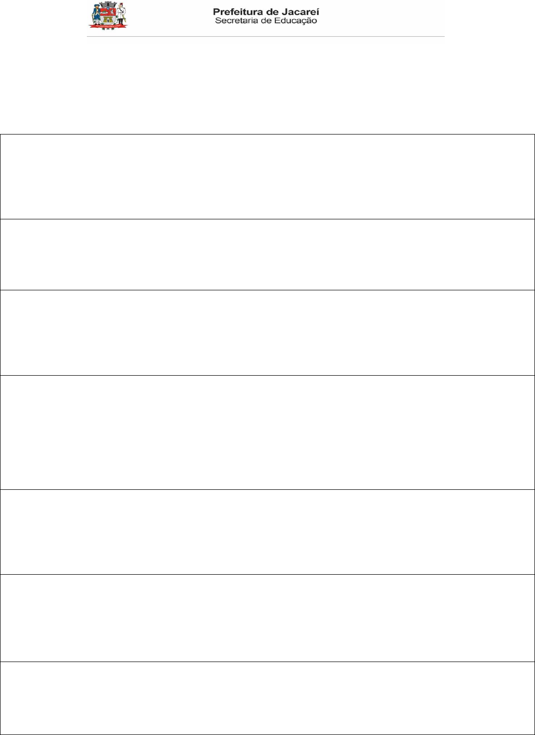 Rua Lamartine Delamare nº69 – Centro – Jacareí/SP – CEP : 12.327.010 Fone: (12) 3955-9221 educacaoespecial@edujacarei.sp.gov.br AVALIAÇÃO DIAGNÓSTICA – A.E.E. Aluno (a): _______________________________________________________ ano/nível/etapa______ Período: ________ Prof. sala regular: _______________________ Prof. AEE: ______________________ ALFABETO ( ) Conhece ( ) Seqüência ( ) Discrimina ( ) Identifica Obs: _________________________________________________________________________________ ______________________________________________________________________________________ NOME PROPRIO ( ) Identifica____________________________________________________________________________ ( ) Registra ( com ou sem apoio ) ___________________________________________________________ HIPÓTESE DE ESCRITA ( ) Pré-silábica ( ) Silábica sem valor ( ) Silábica com valor ( ) Silábica alfabética ( ) Alfabética Obs: _________________________________________________________________________________ ______________________________________________________________________________________ NUMERAIS ( ) Conhece sequência numérica ___________________________________________________________ ( ) Conta termo a termo __________________________________________________________________ ( ) Quantifica (enuncia uma quantidade)______________________________________________________ ( ) Reconhece grandeza _________________________________________________________________ ( ) Representa quantidade com número______________________________________________________ CORES ( ) Conhece ( ) Discrimina ( ) Identifica Obs: _________________________________________________________________________________ ______________________________________________________________________________________ FORMAS ( ) Conhece ( ) Identifica ( ) Diferencia ( ) Sequência Obs : _________________________________________________________________________________ ______________________________________________________________________________________ DESENHO ( ) Aprecia ( ) Tem interesse Obs: _________________________________________________________________________________ ______________________________________________________________________________________ Rua Lamartine Delamare nº69 – Centro – Jacareí/SP – CEP : 12.327.010 Fone: (12) 3955-9221 educacaoespecial@edujacarei.sp.gov.br ESQUEMA CORPORAL ( ) Conhece partes do corpo ______________________________________________________________ ( ) Identifica ___________________________________________________________________________ ( ) Discrimina __________________________________________________________________________ LATERALIDADE- Capacidade de controlar os dois lados do corpo juntos ou separadamente. ( ) Posição ____________________________________________________________________________ ( ) Direção ____________________________________________________________________________ ( ) Noção espacial ______________________________________________________________________ COORDENAÇÃO MOTORA ( ) Grossa _____________________________________________________________________________ ( ) Fina _______________________________________________________________________________ ( ) Específica __________________________________________________________________________ ______________________________________________________________________________________ DISCRIMINAÇÃO VISUAL- Capacidade de ver as diferenças e semelhanças nas formas, cores, tamanhos, posições e orientações. (imagens, objetos, etc) Obs: _________________________________________________________________________________ ______________________________________________________________________________________ ______________________________________________________________________________________ ANÁLISE E SINTESE VISUAL- Habilidade de visualizar o todo, dividir em partes e retornar para o todo. Obs: _________________________________________________________________________________ ______________________________________________________________________________________ ______________________________________________________________________________________ DISCRIMINAÇÃO AUDITIVA- Habilidade de detectar o som, discriminar, localizar, reconhecer, compreender e manter atenção no estímulo. Obs: _________________________________________________________________________________ ______________________________________________________________________________________ ______________________________________________________________________________________ LINGUAGEM ORAL Obs: _________________________________________________________________________________ ______________________________________________________________________________________ ______________________________________________________________________________________ Jacareí, ____/____/_______