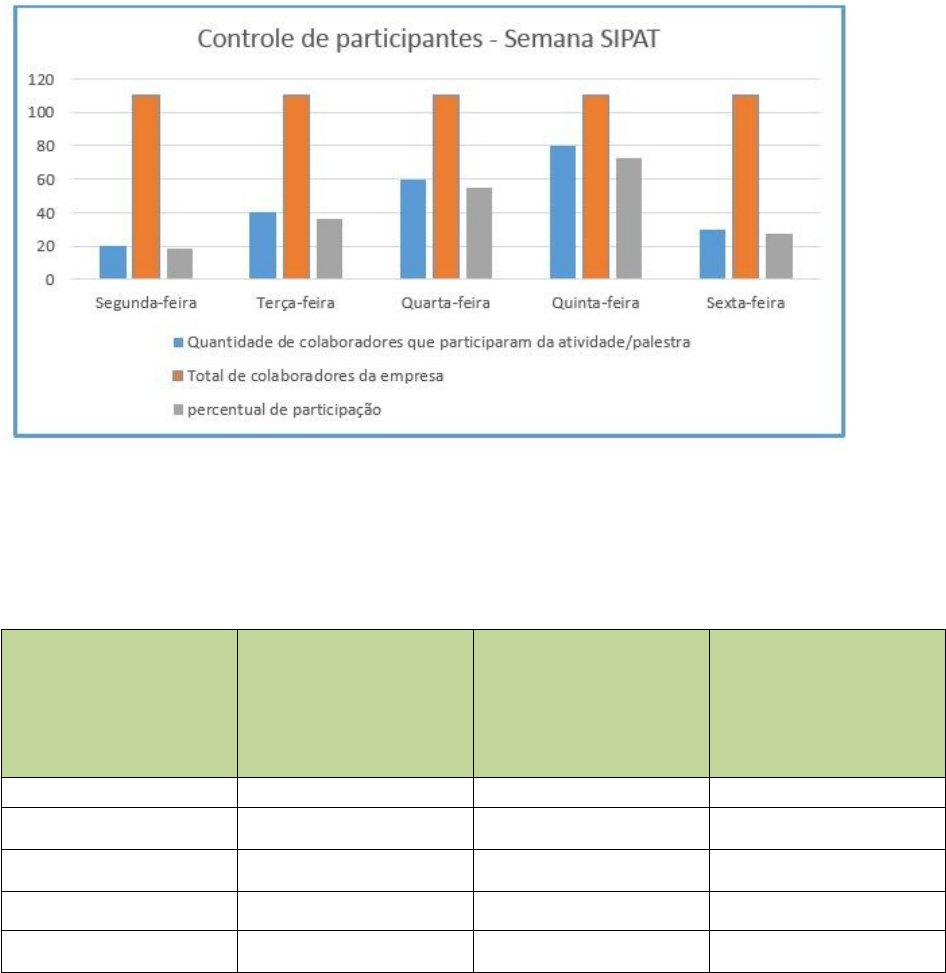 Dias da semana Quantidade de colaboradores que participaram da atividade/ palestra Total de colaboradores da empresa Percentual de participação Segunda-feira 20 110 18,18% Terça-feira 40 110 36,35% Quarta-feira 60 110 54,52% Quinta-feira 80 110 72,72% Sexta-feira 30 110 27,36%