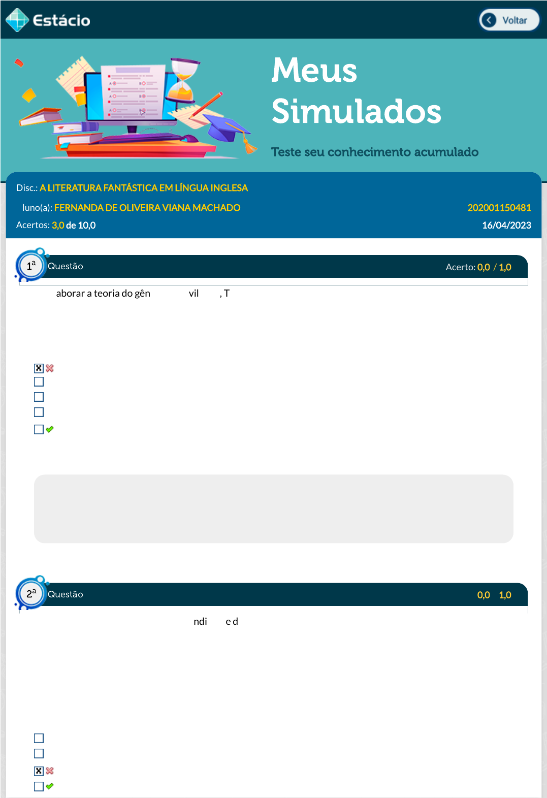 16/04/2023, 23:02 Estácio: Alunos https://simulado.estacio.br/alunos/ 1/6 Meus Simulados Teste seu conhecimento acumulado Disc.: A LITERATURA FANTÁSTICA EM LÍNGUA INGLESA Aluno(a): FERNANDA DE OLIVEIRA VIANA MACHADO 202001150481 Acertos: 3,0 de 10,0 16/04/2023 Acerto: 0,0 / 1,0 Ao elaborar a teoria do gênero maravilhoso, Todorov concebe a modalidade de maravilhoso puro. Nele, não há uma delimitação temporal ou características particulares. A classi�cação de um texto como maravilhoso puro advém da presença de elementos insólitos, inseridos na realidade narrativa. Desta forma não provocam estranhamento no leitor ou narrador, como ocorre no gênero fantástico. Dentre alguns autores do gênero maravilhoso analisados por Todorov, podemos citar: Franz Kafka. Jacques Cazotte. Edgar Alan Poe. Alejo Carpentier. Charles Perrault. Respondido em 16/04/2023 23:01:38 Explicação: Todorov cita alguns contos de Perrault, escritor francês do século XVII, famoso por contos de fadas tais como Chapeuzinho Vermelho e A Bela Adormecida, como exemplo de texto maravilhoso puro. Nele, não há reação diante de animais que falam, existências de seres mágicos e outros eventos sobrenaturais. Acerto: 0,0 / 1,0 O fenômeno fantástico pode ser entendido de diversas formas na teoria da literatura. Em seu livro Introdução à Literatura Fantástica Tzvetan Todorov a�rma: "Há um fenômeno estranho que se pode explicar de duas maneiras, por meio de causas naturais e sobrenaturais. A possibilidade de se hesitar entre os dois criou o efeito fantástico" (TODOROV, Tzvetan. Introdução à literatura fantástica. São Paulo: Perspectiva, 1992. p. 31). Também nesse livro, Todorov discorre a respeito de dois gêneros limítrofes, que advém da escolha pela causa natural ou sobrenatural, interrompendo a hesitação. Que são, respectivamente, os gêneros: realismo mágico e real maravilhoso. realismo fantástico e estranho. real maravilhoso e realismo fantástico. fantástico-estranho e fantástico-maravilhoso. Questão1 a Questão2 a https://simulado.estacio.br/alunos/inicio.asp javascript:voltar(); 16/04/2023, 23:02 Estácio: Alunos https://simulado.estacio.br/alunos/ 2/6 estranho e fantástico maravilhoso. Respondido em 16/04/2023 23:01:45 Explicação: O gênero fantástico perdura apenas durante o tempo da hesitação; quando esta é solucionada, por narrador e leitor, seja para abraçar o sobrenatural ou desfazê-lo a partir de uma explicação racional, o fantástico se desfaz. A esses gêneros que partem de uma hesitação e �nalizam em uma solução, Todorov classi�cou de gêneros limítrofes. O fantástico-estranho adviria da escolha natural, enquanto o fantástico-maravilhoso optaria pela incorporação do insólito. Acerto: 1,0 / 1,0 Todorov separa o gênero maravilhoso puro de outras narrativas que apresentam o fenômeno maravilhoso, mas sob algumas justi�cativas. Como exemplo utiliza a obra As mil e uma noites e faz menção ao episódio em que uma cobra de proporções descomunais é capaz de engolir um elefante. Leia as alternativas abaixo e marque a de�nição correta para essa forma do maravilhoso. Maravilhoso cientí�co. Maravilhoso hiperbólico. Maravilhoso exótico. Maravilhoso puro. Maravilhoso instrumental. Respondido em 16/04/2023 23:01:49 Explicação: Para Todorov, algumas manifestações do insólito, nas narrativas, não se enquadram no gênero maravilhoso puro, pois, de alguma forma, justi�cam a presença do evento sobrenatural. No caso de As mil e uma noites, o autor exempli�ca com a existência de seres descomunais na obra, que provocam estranhamento pelo excesso, deste exagero advém a classi�cação como maravilhoso hiperbólico. Acerto: 0,0 / 1,0 Read the de�nition for High fantasy below. Then, based on it choose the alternative that contains only novels that exemplify such genre. Fantasy stories that are set in an imaginary world and/or are epic in nature; meaning they feature a hero on some type of quest. This subgenre became particularly popular in the 20th century and continues to dominate much of popular fantasy today. Available at: https://literaryterms.net/fantasy/. Access on: July 22, 2022. The Song of Ice and Fire, American Gods and The Chronicles of Narnia. American Gods, The City We Became and The Song of Ice and Fire. The Chronicles of Narnia, The Lord of the Rings and Harry Potter. The City We Became, The Chronicles of Narnia, The Lord of the Rings. The Song of Ice and Fire, Harry Potter, The Hobbit. Respondido em 16/04/2023 23:01:52 Explicação: Questão3 a Questão4 a 16/04/2023, 23:02 Estácio: Alunos https://simulado.estacio.br/alunos/ 3/6 According to the de�nition, two aspects relate to High fantasy: an imaginary or secondary world and its epic nature. For instance, in The Lord of the Rings (1954-1955), one has got a world which resembles some aspects of ours but it is clearly another. Tolkien, therefore, crafted a secondary world, Middle Earth, where the narrative unfolds. Another way in which this Secondary World may take place is - in The Chronicles of Narnia (1950-1956) or The Harry Potter Saga (1997 - 2007), for example - as a world inside our world, yet hidden. Be it a wardrobe door to Narnia or a train station in which there is a platform 9 ¾, Secondary worlds are part of each of these �ctions. The other novels, however, relate to another subgenre: low fantasy. Acerto: 0,0 / 1,0 Every magical realism novel is different, but there are certain things they all include, such as: Realistic setting. All magical realism novels take place in a setting in this world that's familiar to the reader. Magical elements. From talking objects to dead characters to telepathy, every magical realism story has fantastical elements that do not occur in our world. However, they're presented as normal within the novel. Limited information. Magical realism authors deliberately leave the magic in their stories unexplained in order to normali