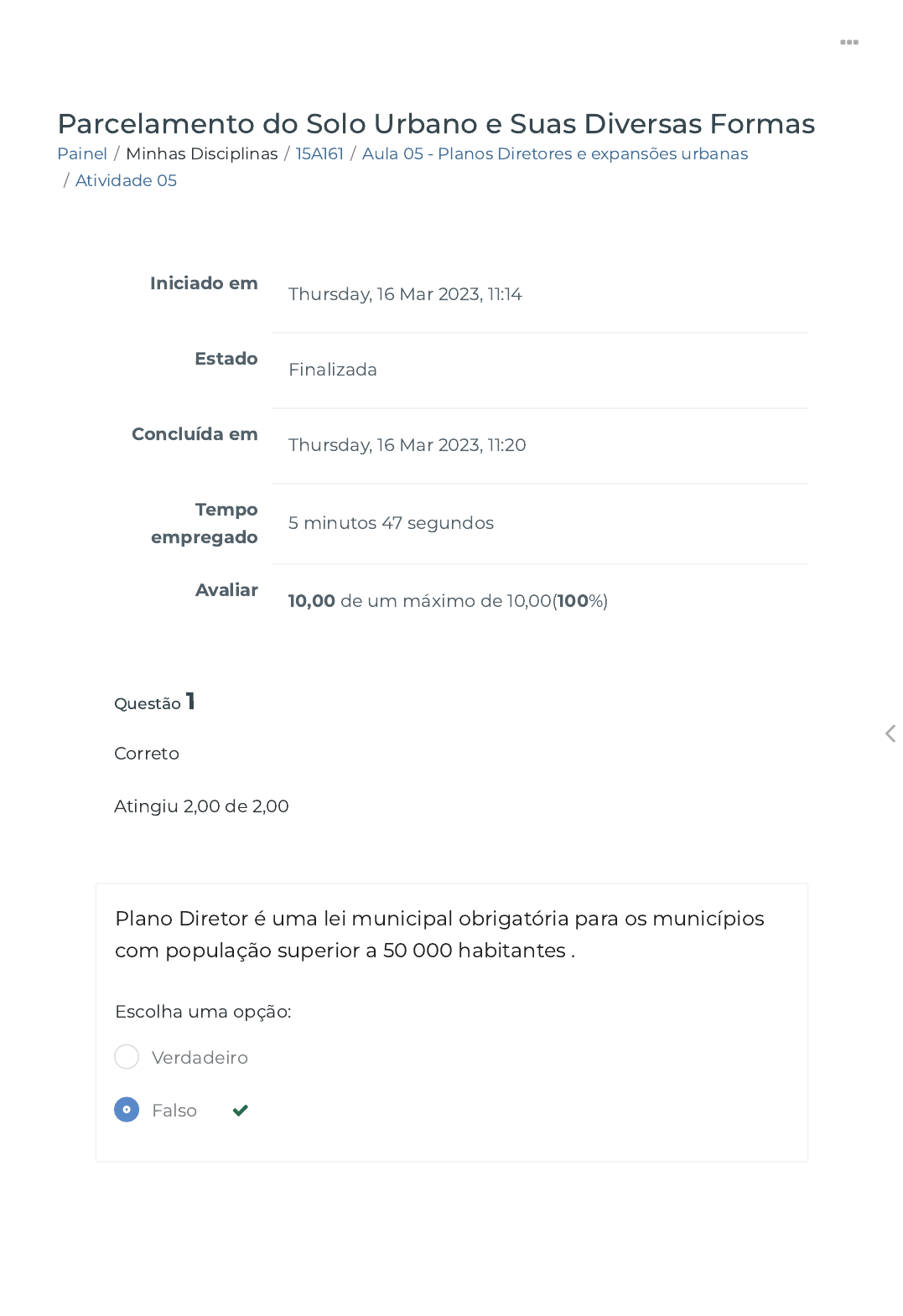 16/03/2023 11:20 Atividade 05 https://ava.politecnicabr.com.br/mod/quiz/review.php?attempt=4559263 1/4 Painel / Minhas Disciplinas / 15A161 / Aula 05 - Planos Diretores e expansões urbanas / Atividade 05 Parcelamento do Solo Urbano e Suas Diversas Formas Iniciado em Thursday, 16 Mar 2023, 11:14 Estado Finalizada Concluída em Thursday, 16 Mar 2023, 11:20 Tempo empregado 5 minutos 47 segundos Avaliar 10,00 de um máximo de 10,00(100%) Questão 1 Correto Atingiu 2,00 de 2,00 Plano Diretor é uma lei municipal obrigatória para os municípios com população superior a 50 000 habitantes . Escolha uma opção: Verdadeiro Falso https://ava.politecnicabr.com.br/my/ https://ava.politecnicabr.com.br/course/view.php?id=920 https://ava.politecnicabr.com.br/course/view.php?id=920#section-6 https://ava.politecnicabr.com.br/mod/quiz/view.php?id=31825 https://ava.politecnicabr.com.br/ 16/03/2023 11:20 Atividade 05 https://ava.politecnicabr.com.br/mod/quiz/review.php?attempt=4559263 2/4 Questão 2 Correto Atingiu 2,00 de 2,00 O plano deve ser participativo, constituindo-se em um instrumento de democratização da gestão da cidade, capaz de orientar o crescimento da mesma de forma ordenada, buscando regular a ação dos entes produtores do espaço. Escolha uma opção: Questão 3 Correto Atingiu 2,00 de 2,00 O zoneamento consiste na repartição do solo segundo a sua precípua destinação urbanística. Escolha uma opção: Verdadeiro Falso Verdadeiro Falso https://ava.politecnicabr.com.br/ 16/03/2023 11:20 Atividade 05 https://ava.politecnicabr.com.br/mod/quiz/review.php?attempt=4559263 3/4 Questão 4 Correto Atingiu 1,00 de 1,00 Legislação sobre patrimônio cultural aborda as questões ligadas à preservação do patrimônio material e imaterial da cidade. Escolha uma opção: Questão 5 Correto Atingiu 1,00 de 1,00 O Plano Diretor é um instrumento eminentemente político, cujo objetivo deverá ser o de dar transparência e democratizar a política urbana. Escolha uma opção: Verdadeiro Falso Verdadeiro Falso https://ava.politecnicabr.com.br/ 16/03/2023 11:20 Atividade 05 https://ava.politecnicabr.com.br/mod/quiz/review.php?attempt=4559263 4/4 © 2022 - Escola Politécnica Brasileira Questão 6 Correto Atingiu 2,00 de 2,00 Lei do perímetro urbano estabelece os usos permitidos para as diversas zonas e coe�cientes para utilização de áreas, entre outros critérios. Escolha uma opção: Verdadeiro Falso Entre em Contato https://www.politecnicabr.com.br 0800 084 2627 0800 084 2627 Links Úteis Dicas da nossa Diretora Acadêmica Planner de Estudos Declaração de Matrícula Orientações do AVA Abertura de Ticket Fale com o Tutor Cronograma de Estudos Manual de Estágio Manual de Competência Siga-nos nas redes sociais https://ava.politecnicabr.com.br/mod/quiz/0 https://www.politecnicabr.com.br/ https://soundcloud.com/user-501638417/sets/escola-politecnica-brasileira https://storage.googleapis.com/sirius-pubstore/semestre_plannerdeestudo%20poli.pdf https://storage.googleapis.com/sirius-pubstore/declaracao_matricula.pdf https://storage.googleapis.com/sirius-pubstore/orientacoes_ava.pdf https://storage.googleapis.com/sirius-pubstore/abertura_ticket.pdf https://storage.googleapis.com/sirius-pubstore/fale_com_tutor.pdf https://storage.googleapis.com/sirius-pubstore/cronograma_estudos.pdf https://storage.googleapis.com/sirius-pubstore/manual_estagio.pdf https://storage.googleapis.com/sirius-pubstore/manual_competencia.pdf https://www.facebook.com/politecnicabr https://www.instagram.com/politecnicabr_oficial https://ava.politecnicabr.com.br/