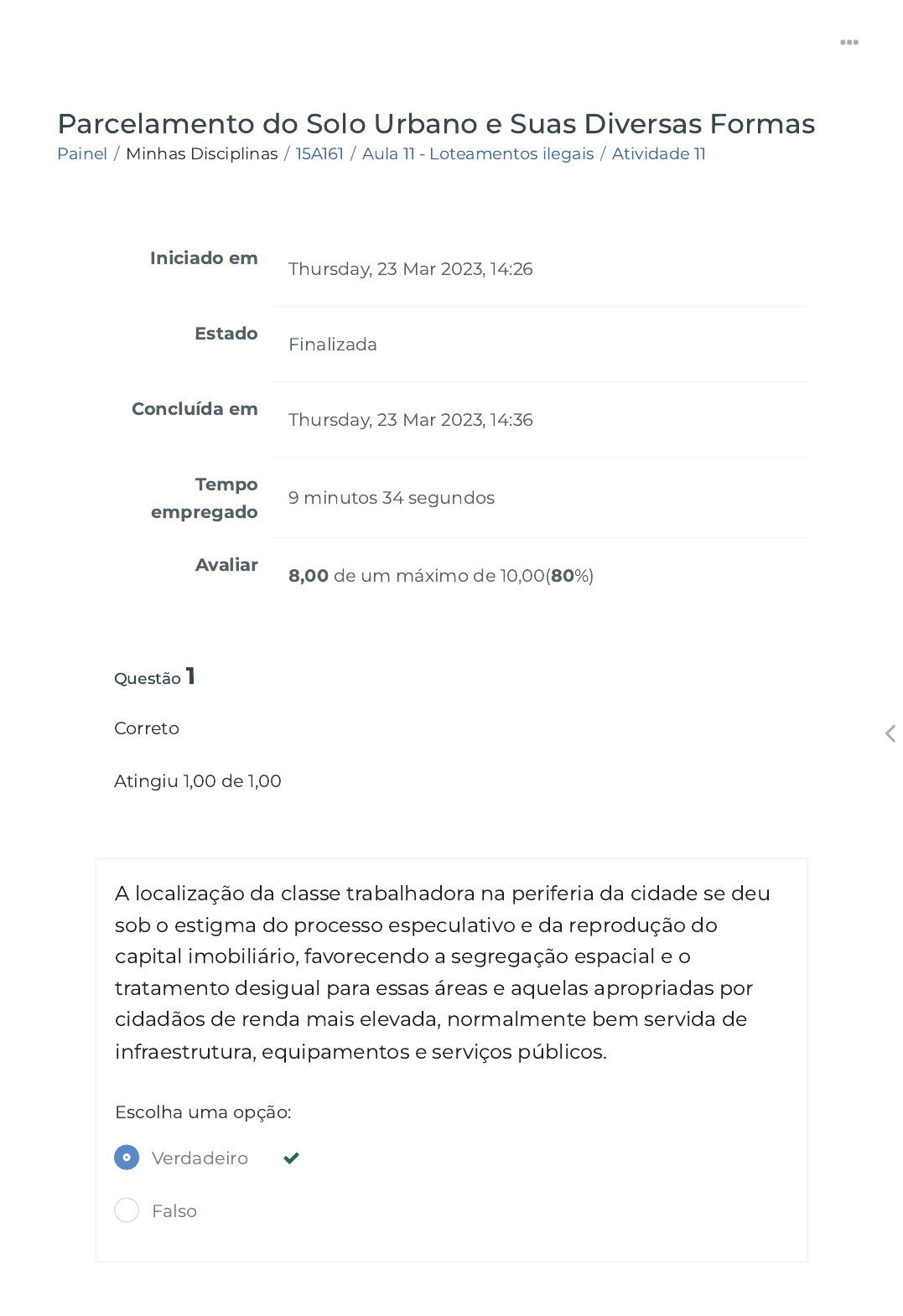 23/03/2023 14:36 Atividade 11 https://ava.politecnicabr.com.br/mod/quiz/review.php?attempt=4604325 1/6 Painel / Minhas Disciplinas / 15A161 / Aula 11 - Loteamentos ilegais / Atividade 11 Parcelamento do Solo Urbano e Suas Diversas Formas Iniciado em Thursday, 23 Mar 2023, 14:26 Estado Finalizada Concluída em Thursday, 23 Mar 2023, 14:36 Tempo empregado 9 minutos 34 segundos Avaliar 8,00 de um máximo de 10,00(80%) Questão 1 Correto Atingiu 1,00 de 1,00 A localização da classe trabalhadora na periferia da cidade se deu sob o estigma do processo especulativo e da reprodução do capital imobiliário, favorecendo a segregação espacial e o tratamento desigual para essas áreas e aquelas apropriadas por cidadãos de renda mais elevada, normalmente bem servida de infraestrutura, equipamentos e serviços públicos. Escolha uma opção: Verdadeiro Falso https://ava.politecnicabr.com.br/my/ https://ava.politecnicabr.com.br/course/view.php?id=920 https://ava.politecnicabr.com.br/course/view.php?id=920#section-13 https://ava.politecnicabr.com.br/mod/quiz/view.php?id=31850 https://ava.politecnicabr.com.br/ 23/03/2023 14:36 Atividade 11 https://ava.politecnicabr.com.br/mod/quiz/review.php?attempt=4604325 2/6 Questão 2 Correto Atingiu 1,00 de 1,00 O parcelamento ilegal tornou-se um fator de grande impacto nas cidades e como tal deve ser combatido buscando sua prevenção e repressão. Escolha uma opção: Questão 3 Correto Atingiu 1,00 de 1,00 O processo de urbanização se deu por meio de uma industrialização baseada em baixos salários e em um mercado residencial restrito onde o custo de reprodução da força de trabalho incluindo o custo da mercadoria habitação, �xado pelo mercado público. Escolha uma opção: Verdadeiro Falso Verdadeiro Falso https://ava.politecnicabr.com.br/ 23/03/2023 14:36 Atividade 11 https://ava.politecnicabr.com.br/mod/quiz/review.php?attempt=4604325 3/6 Questão 4 Correto Atingiu 2,00 de 2,00 De acordo com suas leituras é possível a�rmar que o descontrole do processo de urbanização levou à periferização dos bairros para pessoas de renda mais baixa, ao mesmo tempo em que deixavam grandes vazios entre esses últimos e as áreas centrais, no intuito de angariarem valorização com a passagem das redes de infraestrutura e serviços urbanos. Escolha uma opção: Questão 5 Correto Atingiu 1,00 de 1,00 Loteamento irregulares, que são aqueles aprovados pela prefeitura, mas que não foram inscritos, ou o foram, mas são executados em desconformidade com o plano e as plantas aprovadas. Escolha uma opção: Verdadeiro Falso Verdadeiro Falso https://ava.politecnicabr.com.br/ 23/03/2023 14:36 Atividade 11 https://ava.politecnicabr.com.br/mod/quiz/review.php?attempt=4604325 4/6 Questão 6 Correto Atingiu 1,00 de 1,00 A legislação urbana de uso e ocupação do solo foi um dos instrumentos que contribuíram para reforçar a segregação na sua componente espacial. Escolha uma opção: Questão 7 Incorreto Atingiu 0,00 de 2,00 O cenário de segregação espacial foi facilitado pela omissão dos municípios e construído pela ação de proprietários de terras e agentes imobiliários ávidos por lucratividades, obtidas com a valorização das terras. Escolha uma opção: Verdadeiro Falso Verdadeiro Falso https://ava.politecnicabr.com.br/ 23/03/2023 14:36 Atividade 11 https://ava.politecnicabr.com.br/mod/quiz/review.php?attempt=4604325 5/6 Questão 8 Correto Atingiu 1,00 de 1,00 É verdade que a cidade legal hegemônica é arquitetada pelo poder executivo que ali concentra seus investimentos, pelo poder jurídico, organizado em torno de regras que não são universais, além da mídia de massa, principal divulgadora do simulacro. Escolha uma opção: Verdadeiro Falso Entre em Contato https://www.politecnicabr.com.br 0800 084 2627 0800 084 2627 Links Úteis Dicas da nossa Diretora Acadêmica Planner de Estudos Declaração de Matrícula Orientações do AVA Abertura de Ticket Fale com o Tutor Cronograma de Estudos Manual de Estágio Manual de Competência Siga-nos nas redes sociais https://www.politecnicabr.com.br/ https://soundcloud.com/user-501638417/sets/escola-politecnica-brasileira https://storage.googleapis.com/sirius-pubstore/semestre_plannerdeestudo%20poli.pdf https://storage.googleapis.com/sirius-pubstore/declaracao_matricula.pdf https://storage.googleapis.com/sirius-pubstore/orientacoes_ava.pdf https://storage.googleapis.com/sirius-pubstore/abertura_ticket.pdf https://storage.googleapis.com/sirius-pubstore/fale_com_tutor.pdf https://storage.googleapis.com/sirius-pubstore/cronograma_estudos.pdf https://storage.googleapis.com/sirius-pubstore/manual_estagio.pdf https://storage.googleapis.com/sirius-pubstore/manual_competencia.pdf https://www.facebook.com/politecnicabr https://www.instagram.com/politecnicabr_oficial https://ava.politecnicabr.com.br/ 23/03/2023 14:36 Atividade 11 https://ava.politecnicabr.com.br/mod/quiz/review.php?attempt=4604325 6/6 © 2022 - Escola Politécnica Brasileira https://ava.politecnicabr.com.br/mod/quiz/0 https://ava.politecnicabr.com.br/