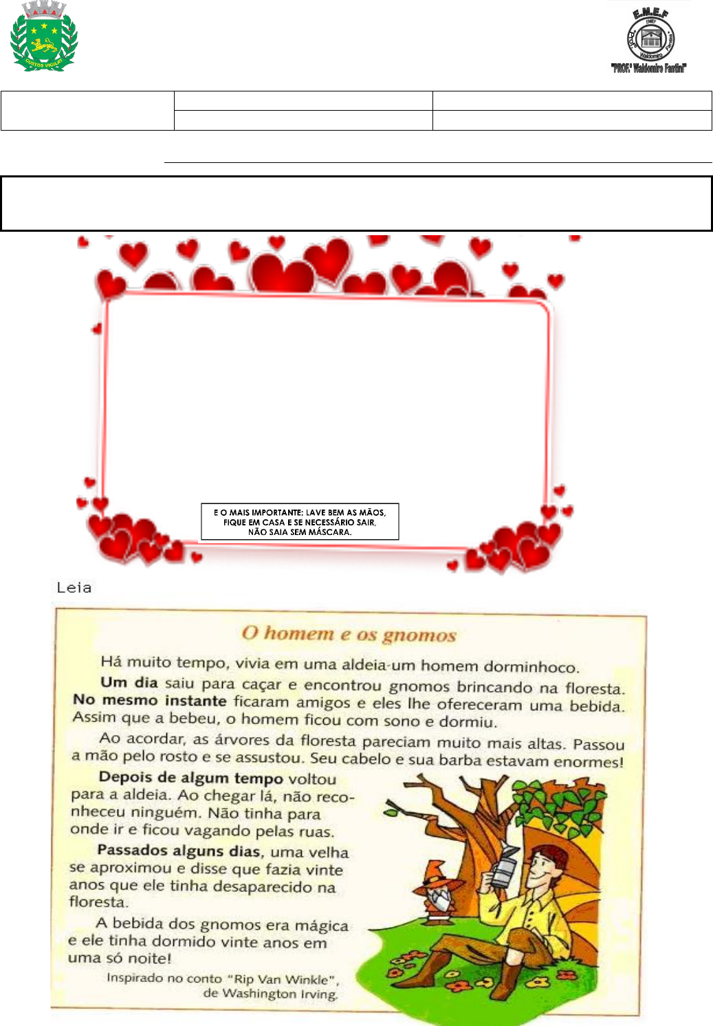 1 PREFEITURA MUNICIPAL DE BAURU Secretaria Municipal da Educação EMEF “Prof. Waldomiro Fantini” BLOCO DE REVISÃO 5º ANO A PERÍODO LETIVO COMPONENTE CURRICULAR 07/06/2021 a 11/06/2021 LÍNGUA PORTUGUESA NOME DO ALUNO: CONTEÚDOS ESSENCIAIS: Leitura, compreensão e produção de textos de diferentes gêneros textuais. OBJETIVOS: Ler, compreender e produzir textos, de acordo com as convenções do gênero e considerando a situação comunicativa e a finalidade do texto, utilizando conhecimentos linguísticos e gramaticais. Olá, tudo bem com você? Espero que todos aí estejam bem e com saúde! Neste Bloco vamos realizar uma revisão, tenho certeza que você irá conseguir fazer direitinho! Dicas par ir bem nos estudos: • Mantenha uma rotina de estudos; • Organize seu espaço: escolha um lugar calmo e limpo para estudar; • Não faça as atividades com pressa. Concentre-se e faça no seu ritmo, com capricho; • Se precisar peça a ajuda da professora pelo WhatsApp. 2 https://tiainez.blogspot.com/2010/?m=0 3 https://pt.slideshare.net/Alvarenga-48/gnero-textual-fabulas-e-contos 4 ps://cucasuperlegal.com/5o-ano-atividades-domiciliares-de-lingua-portuguesa-e-matematica/ https://cucasuperlegal.com/5o-ano-atividades-domiciliares-de-lingua-portuguesa-e-matematica/ https://cucasuperlegal.com/5o-ano-atividades-domiciliares-de-lingua-portuguesa-e-matematica/ 5 https://educacaoetransformacaooficial.blogspot.com/2020/05/lingua-portuguesa-5-ano.html o 6 PREFEITURA MUNICIPAL DE BAURU Secretaria Municipal da Educação EMEF “Prof. Waldomiro Fantini” BLOCO DE REVISÃO 5º ANO A PERÍODO LETIVO COMPONENTE CURRICULAR 07/06/2021 a 11/06/2021 MATEMÁTICA NOME DO ALUNO: CONTEÚDOS ESSENCIAIS: Operações matemáticas, Problemas, Gráficos e tabelas. OBJETIVOS: Realizar operações de adição, subtração, multiplicação e divisão com autonomia; Ler, interpretar e resolver situações problemas do cotidiano; Ler e interpretar dados matemáticos em gráficos e tabelas. https://cucasuperlegal.com/5o-ano-atividades-domiciliares-de-lingua-portuguesa-e-matematica/ Preste atenção no sinal da operação! Resolva no espaço que está na próxima página e coloque o resultado na cruzadinha abaixo. 1) 7 a) b) c) d) e) f) h) g) i) j) k) 2) 48 420 26 62 8 https://www.soescola.com/2016/08/atividades-de-matematica-para-5-ano.html https://www.indagacao.com.br/2019/02/atividade-matematica-5-ano-divisao.html 3) 4) Resolva as divisões. https://www.indagacao.com.br/2019/02/atividade-matematica-5-ano-divisao.html 9 5) 10 https://www.todamateria.com.br/atividades-de-matematica-4-ano/ 6) 7) 8) 11 https://www.soescola.com/2016/10/baixe-em-pdf-problemas-de-matematica.html https://pt.scribd.com/doc/226030261/Avaliacao-de-Matematica-situacoes-problema Comece a expressão pela conta dentro dos parênteses ( )! Resolva aqui: 9) 10) 11) a) b) c) d) e) f) - - https://pt.scribd.com/doc/226030261/Avaliacao-de-Matematica-situacoes-problema