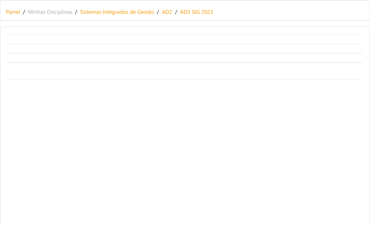 17/04/2023, 21:59 AD2 SIG 2023: Revisão da tentativa https://graduacao.cederj.edu.br/ava/mod/quiz/review.php?attempt=1105700&cmid=282024 1/11 Painel / Minhas Disciplinas / Sistemas Integrados de Gestão / AD2 / AD2 SIG 2023 Iniciado em segunda, 17 abr 2023, 21:31 Estado Finalizada Concluída em segunda, 17 abr 2023, 21:59 Tempo empregado 27 minutos 42 segundos Avaliar 10,00 de um máximo de 10,00(100%) https://graduacao.cederj.edu.br/ava/my/ https://graduacao.cederj.edu.br/ava/course/view.php?id=239 https://graduacao.cederj.edu.br/ava/course/view.php?id=239§ion=4 https://graduacao.cederj.edu.br/ava/mod/quiz/view.php?id=282024 17/04/2023, 21:59 AD2 SIG 2023: Revisão da tentativa https://graduacao.cederj.edu.br/ava/mod/quiz/review.php?attempt=1105700&cmid=282024 2/11 Questão 1 Correto Atingiu 1,00 de 1,00 Serviço que permite a aproximação da empresa com o consumidor e admite que os clientes são o centro do negócio: Escolha uma opção: A. SCM B. CRM Parabéns, você entendeu o conceito tratado na Aula 06. C. e-banking D. B2B E. DDS Sua resposta está correta. A resposta correta é: CRM 17/04/2023, 21:59 AD2 SIG 2023: Revisão da tentativa https://graduacao.cederj.edu.br/ava/mod/quiz/review.php?attempt=1105700&cmid=282024 3/11 Questão 2 Correto Atingiu 1,00 de 1,00 O supervisor de um departamento solicitou a um funcionário que ele fizesse uma lista de itens de hardware e de software que estavam em seu poder. O funcionário tinha em sua posse, além de uma CPU com Windows 10, um hard disk, um pen drive onde tinha gravado o Windows Media Player, e uma unidade de CD-ROM. Na CPU ele tinha instalado também o MS-Word e a Calculadora do Windows. Nessa situação, na lista que o funcionário fez corretamente constavam: Escolha uma opção: A. três itens de hardware e cinco de software B. dois itens de hardware e três de software C. quatro itens de hardware e quatro de software Parabéns, você assimilou bem este conteúdo das aulas 01 e 02. D. quatro itens de hardware e três de software E. três itens de hardware e quatro de software Sua resposta está correta. A resposta correta é: quatro itens de hardware e quatro de software 17/04/2023, 21:59 AD2 SIG 2023: Revisão da tentativa https://graduacao.cederj.edu.br/ava/mod/quiz/review.php?attempt=1105700&cmid=282024 4/11 Questão 3 Correto Atingiu 1,00 de 1,00 Aplicação de software que controla o acesso externo, via internet, às redes internas das organizações, seja acessos de entrada ou saída: Escolha uma opção: A. PrtSc B. midleware C. multimídia D. firewall Parabéns, você assimilou bem esta parte do conteúdo da Aula 05. E. extranet Sua resposta está correta. A resposta correta é: firewall 17/04/2023, 21:59 AD2 SIG 2023: Revisão da tentativa https://graduacao.cederj.edu.br/ava/mod/quiz/review.php?attempt=1105700&cmid=282024 5/11 Questão 4 Correto Atingiu 1,00 de 1,00 "Dados estruturados por arquivos não permitem controle das alterações efetuadas pelos usuários, tornando-os inseguros". Segundo a abordagem inicial de banco de dados, este é um problema de: Escolha uma opção: A. Redundância de dados B. Segurança de dados Parabéns, você assimilou bem esta parte do conteúdo da Aula 03. C. Integridade de dados D. Incoerência de dados E. Isolamento de dados Sua resposta está correta. A resposta correta é: Segurança de dados 17/04/2023, 21:59 AD2 SIG 2023: Revisão da tentativa https://graduacao.cederj.edu.br/ava/mod/quiz/review.php?attempt=1105700&cmid=282024 6/11 Questão 5 Correto Atingiu 1,00 de 1,00 Analise as afirmações abaixo e julgue V para as afirmações verdadeiras e F para as falsas: I) portabilidade – o quanto o componente de um sistema pode ser usado em vários ambientes; II) adaptabilidade de rede – a habilidade de os componentes individuais trocarem informação; III) integração – a consistência de várias interfaces homem-máquina entre um e todo hardware e software individuais. Escolha uma opção: A. V-F-V Parabéns, você assimilou bem esta parte do conteúdo da Aula 04. B. F-F-V C. F-F-F D. V-V-V E. V-F-F Sua resposta está correta. A resposta correta é: V-F-V 17/04/2023, 21:59 AD2 SIG 2023: Revisão da tentativa https://graduacao.cederj.edu.br/ava/mod/quiz/review.php?attempt=1105700&cmid=282024 7/11 Questão 6 Correto Atingiu 1,00 de 1,00 Sobre e-commerce e e-business, é CORRETO afirmar: Escolha uma opção: A. Enquanto o e-business geralmente é conceituado como a atividade de compra e venda através da internet, o e- commerce é um conceito mais amplo. B. Enquanto o e-commerce geralmente é conceituado como a atividade de compra e venda através da internet, o e-business é um conceito mais amplo Parabéns, você assimilou bem esta parte do conteúdo da Aula 06. C. O funcionamento do e-commerce depende exclusivamente do Marco Civil da Internet D. Quando se implementa um e-business significa automaticamente que a empresa vende produtos pela internet E. Todo e-commerce permite integração online do ciclo completo de compra e venda Sua resposta está correta. A resposta correta é: Enquanto o e-commerce geralmente é conceituado como a atividade de compra e venda através da internet, o e-business é um conceito mais amplo 17/04/2023, 21:59 AD2 SIG 2023: Revisão da tentativa https://graduacao.cederj.edu.br/ava/mod/quiz/review.php?attempt=1105700&cmid=282024 8/11 Questão 7 Correto Atingiu 1,00 de 1,00 Linguagens de programação orientadas ao usuário, que exigem que os programadores especifiquem passo a passo como o computador precisa realizar uma tarefa: Escolha uma opção: A. Linguagens de programação visuais B. Linguagens procedurais Parabéns, você assimilou bem esta parte do conteúdo da Aula 04. C. Linguagens de montagem D. Linguagens orientadas a objetos E. Linguagens de quinta geração Sua resposta está correta. A resposta correta é: Linguagens procedurais 17/04/2023, 21:59 AD2 SIG 2023: Revisão da tentativa https://graduacao.cederj.edu.br/ava/mod/quiz/review