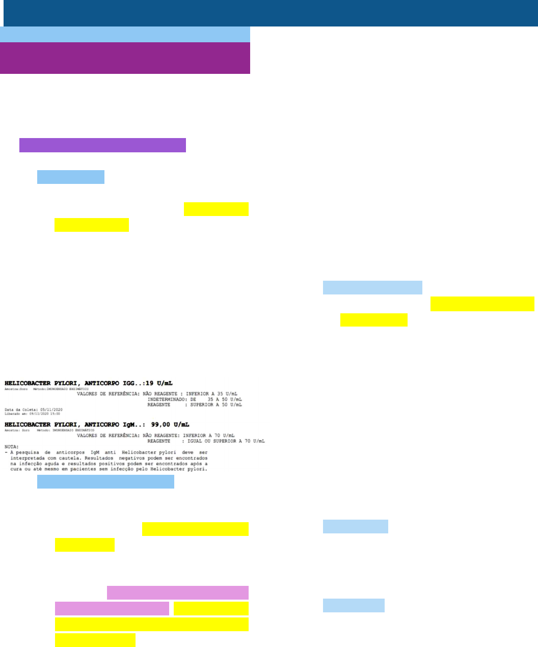 SOI LAB IV Emilly Lorena Queiroz Amaral – Medicina/4º Período AULA 1 TESTE DA UREASE E SOROLOGIA H. PYLORI / FARMACO: ANTIÁCIDOS / DROGAS ANTI-H. PYLORI. O estômago humano é o único reservatório reconhecido dessa bactéria. A aquisição da infecção ocorre principalmente durante a infância. Diagnóstico laboratorial de Helicobacter pylori: TESTES NÃO INVASIVOS: Testes sorológicos: A pesquisa de anticorpos anti-H. pylori no soro pode ser realizada por vários métodos, mas a técnica de ELISA é a preferida, graças à sua simplicidade e baixo custo. A detecção desses anticorpos não significa a presença de uma infecção ativa por H. pylori. Após a erradicação da bactéria, os indivíduos podem manter os anticorpos anti-H. pylori durante vários anos, mesmo não estando infectados. É um exame muito útil nos estudos epidemiológicos para avaliar a prevalência dessa infecção em grupos populacionais. Testes respiratórios com 13C ou 14C: O teste respiratório com ureia contendo carbono marcado (14C, fracamente radioativo ou 13C, isótopo estável não radioativo) é considerado “padrão-ouro” para diagnóstico e, especialmente, para o controle da erradicação do H. pylori. A enzima urease, produzida em grande quantidade pelo H. pylori, é responsável pelo desdobramento da ureia marcada com 13C ou 14C, liberando CO2, que é rapidamente absorvido pela mucosa gástrica e exalado pelos pulmões. O CO2 marcado é detectado no ar expirado por espectrômetro de massa ou por equipamentos de menor custo, como os analisadores por infravermelho; A sensibilidade e especificidade: 95%, mas requer pessoal treinado para colher adequadamente pelo menos duas amostras do ar expirado: uma antes da ingestão de ureia, e outra, 20 minutos depois. O teste respiratório com 14C, por ser radioativo, não deve ser utilizado em crianças e mulheres grávidas. Na rotina clínica, o teste com ureia 13C é o preferido, porque não tem contraindicação, sendo realizado em adultos e crianças acima de 6 anos; Os inibidores de acidez do estômago e os antimicrobianos podem ocasionar resultados falso- negativos, devendo ser suspensos, no mínimo, 2 e 4 semanas, respectivamente, antes da realização do teste (III Consenso Brasileiro do H. pylori). Pesquisa de antígeno fecal: Esses testes detectam a presença de antígenos do H. pylori nas fezes. Atualmente, é recomendável realizar esse teste com anticorpo monoclonal, que mostrou resultados consistentes em todos os centros de pesquisa. Está indicado para diagnóstico e controle da erradicação do H. pylori em adultos e crianças, com especificidade em 97,5% e sensibilidade de 94,7%. Os inibidores de acidez do estômago e os antimicrobianos podem ocasionar resultados falso- negativos, devendo ser suspensos, no mínimo, 2 e 4 semanas, respectivamente, antes da realização do teste (III Consenso Brasileiro do H. pylori). TESTES INVASIVOS: Exame histológico: O exame histológico permite a identificação da bactéria e, também, avaliar o tipo e a intensidade da infamação da mucosa gástrica, a presença ou não de atrofia, metaplasia ou displasia. Teste da urease: Haja vista a facilidade, rapidez, baixo custo e eficiência, o teste da urease pode ser considerado o recurso mais importante dos endoscopistas para o diagnóstico da presença do H. pylori, na prática diária. Patologia Clínica e Farmacologia SOI LAB IV Emilly Lorena Queiroz Amaral – Medicina/4º Período O fragmento da mucosa gástrica é colocado em frasco contendo ureia e vermelho fenol como indicador de pH. Graças à grande produção da enzima urease pelo H. pylori, a ureia é desdobrada em CO2 e amônia, aumentando o pH e mudando a cor da solução, de amarela para avermelhada. O teste é considerado positivo quando a mudança de cor aparece em até 24 horas. Cultura: Permite a correta identificação da bactéria. É caro, demorado e necessita de condições especiais para a sua realização. Os fragmentos de biópsia devem ser inoculados imediatamente em meio apropriado e mantidos até o máximo de 5 horas a 4°C. As amostras são homogeneizadas e semeadas em placas contendo meio de cultura. Tratamento: Antibioticoterapia: claritromicina (500mg) + amoxicilina (1g) + IBP em dose padrão, por 14 dias; Claritromicina: é um representante dos macrolídeos e inibe a síntese de proteínas bacterianas. Amoxicilina: é um tipo de penicilina (aminopenicilina) e do tipo beta-lactâmico e inibe a síntese de parede celular bacteriana. AULA 2 PROPEDÊUTICA DAS DOENÇAS INFLAMATÓRIAS INTESTINAIS E ALERGIAS ALIMENTARES (TESTE DE TOLERÂNCIA A LACTOSE, INTOLERÂNCIA AO GLÚTEN, EXAMES PARA DOENÇA CELÍACA) Para confirmar o diagnóstico, pode ser solicitado alguns exames: análise sanguíneas, fecais, endoscopia. No caso da intolerância à lactose, por exemplo, tem-se os seguintes testes: O teste de medida do pH e de substâncias redutoras nas fezes: considera-se sugestivo de intolerância à lactose o achado de pH ≤ 5 e a presença de substâncias redutoras ≥ 0,5 g%. O pH fecal é o primeiro a se alterar, sendo mais sensível que a presença de substâncias redutoras nas fezes. O teste de absorção de lactose pela sobrecarga oral: o paciente faz ingestão de uma quantidade determinada de lactose e o registro posterior do incremento da glicemia. Se surgirem sinais e sintomas até 48 horas após a ingestão da solução-teste, pode-se falar em intolerância à lactose. Existe também a dosagem basal – quando o paciente toma a glicose, em cima dessa glicemia basal, a glicemia deve subir pelo menos 20, caso não suba, há alta probabilidade de ser intolerância à lactose Teste do H2 expirado: cerca de 20% do H2 formado durante a fermentação bacteriana no nível do cólon é absorvido e eliminado pelos pulmões, podendo ser medido por cromatografia gasosa. A técnica consiste na administração de lactose nas doses recomendadas e colhe- se o ar expirado em uma seringa 