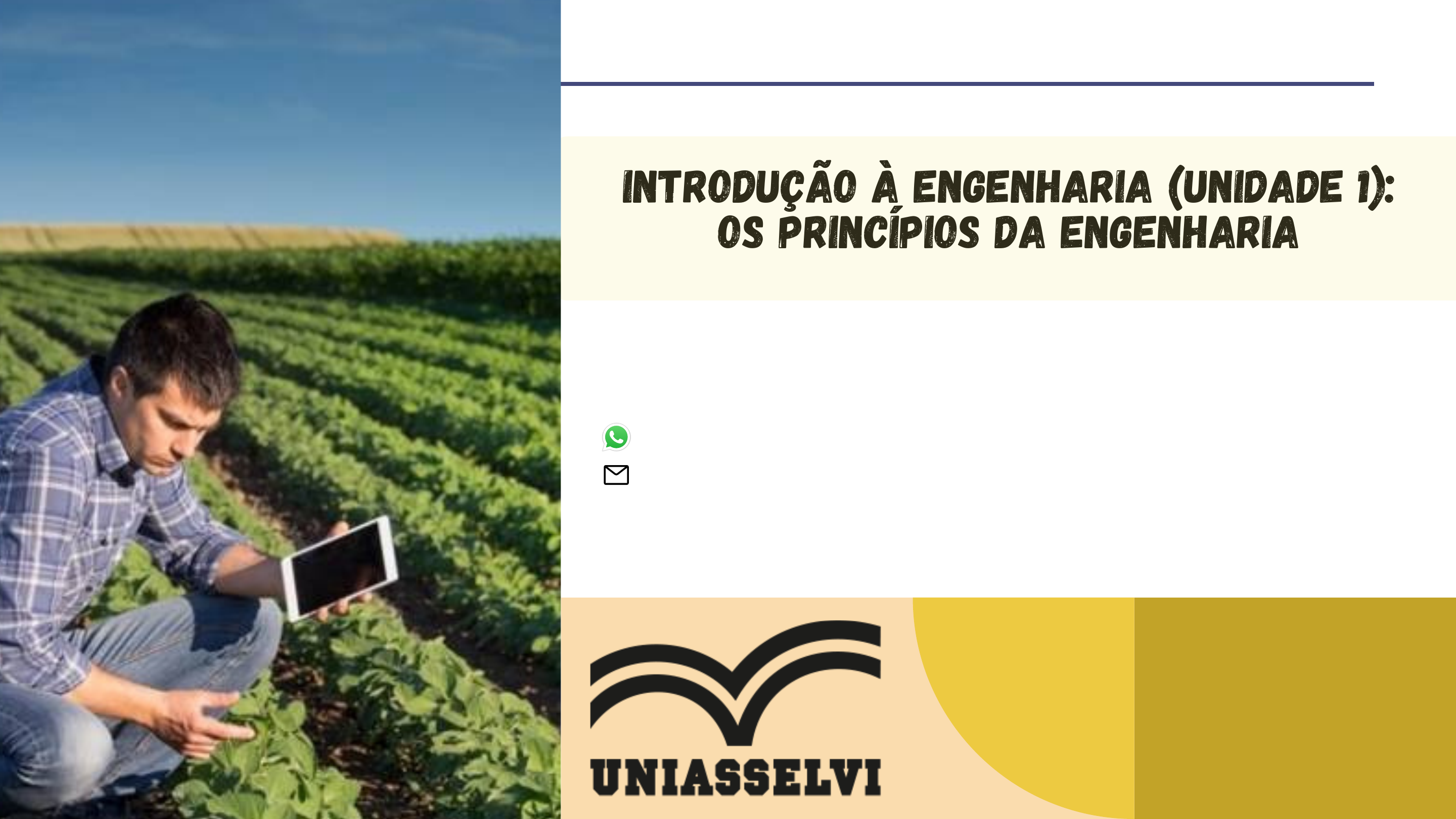 introdução à engenharia (unidade 1): os princípios da engenharia Tutor: Romário Guimarães Verçosa de Araújo Engenheiro Agrônomo, Mestre em Proteção de Plantas, Doutorando em Produção Vegetal (82) - 98118-3252 romariorgva@hotmail.com Tópico 1 - A História da Engenharia Segundo Cocian (2009), os engenheiros são basicamente solucionadores de problemas, são profissionais que pesquisam para encontrar a maneira mais fácil, mais rápida e menos onerosa de utilizar as forças da natureza e os materiais para enfrentar os desafios mais complexos. Tópico 1 - A História da Engenharia Ao longo do tempo, o conceito do que é engenharia sofreu modificações até estabelecer-se em uma área do conhecimento que aplica métodos destinados à utilização de recursos naturais para criar elementos que facilitem a vida da sociedade. Conforme ocorreu a evolução de técnicas ao longo do tempo e através do conhecimento empírico e científico, a engenharia tornou-se fundamental para o desenvolvimento humano. Tópico 1 - A História da Engenharia A Engenharia ao longo do Tempo: A história da humanidade ocorre de forma contínua, mas periodicamente ocorrem algumas transformações que mudam o mundo. A maioria dessas mudanças ocorre através dos avanços científicos e são marcos na história da engenharia. Desde os primórdios, a engenharia esteve presente na história. Inicialmente, os homens da era paleolítica adaptaram ferramentas que lhes auxiliassem na alimentação e criaram o conceito de habitação ao utilizarem as cavernas para se protegerem das intempéries. Tópico 1 - A História da Engenharia A Engenharia ao longo do Tempo: Foi na Idade do Bronze que surgiram objetos para a caça mais elaborados, como arpões, lanças, arco e flecha. Conforme as necessidades humanas iam se moldando aos novos estilos de vida, novas descobertas foram feitas, entre elas o uso do metal. Tópico 1 - A História da Engenharia A Engenharia ao longo do Tempo: Um acontecimento marcante na história da engenharia foi quando o homem descobriu que poderia levantar mais peso com a utilização um sistema simples que hoje chamamos de alavanca. Neste mesmo período ocorreu a invenção da roda e da polia. A partir deste momento, o homem começou a aplicar conceitos da mecânica para construir objetos úteis para o desenvolvimento de aldeias, e foi assim que certamente surgiram os primeiros engenheiros. Tópico 1 - A História da Engenharia A Engenharia ao longo do Tempo: Durante a Idade Média, o conhecimento em grande parte ficou restrito ao círculo da Igreja e apresentou poucos progressos. Ainda assim, ocorreram avanços significativos de ferramentas utilizadas na agricultura, principalmente de tração animal. A manufatura se desenvolveu, principalmente, na confecção de tecidos e joias, onde começou a ocorrer uma padronização das técnicas empregadas. Tópico 1 - A História da Engenharia Engenharia Moderna: Desde os primórdios da história, o homem buscou criar e aperfeiçoar ferramentas com o objetivo solucionar problemas e atender as suas necessidades básicas. Durante milhares de anos, a evolução das técnicas foi baseada na prática, na experiência adquirida. Entretanto, é notório que a engenharia como conhecemos surge em meados do século XVIII, através da prática de uma abordagem mais teórica, sistemática, baseada nos conceitos matemáticos, na explicação dos fenômenos físicos, em experimentos em ambientes controlados e na realização de cursos formais de ensino. Tópico 1 - A História da Engenharia Engenharia Moderna: Segundo Telles (1984), a engenharia quando considerada como arte de construir é evidentemente tão antiga quanto o homem, mas quando considerada como um conjunto organizado de conhecimentos com base científica aplicado à construção em geral, é relativamente recente, podendo-se dizer que data do século XVIII. Para que essa transformação ocorresse, grandes contribuições científicas vieram dos estudos de Leonardo da Vinci (1452-1519), Galileu Galilei (1564-1642), René Descartes (1596-1650), Isaac Newton (1643-1727). Tópico 1 - A História da Engenharia Engenharia Moderna: Dentre as várias descobertas que impulsionaram a engenharia moderna, a criação da máquina a vapor, por James Watt, em (1782), cujo modelo você pode observar na Figura 3 a seguir, para ser utilizada nas fábricas de tecelagem em conjunto com o tear mecânico, foi um dos grandes responsáveis pela Revolução Industrial (VALÉRIO; BAZZO, 2006). Tópico 1 - A História da Engenharia Engenharia Moderna: Segundo Bazzo e Pereira (2011), outro grande avanço no processo de industrialização foi a utilização do motor elétrico como fonte de energia, que substituiu os sistemas de aproveitamento da energia diretamente da natureza, como as rodas d'água. O primeiro motor elétrico a ser usado com sucesso na indústria foi descoberto em 1869 por Zénobe Gramme (1826-1901) e ficou conhecido como a “Máquina de Gramme”, que quando ligada a uma corrente elétrica, produzia energia motora Tópico 1 - A História da Engenharia Engenharia Atual: Uma das maiores transformações da engenharia foi o uso do computador. Essa ferramenta que hoje estamos tão habituados a manusear, significou um dos maiores avanços científicos e tecnológicos que a humanidade já vivenciou. Podemos ver o primeiro modelo de computador eletrônico e digital automático o Eniac (Electronic Numerical Integrator and Computer) de 1946, que pesava 30 toneladas, emprega cerca de 18 mil válvulas e realiza 4.500 cálculos por segundo. Tópico 1 - A História da Engenharia Principais Invenções da Engenharia no Século XX: Durante o século XX, a expansão econômica e a utilização de novas tecnologias possibilitaram a criação de muitas invenções que transformaram o mundo. Durante as últimas décadas, essas invenções foram aperfeiçoadas e continuam utilizadas em todo o mundo. Tópico 1 - A História da En