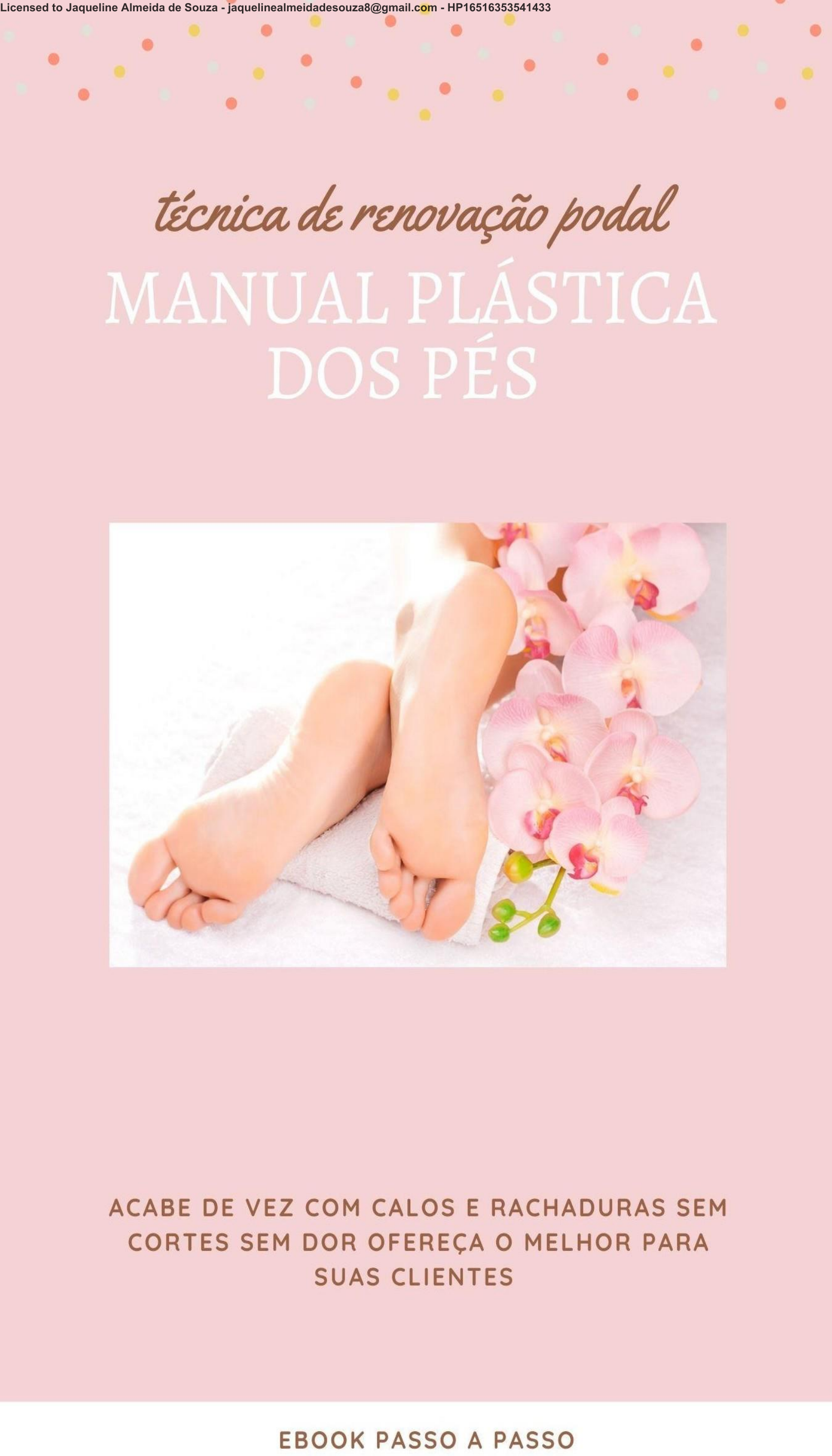 Licensed to Jaqueline Almeida de Souza - jaquelinealmeidadesouza8@gmail.com - HP16516353541433 MANUAL Plástica dos Pés Todos direitos reservados Nenhuma parte desse material deve ser compartilhada COM TERCEIROS sem que haja autorização prévia dos criadores. DIREITOS AUTORAIS RESERVADOS A MILENA DE SOUZA Licensed to Jaqueline Almeida de Souza - jaquelinealmeidadesouza8@gmail.com - HP16516353541433 SUMÁRIO 1. Introdução; -Conhecendo a técnica plastica dos pés -Para quem é indicado esse Procedimento 2. lista de materiais; 3. Contra indicação do Procedimento; 4.Biossegurança; 5. Passo a Passo; -Aprenda a identificar os graus de calosidade -Aplicação da tecnica passo a passo 6. Efeito rebote 7. Bônus 1 – Ficha Ananmesia Clique no link azul para assistir as aulas Aula 1 Aula 2 Aula 3 Aula 4 Aula 5 Aula 6 Aula 7 Aula 8 Aula - lista de materiais Licensed to Jaqueline Almeida de Souza - jaquelinealmeidadesouza8@gmail.com - HP16516353541433 https://youtu.be/SN6I6USK0y4 https://youtu.be/FF5co6aiLs0 https://youtu.be/WP90Ix7QrYU https://youtu.be/4a5m6tWD0do https://youtu.be/n-r7Ht9Bux8 https://youtu.be/CcQ2QGoSwgo https://youtu.be/BL4smJhCK2k https://youtu.be/AS40PIgSqa0 https://youtu.be/SFXCmWKGQDw Introdução Você é uma Profissional que está em busca de algo inovador para oferece para suas clientes, então posso te dizer que está no caminho certo, com esse procedimento de baixo valor de investimento você irá proporcionar para melhoria na auto estima , alivio de dores um resultado realmente satisfatório na maioria dos casos já na primeira aplicação, deixando os pés mais macios eliminando fissuras, Rachaduras e toda a pele ressecada. A técnica plastica nos pés consiste na aplicação de um emoliente liquido aplicado nas areas mais grossas dos pés , esse produto em ação com a pele e tranformado em um gel , sendo feito a raspagem eliminando toda a pele morta .Dando assim um aspcto de macies e Revitalização dos pés . Mesmo em um caso de calosidade mais intensas já se pode ter um resultado bem significante, porém muitas vezes tendo quer ser feito mais de uma seção para chegar ao aspecto natural da pele. Para quem é indicado esse procedimento Pessoas com os pés com rachaduras, ressecamento, excesso de calosidade, prevenção de tais problemas, embelezamento dos pés, seja qual for o problema do seu cliente, será motivação suficiente para você oferecer um serviço de plastica dos Pés, Todos esses problemas além de trazer uma perturbação estética para o cliente, pode causar também muita dores nos pés, para quem já vem trazendo esse problema de forma crônica. Licensed to Jaqueline Almeida de Souza - jaquelinealmeidadesouza8@gmail.com - HP16516353541433 IMAGEM ILUSTRATIVA DOS EMOLIENTES z ALCOOL 70% ( BORRIFADOR) ALGODÃO ESPÁTULA SEM CORTES INOX BOTINHA PLÁSTICA CREME HIDRATANTE ESFOLIANTE LIXA PARA OS PÉS MATERIAIS DE EPI (LUVAS , MASCARA, TOCAS E AVENTAL SE NECESSARIO ÓCULOS) Imagem ilustrativa do emoliente ( amolecedor) Licensed to Jaqueline Almeida de Souza - jaquelinealmeidadesouza8@gmail.com - HP16516353541433 Contra indicações Micoses nos pés – Não pode Micose de pele é um tipo de doença causada pela presença de fungos na pele, que gera coceira, vermelhidão e descamação. Psoríase – Não pode A psoríase é uma doença inflamatória da pele, autoimune, não contagiosa e sem cura. É bastante comum e se caracteriza por lesões avermelhadas e descamativa . Liquenificação – Não pode Liquenificação é uma alteração na espessura da pele que a torna espessa e rígida. As características mais comuns na liquenificação são espessamento, endurecimento da pele, sulcos, saliências e alterações na coloração Licensed to Jaqueline Almeida de Souza - jaquelinealmeidadesouza8@gmail.com - HP16516353541433 Dúvidas comuns: Gestantes, lactantes, portadores de diabetes, portadores de ácido úrico, tireoidíssimos pode aplicar o Emoliente? Sim, desde que não tenham as patologias contra- indicadas acima Disidrose – Não pode A disidrose, também conhecido por eczema disidrótico, caracteriza-se pelo aparecimento de pequenas bolhas preenchidas de líquido, que geralmente aparecem nas mãos e nos pés e que causamcoceira intensa, podendo durar até3 semanas Dermatite – Nãopode É uma condição comum que não é contagiosa, reação inflamatória da pele, adermatite aguda caracteriza-sepor coceira, vermelhidão, inchaço e aparecimento de vesículas e a dermatite crônica caracteriza-se por coceira, ressecamento, espessamento e rachaduras na pele. Lúpus – Não pode Lúpus é uma Doença do sistema imunológico, com sintomas diferentes em cadalocal do corpo,não é contagioso e também não é um tipo de câncer. Trata- se de uma doença autoimune, ou seja, o sistema imunológico do paciente ataca o seu próprio organismo. Embora não tenha um estudo certo sobre a contra- indicação em pessoas com lúpus o ideal é indicar um podólogo a seu ou sua cliente. Licensed to Jaqueline Almeida de Souza - jaquelinealmeidadesouza8@gmail.com - HP16516353541433 Biossegurança Assunto muito negligenciado, porém de muita importância. Assegurar sua saúde e do seu cliente, sempre será um missão mais que possível. Utilize sempre EPI's (Equipamento de Segurança Individual) como luvas descartáveis, máscaras, toucas, materiais esterilizados, toalhas limpas, protetores de maca, etc. Fique atenta sempre também na validade de seus produtos, use sempre produtos autorizados pela ANVISA e evite futuros constrangimento. Licensed to Jaqueline Almeida de Souza - jaquelinealmeidadesouza8@gmail.com - HP16516353541433 Graus de calosidade Aqui vamos aprender a identificar cada grau de calosidade para assim aplicar a técnica de acordo com cada grau ,levando sempre emconsideração o tempo de ação indicado e o retorno da proxima seção . Grau1 – Os pés apresentam apenas ressecamento e sem fissuras, tempo de ação do produto de 10 a 15 minu
