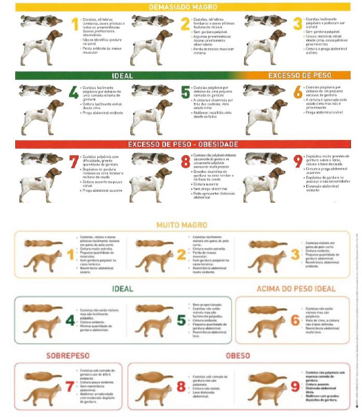 Obesidade e protocolos de emagrecimento: Avaliação de score: ➢ Costelas ➢ Pelve ➢ Abaulamento abdominal (cintura). Avaliação de atividade: ➢ Pouca; ➢ Média; ➢ Bastante. Não sendo a principal forma de emagrecimento. Déficit calórico: o animal não deve consumir mais do que ele gasta. EX.: Cão que o peso ideal é de 10kg e ele está com 20kg, qual é o protocolo a se feito? Score corporal 9, diminuindo a quantidade de alimento gradativamente, Calculando de forma correta para que não ocorra deficiência nutricional. Calcula encima do peso que ele tem e vai diminuindo. Predisposição: Fatores endógenos: o Idade (idosos, jovens); o Sexo (fêmea é mais pré disposta a engordar); o Estado reprodutivo (castrado ou não); o Anormalidades endócrinas; o Predisposição genética (seleção a longo prazo, um bom exemplo é os suínos); Fatores exógenos: o Nível de atividade física; o Influências externas de dieta (Vó e criança, porque são essas pessoas que fogem do protocolo alimentar); o Composição e palatabilidade da dieta (alimentos diet, tem mais fibras, mas tem a mesma quantidade energética, normalmente é mais interessante dar depois para manter o peso e não para o emagrecimento) o Ambiente em que vive, estilo de vida; Definindo sobrepeso e obesidade: o 10 – 20%: sobrepeso o 20 – 30%: obesidade o Acima de 30%: obesidade mórbida. Depende do peso ideal para calcular; Sempre deve-se calcular de acordo cm o escore corporal. Cães: escore 6 e 7, sobre peso. Escore 8 e 9, obeso. Comorbidades associadas: Excesso de tecido adiposo: o Síntese de citocinas o TNF-α (fator de necrose tumoral) o IL-6 (interleucina). o IFN-γ (interferon). o Proteína C-reativa Faz com que o organismo viva em constante processo inflamatório, podendo geral processo dermatológico, e deposição de citocinas em articulações, dificuldade em ciclos reprodutivo (gestação, parto e estro). Problemas como: ✓ Aumenta o risco em cirurgias; ✓ Redução da expectativa de vida; ✓ Comprometimento do sistema imunológico; ✓ Estresse térmico; ✓ Diabetes; ✓ Distúrbios gastrointestinais; ✓ Problemas respiratórios; ✓ Problemas no trato urinário; ✓ Problemas reprodutivos; ✓ Problemas articulares; ✓ Problemas dermatológicos; ✓ Neoplasias e câncer. Recomendações nutricionais: Restrição da ingestão energética diária: o Formulação evitar carências nutricionais: aminoácidos, minerais e vitaminas. Perda de gordura corporal: o Perda de massa muscular deve ser mínima: preservação da massa muscular é importante para manter a taxa metabólica dos animais e prevenir novo ganho de peso após o término do tratamento. Fibras: o Diluição energética. o Saciedade. Volume alto e densidade calórica baixa. Proteínas: o Alta proteína e redução de gordura: manutenção da massa magra. o 40% Microbiota intestinal: No animal obeso ocorre a mudança da distribuição das bactérias (disbiose) ocorre o acumulo no lúmen que vão para a circulação; Ocorre o acumulo de lipopolissacarideos na circulação que vão para outros locais, como músculos, ficado e tecido adiposo. Se depositam em receptores principalmente o da insulina (causando problemas como a resistência a insulina em diabéticos) insulina resistente normalmente são obesos. Controle da obesidade o Exame clínico; o Determinação do peso ideal; o Restrição energética; o Tempo de tratamento; o Dietas para redução de peso; o Avaliação periódica do animal; o Dietas de controle e manutenção; o Esclarecimento ao tutor (do tempo de tratamento e importância de seguir corretamente as recomendações). Programas de perda de peso: Calcular o peso meta (peso que quer chegar): o Estabelecer perda de 15 – 20% (peso que quer chegar) Se caso o animal está com sobre peso e não chega a 15% acima do peso, deve se calcular de acordo com a porcentagem de que ele está aumentado. Estimar a perda de peso médio semanal e o tempo necessário para alcançar o peso meta o 1 – 2% para cães o 0,5 – 1% para gatos Regra de 3 20kg – 100 X - 2 X = 400 grama por semana Definir a ingestão calórica para perda de peso do animal Atender 60 das necessidades energéticas de manutenção estimadas para o peso meta do animal, tendo como base as seguintes fórmulas: Cães: 95 x (peso atual) 0,75 kcal dia Gatos: 95 x (peso atual)0,67 kcal/dia Ou Podemos calcular o peso meta: PM= Peso atual – 20% = Kg Peso metabólico = (peso meta)0,75 ou 0,67 = PM NEM = Peso metabólico X 95 = NER Kcal/dia Consumo = NEM = g/dia Kcal do alimento Restrição calórica para perder peso: Definir o alimento a ser oferecido Alimento seco para animais em manutenção** (tem alta densidade calórica) 3.400 Kcal/Kg mais o menos. o Alimento comercial para perdas de peso o Alimento caseiro balanceado 1.200 Kcal/Kg mais o menos o Observar a energia metabolizável do alimento (quanto menor a energia metabolizavel melhor para a perda de peso). o Petiscos devem ser incluídos na dieta até 10% no cálculos, se caso o animal for ingerir petiscos.