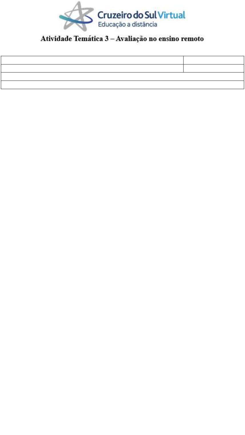 Nome Completo: Ivany Aparecida Araújo Santos RGM: 21111871 Instituição: Cruzeiro do Sul (UNICID) Data: 17/09/2021 Curso: Pedagogia Disciplina: Estágio Curricular Supervisionado em Gestão Educacional Durante o ensino remoto foi muito difícil avaliar o aluno, uma vez que muitos alunos encontraram dificuldades em acessar as atividades, pois muitos deles não tem celular, ou seja, não tem acesso à internet por ser alunos de linha de baixa renda que vivem apenas com o Bolsa Família ou com aposentadoria dos avôs. É possível ressaltar que não foi e não está sendo fácil lidar com o novo. Mesmo nas aulas a distância, a etapa de avaliação permanece sendo um processo transversal às práticas educacionais. Assim, a atribuição de notas é resultado de um processo que engloba todo o ciclo de aprendizagem do aluno. Desse modo, prevalece a determinação da Lei de Diretrizes e Bases da Educação Nacional (LDB): no ensino remoto, a checagem de rendimento escolar também deve ser fruto de uma avaliação contínua e cumulativa da performance dos estudantes. Então, veio à tona o Ensino Remoto de Emergência (ERE – que é diferente do Ensino a Distância, ou EaD), tornando-se a principal forma de as instituições escolares continuarem a cumprir seu papel de educar os estudantes. Neste contexto, os desafios e dificuldades enfrentados diariamente por professores, alunos e famílias, são inúmeros. Nenhum desses agentes educativos esperava utilizar o Ensino Remoto de Emergência em seu cotidiano. Professores da Educação Básica não são experts em darem aulas gravadas ou ao vivo via plataformas on-line; alunos não estão acostumados a assistirem videoaulas longas; pais não são professores e, portanto, não possuem conhecimento pedagógico para fazer o acompanhamento do processo de ensino-aprendizagem no ensino remoto. Esses são alguns dos muitos desafios enfrentados pela comunidade escolar quanto ao novo formato (provisório e necessário) na Educação Básica. Na tentativa de propor alternativas e possibilidades, relacionamos esses desafios a algumas Competências Gerais da Base Nacional Comum Curricular (BNCC), no desejo de ser um lampejo incandescente em meio à essa crise. O uso de diversas plataformas tecnológicas tem sido o caminho utilizado por professores e alunos para efetivar a transmissão de conhecimento no processo de ensino-aprendizagem. Ou seja, professores e alunos trabalham juntos e de forma remota pela internet, por meio de ambientes virtuais de aprendizagem (AVA ou LMS, na sigla em inglês).