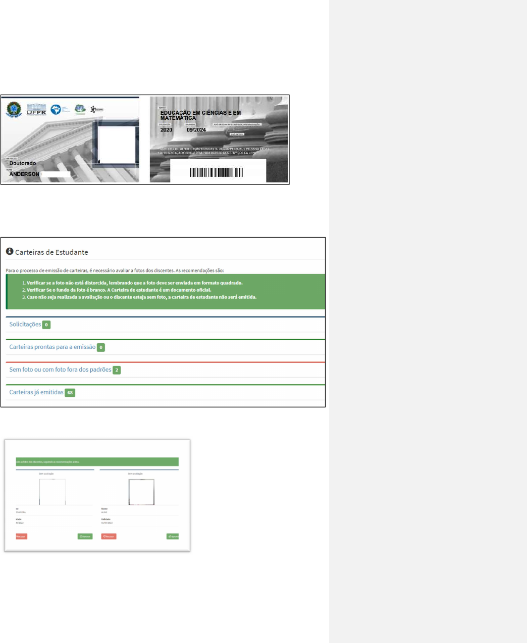 Manual do SIGA-UFPR – Programas de Pós-graduação Stricto Sensu (EM EDIÇÃO) Coordenadoria dos Programas de Pós-Graduação Stricto Sensu - CPGSS 87 Carteiras de Estudante A carteira de estudante identifica o aluno da pós-graduação e permite acesso aos diversos serviços da UFPR, como restaurantes, laboratórios, transporte, etc. O discente, em seu portal de usuário, deve anexar foto no cadastro. Essa ação surgirá para a secretaria no quadro Solicitações no menu Secretaria>carteira de estudante, conforme quadro abaixo: Clique em Solicitações para apresentar os documentos já solicitados: Verifique se a foto está nos padrões e use os botões Aprovar ou Recusar, após, confirme a operação: Manual do SIGA-UFPR – Programas de Pós-graduação Stricto Sensu (EM EDIÇÃO) Coordenadoria dos Programas de Pós-Graduação Stricto Sensu - CPGSS 88 Ao aprovar a solicitação, ela irá para o quadro das Carteiras prontas para emissão. Ao recusar, irá para quadro Sem foto ou com foto fora dos padrões. Neste caso, o aluno deverá inserir nova foto em seu cadastro, quando voltará para o campo Solicitações para nova avaliação da secretaria. Quando as carteiras estiverem prontas para emissão envie um e-mail para carteiras.siga@ufpr.br solicitando à PRPPG que emita os documentos. O secretário ou coordenador do PPG deverá retirar os documentos na PRPPG ou solicitar que lhe enviem via malote. As carteiras deverão ser entregues aos alunos pela secretaria do PPG. Quadro de avisos Esta função permite ao PPG aos seus discentes ou docentes. O aviso é visualizado pelos destinatários na tela inicial ao fazerem login no SIGA. É visualizado pelo período estipulado e é criado na opção “Meus avisos”. Meus Avisos Mostra os avisos criados pelo PPG. Clique no botão + para ver os detalhes do aviso criado.