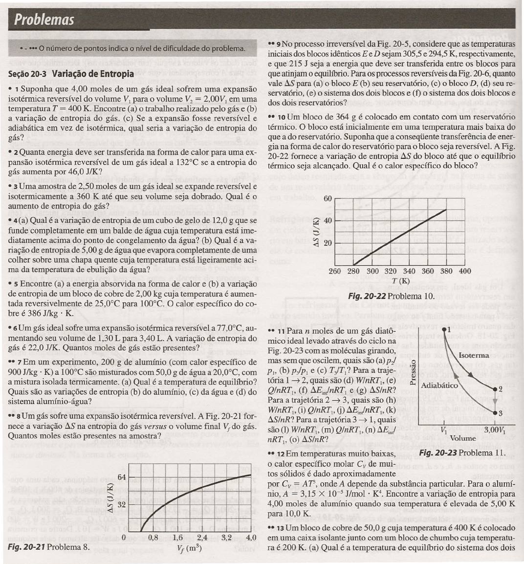 Problemas 0_ 000 o número de pontos indica o nível de dificuldade do problema. Seção20-3 Variação de Entropia o 1 Suponha que 4,00 moles de um gás ideal sofrem uma expansão isotérmica reversível do volume VI para o volume V2 = 2,00VI em uma temperatura T = 400 K. Encontre (a) o trabalho realizado pelo gás e (b) a variação de entropia do gás. (c) Se a expansão fosse reversível e adiabática em vez de isotérmica, qual seria a variação de entropia do gás? ·2 Quanta energia deve ser transferida na forma de calor para uma ex- pansão isotérrniea reversível de um gás ideal a 132°C se a entropia do gás aumenta por 46,0 J/K? • 3Uma amostra de 2,50 moles de um gás ideal se expande reversível e isotermicamente a 360 K até que seu volume seja dobrado. Qual é o aumento de entropia do gás? • 4 (a) Qual é a variação de entropia de um cubo de gelo de 12,0 g que se funde completamente em um balde de água cuja temperatura está ime- diatamente acima do ponto de congelamento da água? (b) Qual é a va- riação de entropia de 5,00 g de água que evapora completamente de uma colher sobre uma chapa quente cuja temperatura está ligeiramente aci- ma da temperatura de ebulição da água? • 5 Encontre (a) a energia absorvida na forma de calor e (b) a variação de entropia de um bloco de cobre de 2,00 kg cuja temperatura é aumen- tada reversivelmente de 25,0°C para 100°C. O calor específico do co- bre é 386 Jlkg . K. • 6Um gás ideal sofre uma expansão isotérmica reversível a 77,O°C, au- mentando seu volume de 1,30 L para 3,40 L. A variação de entropia do gás é 22,0 J/K. Quantos moles de gás estão presentes? •• 7 Em um experimento, 200 g de alumínio (com calor específico de 900 Jlkg . K) a 100°C são misturados com 50,0 g de água a 20,0°C, com a mistura isolada termicamente. (a) Qual é a temperatura de equilíbrio? Quais são as variações de entropia (b) do alumínio, (c) da água e (d) do sistema alumínio-água? ··8Um gás sofre uma expansão isotérmica reversível. A Fig. 20-21 for- nece a variação ó.S na entropia do gás versus o volume final VI do gás. Quantos moles estão presentes na amostra? ......•1-----./ ",. /' I 64 ~<,-, ;;; 32 <I o 0,8 Fig. 20-21 Problema 8. •• 9No processo irreversível da Fig. 20-5, considere que as temperaturas iniciais dos blocos idênticos E e D sejam 305,5 e 294,5 K, respectivamente, e que 215 J seja a energia que deve ser transferida entre os blocos para que atinjam o equilíbrio. Para os processos reversíveis da Fig. 20-6, quanto vale ó.S para (a) o bloco E (b) seu reservatório, (c) o bloco D, (d) seu re- servatório, (e) o sistema dos dois blocos e (f) o sistema dos dois blocos e dos dois reservatórios? •• 10 Um bloco de 364 g é colocado em contato com um reservatório térmico. O bloco está inicialmente em uma temperatura mais baixa do que a do reservatório. Suponha que a conseqüente transferência de ener- gia na forma de calor do reservatório para o bloco seja reversível. A Fig. 20-22 fornece a variação de entropia IlS do bloco até que o equilíbrio térmico seja alcançado. Qual é o calor específico do bloco? 60 g- 40 2 ~ 20 v V ./ ./ ./ 260 280 300 320 340 360 380 400 T(K) Fig. 20-22 Problema 10. •• 11 Para n moles de um gás diatô- rnico ideal levado através do ciclo na Fig. 20-23 com as moléculas girando, mas sem que oscilem, quais são (a) pJ PI, (b) P/PI e (c) TJTI? Para a traje- tória 1 -t 2, quais são (d) W/nRTI> (e) Q/nRTI> (f) M;./nRTI e (g) ó.S/nR? Para a trajetória 2 -t 3, quais são (h) W/nRTI, (i) Q/nRTt> U) M;n/nRTI, (k) ó.S/nR? Para a trajetória 3 -t 1, quais são (1)W/nRTI, (m) Q/nRTI, (n) M;n/ nRTI, (o) IlS/nR? 3 2 "í 3,00"í Volume •• 12 Em temperaturas muito baixas, Fig. 20-23 Problema 11. o calor específico molar Cy de mui- tos sólidos é dado aproximadamente por Cy = AP, onde A depende da substância particular. Para o alumí- nio, A = 3,15 X 10-5 J/mol . K4. Encontre a variação de entropia para 4,00 moles de alumínio quando sua temperatura é elevada de 5,00 K para 10,0 K. •• 13 Um bloco de cobre de 50,0 g cuja temperatura é 400 K é colocado 4,0 em uma caixa isolante junto com um bloco de chumbo cuja temperatu- ra é 200 K. (a) Qual é a temperatura de equilíbrio do sistema dos dois Ismael Oval Ismael Oval Ismael Oval blocos? (b) Qual é a variação na energia interna do sistema entre o es- tado inicial e o estado de equilíbrio? (c) Qual é a variação na entropia do sistema? (Veja a Tabela 18-3.) ··14Uma amostra de 2,0 moles de um gás monoatômico ideal sofre o pro- cesso reversível mostrado na Fig. 20- 24. (a) Quanta energia é absorvida na forma de calor pelo gás? (b) Qual é a variação na energia interna do gás ? (c) Qual o trabalho realizado pelo gás? •• lS Um cubo de gelo de 10 g a -10°C é colocado em um lago cuja temperatura é 15°C. Calcule a varia- ção na entropia do sistema cubo-lago quando o cubo de gelo atingir o equi- líbrio térmico com o lago. O calor específico do gelo é 2220 J!kg . K (Sugestão: O gelo afetará a temperatura do lago?) •• 16 Um cubo de gelo com 8,0 g a -10°C é colocado em uma garrafa térmica contendo 100 em' de água a 20°C. De quanto terá variado a entropia do sistema cubo-água quando o equilíbrio for alcançado? O ca- lor específico do gelo é 2220 J!kg . K. g ~ 400 'cij ~ 200 E ~ 51015 Entropia (J/K) Fig. 20-24 Problema 14. •• 17 Uma mistura de 1773 g de água e 227 g de gelo encontra-se em um estado inicial de equilíbrio a 0,000°c. A mistura é, então, através de um processo reversível, levada a um segundo estado de equilíbrio onde a razão água-gelo, em massa, é 1,00:1,00 a 0,000°c. (a) Calcule a variação de entropia do sistema durante este processo. (O calor de fu- são da água é 333 kJ!kg.) (b) O sistema retoma então ao estado de equi- líbrio inicial através de um processo irreversível (digamos, usando um bico de Bunsen)