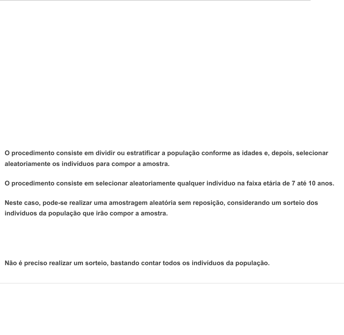 19/04/2023, 20:07 Comentários https://sereduc.blackboard.com/ultra/courses/_159366_1/grades/assessment/_7634884_1/overview/attempt/_26157177_1/review/inline-feedback… 1/6 Conteúdo do exercício Ocultar opções de resposta Pergunta 1 1 / 1 Uma pesquisa, que será realizada em uma escola, com objetivo de avaliar a coordenação motora das crianças com idade de 7 até 10 anos, optou pelo procedimento de amostragem sistemática. Como deve ser o procedimento para realização da amostragem sistemática? O procedimento consiste em dividir ou estratificar a população conforme as idades e, depois, selecionar aleatoriamente os indivíduos para compor a amostra. O procedimento consiste em selecionar aleatoriamente qualquer indivíduo na faixa etária de 7 até 10 anos. Neste caso, pode-se realizar uma amostragem aleatória sem reposição, considerando um sorteio dos indivíduos da população que irão compor a amostra. Resposta correta O procedimento consiste em partir de uma listagem de nomes e selecionar uma ordem k de indivíduos, depois, a cada ordem k, seleciona-se o indivíduo para compor a amostra. Não é preciso realizar um sorteio, bastando contar todos os indivíduos da população. Pergunta 2 1 / 1 Antes de realizar uma apresentação dos dados no formato de tabelas e gráfico, é necessário fazer a distribuição de frequência dos dados. Como pode ser feita a distribuição de frequência? 19/04/2023, 20:07 Comentários https://sereduc.blackboard.com/ultra/courses/_159366_1/grades/assessment/_7634884_1/overview/attempt/_26157177_1/review/inline-feedback… 2/6 Ocultar opções de resposta Ocultar opções de resposta Resposta correta A distribuição de frequência é uma forma de contagem e agrupamento dos dados em classes, intervalos e categorias. Não é preciso fazer a distribuição de frequência para se ter uma boa visualização no formato de tabelas ou gráficos. A distribuição de frequência é o cálculo da probabilidade de encontrar um indivíduo em algumas das classes ou categorias dos dados. Basta analisar os dados brutos sem resumir as informações para não haver perdas de dados. A distribuição de frequência consiste na fase do trabalho estatístico de coleta de dados. Pergunta 3 1 / 1 A prefeitura de uma cidade detectou o aumento de casos de dengue na população. Logo, decidiu-se por fazer uma pesquisa para saber os cuidados tomados pelos moradores. Então, executaram-se os seguintes procedimentos de amostragem: dividiu o mapa da cidade em regiões, depois, cada região em bairros, cada bairro em áreas, as áreas delimitadas por ruas e, em seguida, selecionou-se aleatoriamente algumas casas. Qual é o tipo de amostragem realizado pela prefeitura? Amostragem aleatória com reposição. Amostragem por quotas. Amostragem sistemática. Resposta corretaAmostragem por conglomerado. Amostragem estratificada. Pergunta 4 1 / 1 19/04/2023, 20:07 Comentários https://sereduc.blackboard.com/ultra/courses/_159366_1/grades/assessment/_7634884_1/overview/attempt/_26157177_1/review/inline-feedback… 3/6 Ocultar opções de resposta Ocultar opções de resposta Antes da realização de uma pesquisa, é preciso um planejamento de todas as etapas da pesquisa e um dos componentes do planejamento é o plano amostral. O que podemos dizer a respeito do dele? Em uma pesquisa não é necessário delinear o plano amostral, a pesquisa pode ser realizada da forma mais fácil para o pesquisador. Quando se realiza o planejamento de uma pesquisa, o plano amostra faz parte da análise dos dados. O plano amostral só é importante para pesquisas dos grandes institutos de pesquisa como o caso do IBOPE. O plano amostral é uma forma tratar os dados brutos de uma pesquisa. Resposta corretaO plano amostral consiste em obter uma amostra de uma determinada população. Pergunta 5 1 / 1 Suponha a extração de uma amostra de tamanho n=30, da população de 100 crianças de uma escola infantil, com objetivo de identificar se elas foram vacinadas. O procedimento de amostragem aleatória sem reposição, usado para extração dessa amostra, incialmente, consiste em numerar a lista com identificação das crianças e fazer um sorteio. Como deve ser o sorteio no procedimento de amostragem aleatória sem reposição? Realizar o sorteio e depois selecionar o indivíduo. O indivíduo pode ser selecionado mais de uma vez no momento da composição da amostra. Resposta correta Realizar o sorteio e, depois, selecionar o indivíduo. O indivíduo não pode ser selecionado mais de uma vez no momento da composição da amostra. A realização do sorteio pode atrapalhar a pesquisa, sendo melhor perguntar para as professoras da escola. 19/04/2023, 20:07 Comentários https://sereduc.blackboard.com/ultra/courses/_159366_1/grades/assessment/_7634884_1/overview/attempt/_26157177_1/review/inline-feedback… 4/6 Ocultar opções de resposta Não é necessário realizar o sorteio, pode-se considerar as informações de todas as crianças. Não é preciso realizar um sorteio, bastando escolher as crianças que você deseja pesquisar. Pergunta 6 0 / 1 A maioria das pesquisas tem como propósito fazer generalizações com base nas informações da amostra que foi extraída da população. Suponha que o interesse é saber o valor da renda média das famílias que consomem um determinado produto. Para fazer essa pesquisa, é preciso partir de uma amostra obtida de que forma? Resposta correta O valor da renda média das famílias pode ser estimado partindo da coleta de uma amostra aleatória, realizada por sorteio, permitindo fazer generalização sobre a população. O produto consumido pelas famílias depende da campanha de marketing realizado pela empresa fabricante do produto. Não é necessário usar nenhum procedimento amostragem para estimar o valor da renda média das famílias. Incorreta: O valor da renda média das famílias pode ser obtido por uma pesquisa que considere qualquer tipo de amostra. O valor d