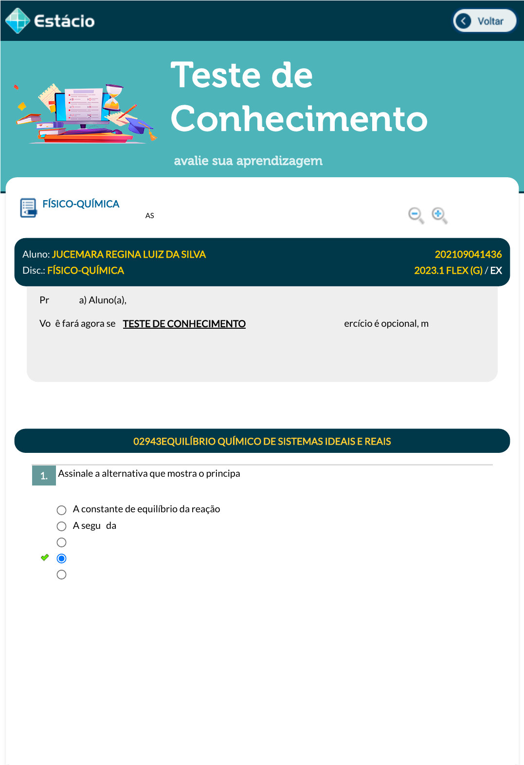 19/04/2023, 21:18 Estácio: Alunos https://simulado.estacio.br/alunos/ 1/6 Teste de Conhecimento avalie sua aprendizagem Assinale a alternativa que mostra o principal fator que afeta a valor da atividade de uma espécie química iônica: FÍSICO-QUÍMICA Lupa DGT0182_202109041436_TEMAS Aluno: JUCEMARA REGINA LUIZ DA SILVA Matr.: 202109041436 Disc.: FÍSICO-QUÍMICA 2023.1 FLEX (G) / EX Prezado (a) Aluno(a), Você fará agora seu TESTE DE CONHECIMENTO! Lembre-se que este exercício é opcional, mas não valerá ponto para sua avaliação. O mesmo será composto de questões de múltipla escolha. Após responde cada questão, você terá acesso ao gabarito comentado e/ou à explicação da mesma. Aproveite para se familiarizar com este modelo de questões que será usado na sua AV e AVS. 02943EQUILÍBRIO QUÍMICO DE SISTEMAS IDEAIS E REAIS 1. A constante de equilíbrio da reação A segunda lei da termodinâmica O tipo de troca térmica no sistema As interações eletrostáticas entre as espécies de cargas opostas A pressão sobre o sistema Data Resp.: 19/04/2023 20:58:49 Explicação: A opção correta é: As interações eletrostáticas entre as espécies de cargas opostas As forças de atração entre os íons de cargas opostas constituem o principal fator que estabiliza os íons em solução, reduzindo a sua reatividade e levando às atividades das espécies químicas presentes. A atividade não é afetada pelo tipo de troca térmica do sistema, pela segunda lei da termodinâmica. A atividade permite calcular a constante de equilíbrio em um sistema não ideal, mas não é afetada por esse parâmetro. A pressão sobre o sistema não é um fator diretamente relacionado com a atividade dos íons. javascript:voltar(); javascript:voltar(); javascript:diminui(); javascript:aumenta(); 19/04/2023, 21:18 Estácio: Alunos https://simulado.estacio.br/alunos/ 2/6 Uma reação em fase gasosa tem a pressão aumentada sobre o sistema reacional, observando-se um deslocamento da dinâmica reacional para o sentido da conversão direta. Assinale a alternativa correta que descreve as caraterísticas dessa reação. A endotermia (absorção de energia) e a exotermia (liberação de energia) são comuns e necessárias nas mudanças de estado. Nesses dois processos, ocorre variação da entalpia do sistema (∆H). Nos processos endotérmicos, ∆H>0, enquanto nos processos exotérmicos, ∆H<0. Em relação aos processos a seguir, marque a opção que melhor correlaciona o processo e a variação de energia observada: 2. Trata-se de uma reação em que os volumes dos produtos formados são menores dos que os volumes dos reagentes Trata-se de uma reação em que os produtos têm maior volume de gás do que os reagentes Trata-se de uma reação exotérmica, tendo em vista que o aumento da pressão favorece esse tipo de reação Trata-se de uma reação endotérmica, tendo em vista que o aumento da pressão favorece esse tipo de reação Trata-se de uma reação em que os volumes dos reagentes e dos produtos são iguais Data Resp.: 19/04/2023 20:59:55 Explicação: A opção correta é: Trata-se de uma reação em que os volumes dos produtos formados são menores dos que os volumes dos reagentes As reações em fase gasosa têm a sua dinâmica reacional alterada no sentido da redução do volume reacional. Para o caso descrito ocorre um deslocamento para a direita, no sentido da reação direta. Isso signi�ca que os volumes referentes aos produtos são menores que os volumes das substâncias reagentes. O aumento da pressão não afeta reações nas quais os volumes de produtos e reagentes são iguais e não se relaciona diretamente com processos endotérmicos ou exotérmicos. 02431ESTADOS DE AGREGAÇÃO DA MATÉRIA 3. O processo de solidi�cação ocorre com absorção de energia. Neste processo, a entalpia �nal do processo é menor que a inicial. O processo de ebulição somente ocorre se houver absorção de energia pelo gás e este se converter em plasma. O processo de condensação é aquele em que a entalpia aumenta: somente se condensa a substância sólida que recebe energia. Tanto a sublimação quanto a ressublimação apresentam variações de entalpias iguais, porém, de sinais opostos. A formação do plasma independe da absorção da energia. Ele é formado apenas pela conversão do gás em uma fase mais energética e que apresenta cargas causadas pelo aumento da entalpia. Data Resp.: 19/04/2023 21:00:46 Explicação: A opção correta é: Tanto a sublimação quanto a ressublimação apresentam variações de entalpias iguais, porém, de sinais opostos. 19/04/2023, 21:18 Estácio: Alunos https://simulado.estacio.br/alunos/ 3/6 A relação inversamente proporcional entre pressão e volume explica o comportamento dos gases quando sofrem redução de volume (ocorre de forma imediata o aumento da pressão). Esse conceito pode atuar também em função da energia interna e em função da distância entre as moléculas componentes de um gás. Marque a opção que melhor explica a relação entre volume ou pressão e a vibração das moléculas dos gases: A temperatura está diretamente relacionada, em termos de processo, a(o): As entalpias da sublimação e ressublimação são iguais em módulo, pois são dois processos contrários. O processo endotérmico da sublimação é explicado pela necessidade de obtenção de energia pela substância para a mudança para o estado gasoso. Já o processo contrário ou de ressublimação é um processo exotérmico, em que a energia é liberada pela substância gasosa até a obtenção do estado sólido. Esses valores de energia são pequenos, pois as substâncias não apresentam estabilidade no estado líquido e pequenas variações de energia já são su�cientes para a mudança de estado. Todo processo de mudança de fase da matéria envolve ganho ou perda de calor. Assim, é correto dizer que a fusão, a vaporização e a sublimação são processos en