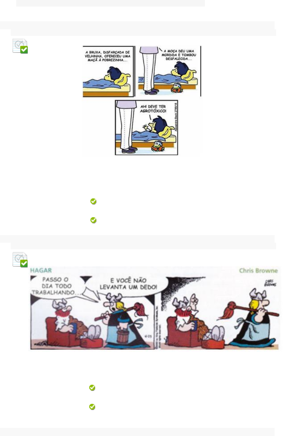 ATIVIDADE TELEAULA I INTERPRETACAO E PRODUCAO DE TEXTOS • Pergunta 1 0 em 0 pontos Fonte: BECK, A. Armandinho. São Paulo: Matrix, 2017, p. 27. Considerando-se a situação de comunicação comum do gênero contos de fadas e o contexto específico da contação de histórias infantis, o termo “agrotóxico” tem função predominantemente no contexto de: Resposta Selecionada: b. Agricultura. Resposta Correta: b. Agricultura. • Pergunta 2 0 em 0 pontos Fonte: SARMENTO, L. L. Oficina de redação. 3. ed. São Paulo: Moderna, 2006, p. 112. Na tirinha, quando Helga fala “E você não levanta um dedo”, é correto afirmar que a resposta do Hagar é tomada em seu sentido: Resposta Selecionada: b. Denotativo. Resposta Correta: b. Denotativo. • Pergunta 3 ATIVIDADE TELEAULA I INTERPRETACAO E PRODUCAO DE TEXTOS 0 em 0 pontos Fonte: SARMENTO, L. L. Oficina de redação. 3. ed. São Paulo: Moderna, 2006, p. 416. A noção de gêneros textuais é apoiada em práticas sociais e em saberes socioculturais, porém podem sofrer variações, na medida em que um texto representativo de um gênero pode incorporar outras características. Desse modo, considerando o anúncio, indique a exemplificação: Resposta Selecionada: c. Intertextualidade. Resposta Correta: c. Intertextualidade. • Pergunta 4 0 em 0 pontos Para o significado de suas comunicações, as pessoas recorrem a estratégias textuais que organizam as informações para que o receptor entenda, mas para isso é necessário conhecer o código em que a mensagem está sendo veiculada. Desse modo, considerando a figura, identifique uma ordem das etapas de leitura para entender a mensagem a seguir: Fonte: Grupo Unip – Objetivo. Resposta Selecionada: b. Compreensão e interpretação. Resposta Correta: b. Compreensão e interpretação.
