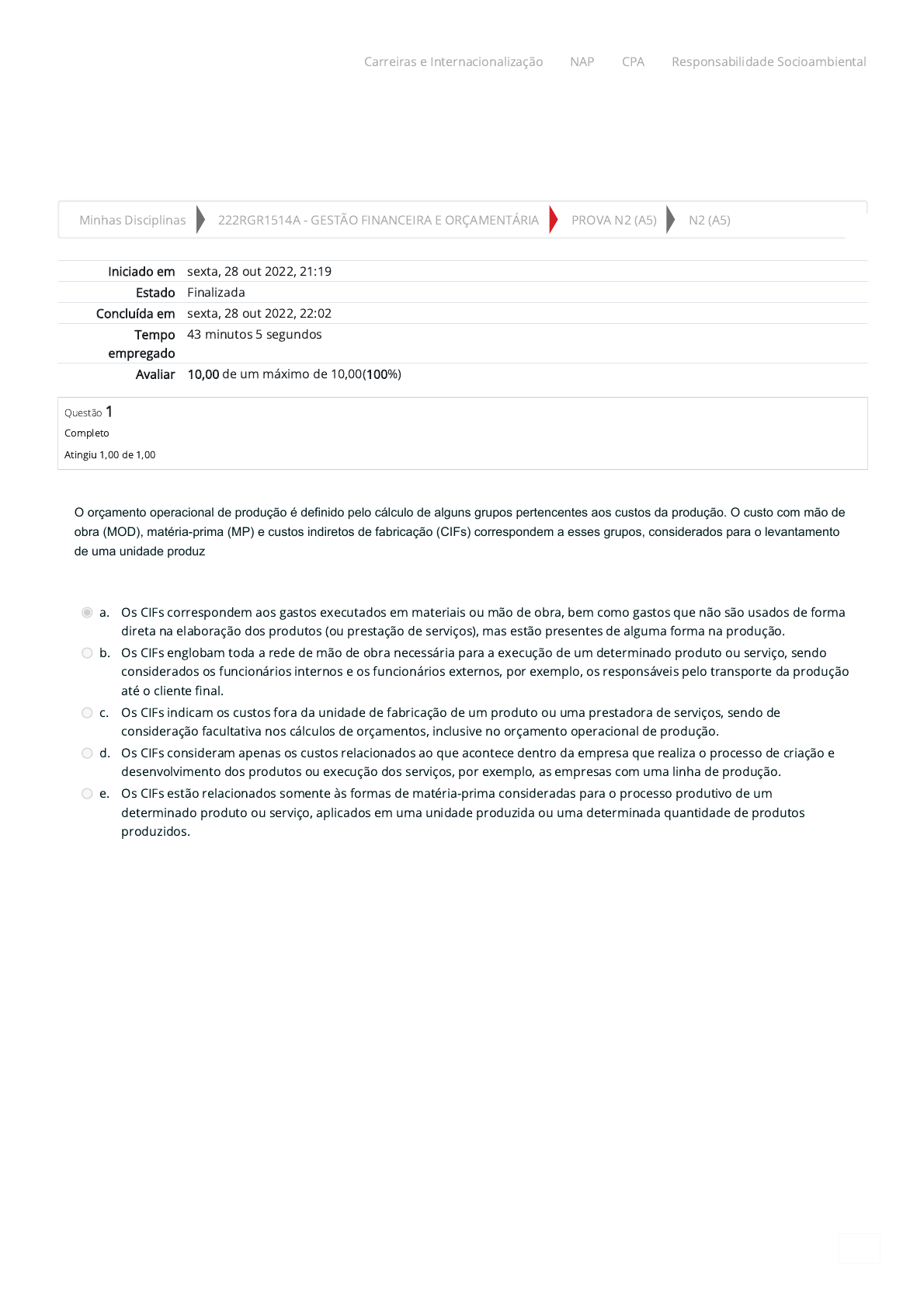 28/10/2022 22:02 N2 (A5): Revisão da tentativa https://ambienteacademico.com.br/mod/quiz/review.php?attempt=1264089&cmid=484379 1/6 Minhas Disciplinas 222RGR1514A - GESTÃO FINANCEIRA E ORÇAMENTÁRIA PROVA N2 (A5) N2 (A5) Iniciado em sexta, 28 out 2022, 21:19 Estado Finalizada Concluída em sexta, 28 out 2022, 22:02 Tempo empregado 43 minutos 5 segundos Avaliar 10,00 de um máximo de 10,00(100%) Questão 1 Completo Atingiu 1,00 de 1,00 O orçamento operacional de produção é definido pelo cálculo de alguns grupos pertencentes aos custos da produção. O custo com mão de obra (MOD), matéria-prima (MP) e custos indiretos de fabricação (CIFs) correspondem a esses grupos, considerados para o levantamento de uma unidade produzida ou uma determinada quantidade de produtos produzidos. Conforme o estudo sobre esse tema, assinale a alternativa que corresponde à definição dos CIFs: a. Os CIFs correspondem aos gastos executados em materiais ou mão de obra, bem como gastos que não são usados de forma direta na elaboração dos produtos (ou prestação de serviços), mas estão presentes de alguma forma na produção. b. Os CIFs englobam toda a rede de mão de obra necessária para a execução de um determinado produto ou serviço, sendo considerados os funcionários internos e os funcionários externos, por exemplo, os responsáveis pelo transporte da produção até o cliente �nal. c. Os CIFs indicam os custos fora da unidade de fabricação de um produto ou uma prestadora de serviços, sendo de consideração facultativa nos cálculos de orçamentos, inclusive no orçamento operacional de produção. d. Os CIFs consideram apenas os custos relacionados ao que acontece dentro da empresa que realiza o processo de criação e desenvolvimento dos produtos ou execução dos serviços, por exemplo, as empresas com uma linha de produção. e. Os CIFs estão relacionados somente às formas de matéria-prima consideradas para o processo produtivo de um determinado produto ou serviço, aplicados em uma unidade produzida ou uma determinada quantidade de produtos produzidos. Carreiras e Internacionalização NAP CPA Responsabilidade Socioambiental https://ambienteacademico.com.br/my/ https://ambienteacademico.com.br/course/view.php?id=17691 https://ambienteacademico.com.br/course/view.php?id=17691§ion=7 https://ambienteacademico.com.br/mod/quiz/view.php?id=484379 https://informa.fmu.br/carreiras/ https://codely-fmu-content.s3.amazonaws.com/Moodle/NAP/inicial/nap/fmu/index.html https://codely-fmu-content.s3.amazonaws.com/Moodle/CPA/landing_CPA/index.html https://portal.fmu.br/sustentabilidade 28/10/2022 22:02 N2 (A5): Revisão da tentativa https://ambienteacademico.com.br/mod/quiz/review.php?attempt=1264089&cmid=484379 2/6 Questão 2 Completo Atingiu 1,00 de 1,00 Questão 3 Completo Atingiu 1,00 de 1,00 As práticas organizacionais devem ser acompanhadas para que possam alcançar os objetivos traçados pelo planejamento das organizações. Dessa forma, o desempenho empresarial pode ser avaliado e monitorado, garantindo espaço para ações corretivas e melhoramentos necessários. Nesse sentido, assinale a alternativa que indica qual é a função do controle. a. Favorecer ao avaliador a medição da performance de alguém ou de um setor especí�co, conforme as diretrizes propostas pelo planejamento organizacional. b. Veri�car se o que foi planejado está sendo atingido, contribuindo para o acompanhamento do desempenho empresarial ou individual por meio do orçamento. c. Manter os envolvidos na execução orçamentária motivados ou interessados em atingir as metas planejadas, conforme o planejamento organizacional. d. Compreender os desvios e, consequentemente, realizar meios para sanar irregularidades no cumprimento orçamentário conforme o planejamento organizacional. e. Garantir o engajamento de pessoas no atingimento dos resultados propostos, a partir do planejamento estratégico da organização. Conforme o contexto da gestão organizacional, algumas etapas são necessárias para o alinhamento entre os objetivos organizacionais e as ações necessárias para alcançá-los. O planejamento e controle são parte disso na rotina administrativa, pois auxiliam a realização dos objetivos organizacionais. Nesse sentido, analise o trecho a seguir. Nas etapas anteriores à execução orçamentária, o foco é maior no ___________, enquanto na etapa de execução orçamentária propriamente dita, o foco será o ___________. Assinale a alternativa que preenche corretamente as lacunas. a. Orçamento; Planejamento. b. Planejamento; controle. c. Planejamento; Orçamento. d. Controle; Orçamento. e. Controle; Planejamento. Carreiras e Internacionalização NAP CPA Responsabilidade Socioambiental https://informa.fmu.br/carreiras/ https://codely-fmu-content.s3.amazonaws.com/Moodle/NAP/inicial/nap/fmu/index.html https://codely-fmu-content.s3.amazonaws.com/Moodle/CPA/landing_CPA/index.html https://portal.fmu.br/sustentabilidade 28/10/2022 22:02 N2 (A5): Revisão da tentativa https://ambienteacademico.com.br/mod/quiz/review.php?attempt=1264089&cmid=484379 3/6 Questão 4 Completo Atingiu 1,00 de 1,00 Questão 5 Completo Atingiu 1,00 de 1,00 Além das informações geradas pela abordagem dos índices financeiros, em termos de análise, também são considerados os índices não financeiros. Estes índices podem ser exemplificados nas organizações pelo seu número de funcionários, pelo número de clientes bem com fornecedores e estoques. Em relação aos indicadores não financeiros, assinale a alternativa que corresponde ao benefício de utilizá-los na tomada de decisão. a. Promove a análise contábil e de questões �nanceiras aprofundada, alcançando os objetivos dos direitos e obrigações das organizações frente ao seu mercado atuante; b. Contribui para a política pública uma vez que sugere novos padrões para a produção e prestação de serviços de determinado mercado em certo períod