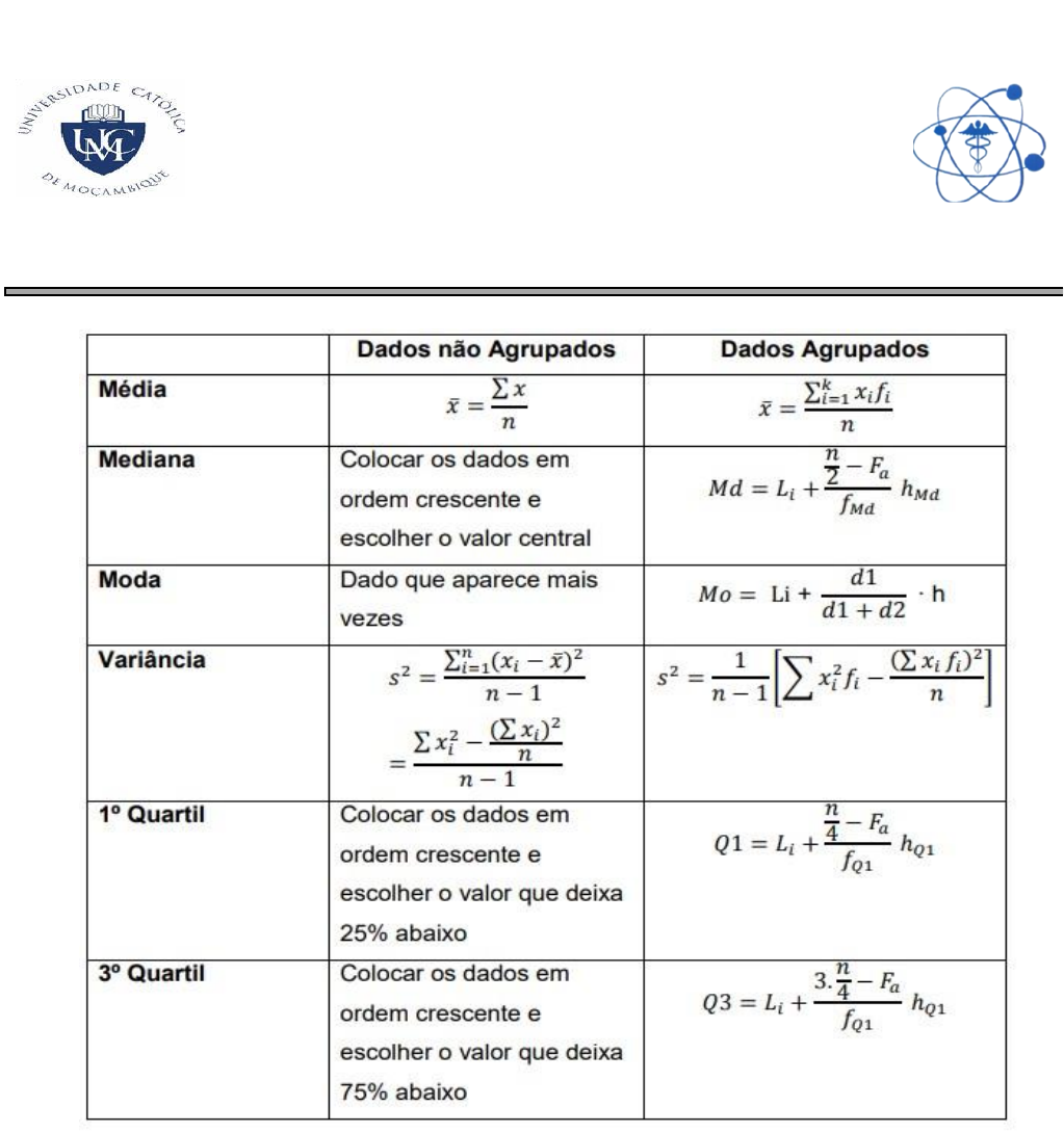 Estat. Aplicada/2023 Página 1 de 6 UNIVERSIDADE CATÓLICA DE MOÇAMBIQUE FACULDADE DE CIÊNCIAS DE SAÚDE Curso de PCAS Ficha-II de Estatística Aplicada (Medidas de tendência central e de variabilidade.) EXERCÍCIOS 1. Classifique as variáveis (qualitativa nominal, qualitativo ordinal, quantitativa discreta, quantitativa contínua): a) Vitamina (A, B1, B2, B6, B12) b) Quantidade de caloria na batata frita. c) Desfecho de uma doença (curado, não curado) d) Classificação de uma lesão (lesão fatal; severa; moderada; pequena). e) Grupo sanguíneo (A, B, AB e O) f) Paridade (primeira gestação, segunda gestação, terceira...) Estat. Aplicada/2023 Página 2 de 6 g) Estado geral de um paciente (bom, regular, ruim) h) Número de nascidos vivos em certo hospital em Junho/99 i) Idade j) Concentração de flúor na água k) Actividade esportiva preferida l) A cor da pele de pessoas (ex.: branca, negra, amarela). m) O número de consultas médicas feitas por ano por um associado de certo plano de saúde. n) O teor de gordura, medido em gramas por 24 horas, nas fezes de crianças de 1 a 3 anos de idade. o) O tipo de droga que os participantes de certo estudo tomaram, registrados como: Droga A, Droga B e placebo. p) A pressão intra-ocular, medida em mmHg, em pessoas. q) O número de filhos das pacientes participantes de certo estudo. 2. Por que a amostra é mais usada do que a população? 3. Quais são as razões para se estudar Estatística no teu curso? 4. Os resultados baseados em uma escala de ansiedade para uma amostra de nove sujeitos são: 67 75 63 72 77 78 81 77 80 Determine as medidas de tendência central (média, moda, mediana) e interprete cada uma. 5. Os dados abaixo referem-se ao número de pessoas que residem em uma amostra de 35 domicílios do bairro Macute no 1°sem/22: 2 3 4 4 5 3 4 5 6 5 3 1 5 5 1 3 4 5 5 5 3 2 2 5 4 4 2 3 5 4 5 4 2 4 9 Construa uma distribuição de frequência sem e com classes. 6. Os dados seguintes são referentes ao nível de glicose de 60 crianças: 56 61 57 77 62 75 63 55 64 60 60 57 61 57 67 62 69 67 68 59 65 72 65 61 68 73 65 62 75 80 66 61 69 76 72 57 75 68 83 64 69 64 66 74 65 76 65 58 65 64 65 60 65 80 66 80 68 55 66 71 Estat. Aplicada/2023 Página 3 de 6 a) Construa uma distribuição de frequência com classe. b) Determine as frequências simples acumuladas de cada classe. c) Determine as frequências relativas de cada classe. d) Determine as frequências relativas acumuladas de cada classe. e) Determine Q2, Q3 D5, D8 e P99 7. Em uma corrida de regularidade, a equipe campeã é aquela em que o tempo dos participantes mais se aproxima do tempo fornecido pelos organizadores em cada etapa. Um campeonato foi organizado em 5 etapas, e o tempo médio de prova indicado pelos organizadores foi de 45 minutos por prova. No quadro, estão representados os dados estatísticos das 5 equipes mais bem classificadas. Dados estatísticos das equipes mais bem classificadas (em minutos): Com base nos dados estatísticos do quadro, qual será a equipa campeã? Justifique a sua resposta. 8. O gráfico apresenta a taxa de desemprego (em %) para o período de março de 2008 a abril de 2009, obtida com base nos dados observados em alguma região da nossa província. (adaptado) Qual é a média, mediana, moda, o D1, D3, Q1 dessa taxa de desemprego, no período de Abril de 2008 a Fevereiro de 2009? Equipas Media Moda Desvio- padrão Equipa A 45 40 5 Equipa B 45 41 4 Equipa C 45 44 1 Equipa D 45 44 3 Equipa E 45 47 2 Estat. Aplicada/2023 Página 4 de 6 9. O gráfico abaixo mostra a produção diária de lixo orgânico de duas pessoas. Qual é o dia da semana em que o gráfico mostra que as produções de lixo das duas pessoas foram iguais? E qual foi a quantidade? 10. Um grupo de adolescentes foi entrevistado sobre o número de vezes que utilizaram droga injectável. Os resultados foram: a) Qual o valor da moda desta informação? O que ela nos informa? b) Qual é a mediana? O que ela significa? c) Determine a média. Interprete. d) Determine Q1, Q2 D3 e P55. O que elas significam? 11. Os dados seguintes são referentes a uma amostra de diâmetros de coração de adultos normais, em mm (medidas em radiografias 36 x 43 cm): 146 125 139 132 121 135 114 114 130 169 114 130 169 125 103 a) Determine a média, a moda e a mediana. b) Calcule a variância, o desvio padrão e coeficiente de variação. 12. Os dados a seguir referem-se ao tempo, em horas, que 80 pacientes hospitalizados dormiram durante a administração de certo anestésico: Estat. Aplicada/2023 Página 5 de 6 a) Encontre a frequência relativa de cada classe. b) Determine a frequência acumulada de cada classe. c) Determine o ponto médio de cada classe. d) Dê a interpretação para a frequência relativa de 3ª classe. e) Qual o percentual de pacientes que dormiram menos de 12 horas? 13. A tabela abaixo indica a idade de uma amostra de pacientes com hipertensão arterial: a) Determine e interprete a idade média. b) Determine interprete a idade modal. c) Calcule o desvio padrão da idade. d) Qual o percentual de pacientes hipertensos com no mínimo 50 anos? e) Qual o percentual de pacientes hipertensos com menos de 40 anos? Estat. Aplicada/2023 Página 6 de 6 14. Os dados a seguir referem-se ao tempo, em horas, que 76 pacientes hospitalizados dormiram durante a administração de certo anestésico. Determine: a) A amplitude de cada classe b) A média da distribuição c) A moda da distribuição d) A mediana da distribuição e) Q3 D8 e P66 f) A variância g) O coeficiente de variação Tempo (horas) Fi [0;4[ 24 [4;8[ 11 [8;12[ 8 [12;16[ 20 [16;20[ 13 Total 76