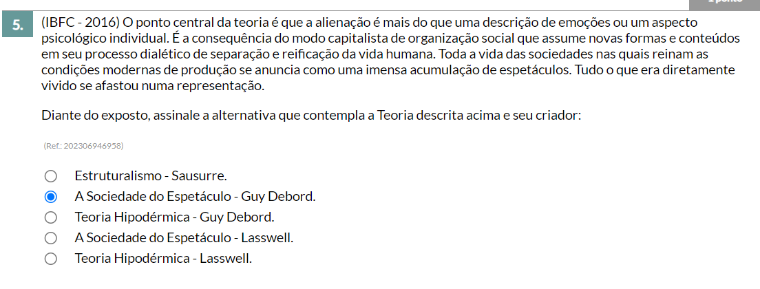 ponto central ou um aspecto psicológico individual. É a consequência do modo capitalista de organização social que assume novas formas e conteúdos em seu processo dialético de separação e reificação da vida humana. Toda a vida das sociedades nas quais reinam as condições modernas de produção se anuncia como uma imensa acumulação de espetáculos. Tudo o que era diretamente vivido se afastou numa representação. Diante do exposto, assinale a alternativa que contempla a Teoria descrita acima e seu criador: Estruturalismo - Sausurre. A Sociedade do Espetáculo - Guy Debord. Teoria Hipodérmica - Guy. A Sociedade do Espetáculo - Lasswell. Teoria Hipodérmica - Lasswell.
