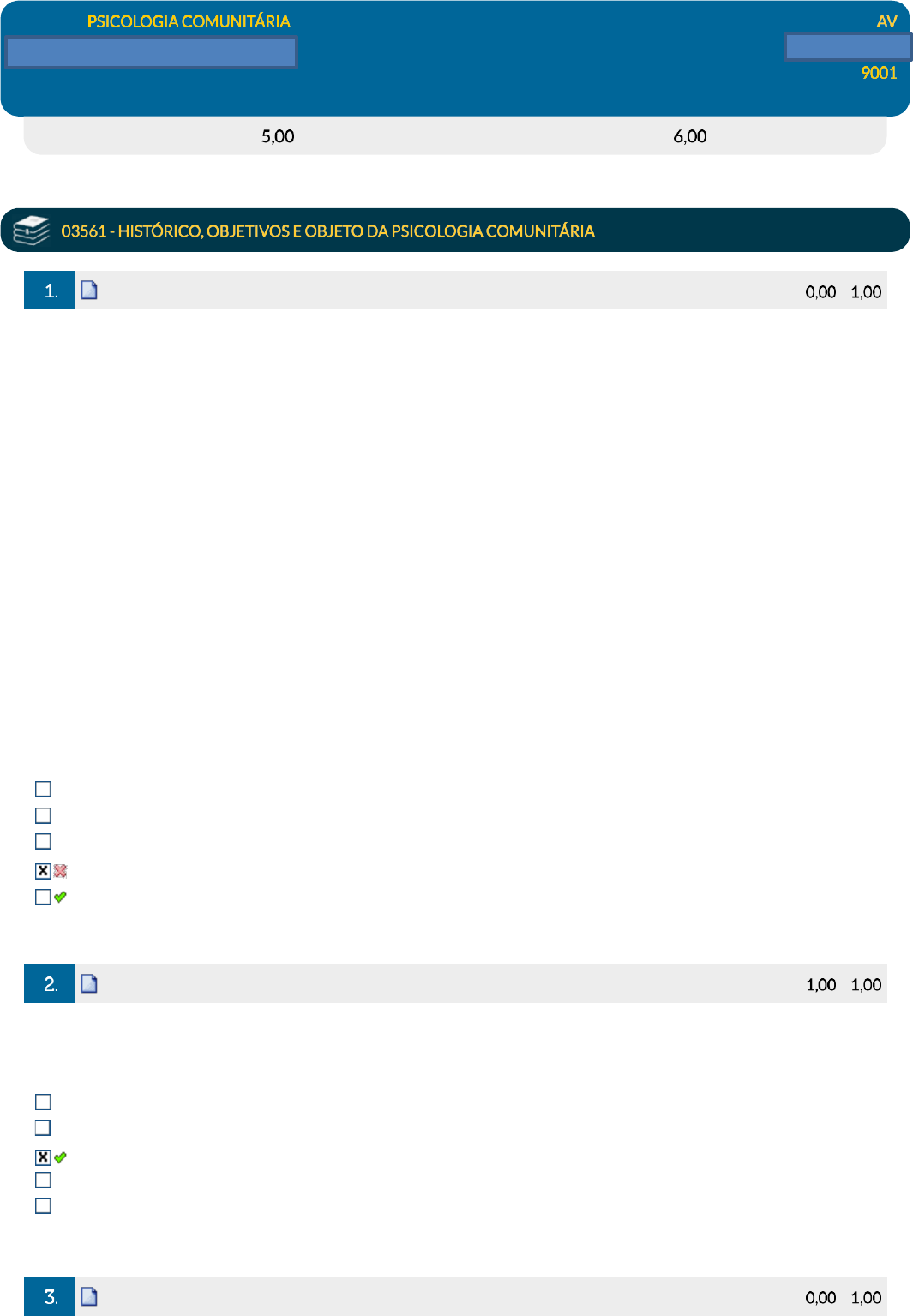 21/04/2023, 18:17 EPS https://simulado.estacio.br/alunos/ 1/5 03561 - HISTÓRICO, OBJETIVOS E OBJETO DA PSICOLOGIA COMUNITÁRIA Pontos: 0,00 / 1,00 Ref.: 6101206 1. Pontos: 1,00 / 1,00 Ref.: 6101073 2. Pontos: 0,00 / 1,00 Ref.: 6101078 3. No âmbito da Psicologia Social Sócio-Histórica a Psicologia Comunitária se originou a partir da necessidade de atendimento as demandas sócio-comunitárias fundamentada em algumas concepções elementares fundamentais. Analise as akrmativas abaixo que refletem tais concepções. I - Concepção de que o complexo das relações socioculturais influenciava na construção do indivíduo e da comunidade; II ¿ Concepção de que não seria possível uma Psicologia verdadeiramente social se esta não se comprometesse com a melhoria de problemas sociais através de intervenções psicossociais; III ¿ Concepção de que a Psicologia Comunitária se limitaria a estudar os processos comunitários apenas através de intervenções indiretas na comunidade, caso contrário estaria desrespeitando a dinâmica comunitária; IV ¿ Concepção de que os fenômenos sociais tem uma base subjetiva fundamentada nos registros psicológicos que marcavam a personalidade dos sujeitos e que seu conhecimento e possível mudança seria possív el através de processos de sensibilização e conscientização; Marque a alternativa que apresenta as akrmativas corretas. Apenas II e IV estão corretas. Apenas I e IV estão corretas. Apenas I e II estão corretas. Apenas I, III e IV estão corretas. Apenas I, II e IV estão corretas. A Psicologia Comunitária é uma aplicação recente da Psicologia Social voltada para resolução dos problemas na dinâmica comunitária e que precisa ser mais conhecida e reconhecida no âmbito universitário. Isso implica na necessidade de práticas diferenciadas no âmbito universitário sendo a principal delas a aproximação da comunidade com o público universitário através de práticas de extensão; promoção da área de Psicologia Comunitária em detrimento da área de Psicologia Clínica e Institucional criação de uma disciplina de Psicologia Comunitária e o estímulo à produção cientíkca na área. promoção de palestras, seminários e demais eventos universitários sobre o tema; promoção de cursos extracurriculares sobre Psicologia Comunitária; Disciplina: PSICOLOGIA COMUNITÁRIA Aluno: ALINE LEOPOLDINA DA SILVA ARA1097_AV_201902733703 (AG) AV 201902733703 Turma: 9001 23/09/2022 17:10:34 (F) Avaliação: 5,00 pts Nota SIA: 6,00 pts 21/04/2023, 18:17 EPS https://simulado.estacio.br/alunos/ 2/5 03562 - DIMENSÃO ÉTICA, METODOLÓGICA E POLÍTICA Pontos: 0,00 / 1,00 Ref.: 6097839 4. Pontos: 1,00 / 1,00 Ref.: 6097836 5. Pontos: 1,00 / 1,00 Ref.: 6097838 6. No Âmbito do Desenvolvimento Comunitário, uma estratégia importante é a construção de indicadores de desenvolvimento, como por exemplo: a qualidade dos recursos naturais e a riqueza cultural. Aknal para que servem esses indicadores? Cumprir os ditames legais associados a execução de projetos voltados para o desenvolvimento comunitário; Favorecer a avaliação tanto das forças e fraquezas comunitárias quando do acompanhamento das diferente etapas dos projetos de desenvolvimento comunitário; Favorecer a comunicação interna com a equipe de trabalho dos projetos comunitários em função da codikcação que eles permitem além de favorecer o controle de gastos desnecessários. Garantir a segurança dos dados coletados na comunidade e favorecer sua codikcação e inserção em banco de dados; Favorecer o preenchimento de relatórios e demais formulários para as agências de knanciamento dos processos de desenvolvimento comunitário; A função especíkca do psicólogo comunitário deve compreender a ética como um caminho necessário e obrigatório. Esse alinhamento oferecerá um suporte ao psicólogo, para uma atuação mais segura, prokssional e técnica, gerando respeito e conkança entre o prokssional e a comunidade. O psicólogo comunitário deve buscar que a comunidade Desenvolva um senso de justiça que gere transformações em toda a humanidade. Desenvolva uma atuação passiva, de forma que apenas o psicólogo intervenha, uma vez que somente ele conhece os pressupostos cientíkcos. Desenvolva um tecido psicossocial sólido de forma a garantir que a história da comunidade seja inalterada. Desenvolva apenas valores éticos, uma vez que a realidade é quase impossível ser mudada. Desenvolva conscientização dos seus problemas e busca da sua própria libertação de maneira ativa. É notório que a ética permeia toda a vida em sociedade e deve ser norteadora da vida dos cidadãos, principalmente no ambiente prokssional. Sobre a ética no trabalho do psicólogo comunitário e social, assinale a alternativa correta. A reflexão ética contribui para que o psicólogo se desvista das suas próprias opiniões e juízos de valor, respeitando as diferenças e seguindo a metodologia cientíkca. A reflexão ética torna o trabalho do psicólogo mais seguro, pois o ajuda a lidar com situações complexas, mas deve ser rigidamente seguida através de manuais. A reflexão ética contribui para que o psicólogo atue de maneira a seguir suas crenças pessoais, afastando tudo o que for contrário aos próprios costumes. A reflexão ética cria problemas para a atuação do psicólogo, pois o desvia da atuação cientíkca deixando-o preso a questões de pouca importância. A reflexão ética não contribui para uma boa atuação do psicólogo, uma vez que atrapalha na tomada de decisões ao criar empecilhos para a intervenção. O psicólogo comunitário busca necessariamente inteirar-se de uma perspectiva social e histórica da comunidade ou do indivíduo. Marque a alternativa que apresenta uma premissa que dekne a atuação de um psicólogo comunitário. 21/04/2023, 18:17 EPS https://simulado.estacio.br/alunos/ 3/5 03563 - PSICOLOGIA COMUNITÁRIA E A DIALÉTICA EXCLUSÃO-I