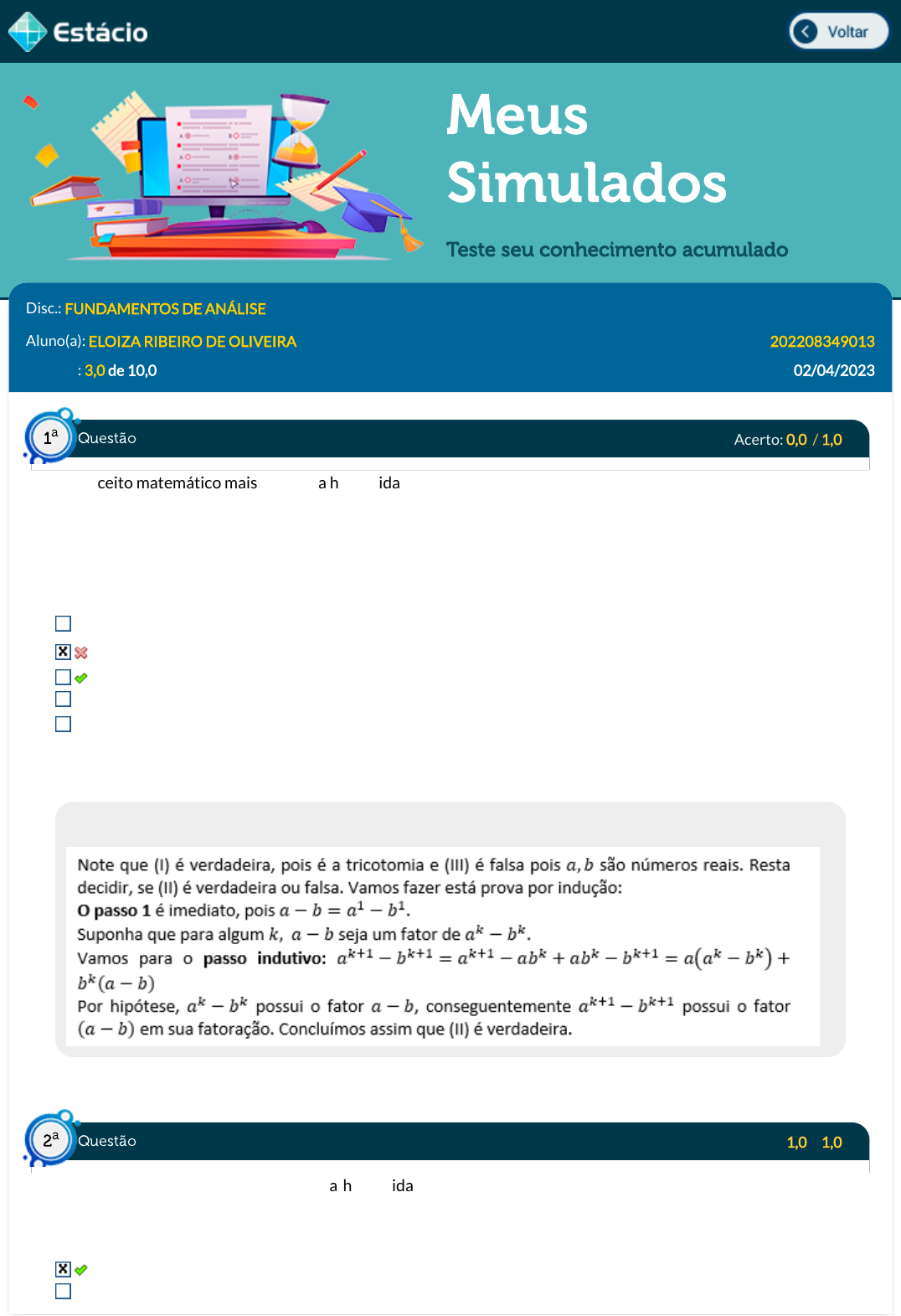 Meus Simulados Teste seu conhecimento acumulado Disc.: FUNDAMENTOS DE ANÁLISE Aluno(a): ELOIZA RIBEIRO DE OLIVEIRA 202208349013 Acertos: 3,0 de 10,0 02/04/2023 Acerto: 0,0 / 1,0 O conceito matemático mais básico da humanidade é provavelmente o da contagem, o qual está totalmente relacionado com os números naturais. Dados os números reais a,b, diga qual das sentenças a seguir são verdadeiras ou falsas: I. a>b ou a II. a-b é um fator da fatoração de an-bn III. a/b é um número racional. V, F, V V, V, V V, V, F V, F, F F, F, F Respondido em 02/04/2023 00:29:52 Explicação: Acerto: 1,0 / 1,0 O conceito matemático mais básico da humanidade é provavelmente o da contagem, o qual está totalmente relacionado com os números naturais. O conjunto de regras/axiomas que de�ne os números naturais foi criado por qual matemático? Giussepe Peano. Birkhoff Maclane. Questão1 a Questão2 a https://simulado.estacio.br/alunos/inicio.asp javascript:voltar(); Elon Lages Lima. George Cantor. Julius Dedekind. Respondido em 02/04/2023 00:30:05 Explicação: O conjunto de regras que de�nem os números naturais é conhecido como axiomas de Peano, sendo assim, apesar das contribuições de Cantor e Dedekind terem contribuído para uma de�nição precisa dos números reais, o cerne dos números naturais contido em milénios de história foi criado por Giussepe Peano em 1882. Acerto: 1,0 / 1,0 O conceito matemático mais básico da humanidade é provavelmente o da contagem, o qual está totalmente relacionado com os números naturais. Diga se as sentenças a seguir, são verdadeiras ou falsas: I. Sejam S e T conjuntos. Se S e T são �nitos, então S∪T é �nito. II. Sejam S e T conjuntos. Se S é in�nito e T são �nitos, então S∪T é �nito. III. Sejam S e T conjuntos. Se S é in�nito e T são �nitos, então S∩T é �nito. V, F, V V, V, F V, F, F V, V, V F, F, F Respondido em 02/04/2023 00:31:11 Explicação: Sobre (I) vimos que se S e T são �nitos então #(S∪T) é �nita e sua cardinalidade não ultrapassa #S+#T. Sobre (II) temos que {1,2}∪N=N que é in�nito e, portanto, é falsa. Por �m, S∩T⊂S que é �nito, logo tal valor precisa ser �nito e assim, temos que (III) é verdadeira. Acerto: 0,0 / 1,0 Dizemos que um número real 0 e 1 tem uma representação decimal, por que ele pode ser escrito da forma Determine qual é o número real entre 0 e 1 que possui a representação decimal: 1/9 Questão3 a Questão4 a 1 9/10 1/3 0,99 Respondido em 02/04/2023 00:33:02 Explicação: Existem muitas formas de justi�car isso, mas optamos por uma das ideias mais legais do ensino médio. Acerto: 0,0 / 1,0 Determine quais das a�rmações a seguir são verdadeiras ou falsas: V; F; F V; F; V F; V; V F; V; F V; V; V Respondido em 02/04/2023 00:34:36 Explicação: (I) é a Desigualdade das médias geométricas e aritméticas, logo é verdadeira, (III) segue do Teorema 2.1.5 Teorema da Inequação. Note que (II) não está nas hipóteses do teorema 2.1.5 Teorema da Inequação, pois -2<-1 e (-2)2>(-1)2, logo é falsa. Acerto: 1,0 / 1,0 Determine o ín�mo e supremo de . inf A=0 ; sup A=1/2 Questão5 a Questão6 a inf A=0 ; sup A=1 inf A=0 ; sup A=1/3 inf A=1 ; sup A=0 inf A>0 ; sup A=1 Respondido em 02/04/2023 00:35:40 Explicação: Logo sup A=1/3 e inf A=0 pela propriedade arquimediana. Acerto: 0,0 / 1,0 Quais das sentenças a seguir de�nem um conjunto compacto em um espaço métrico: Seja E um espaço métrico, diremos que um conjunto A ⊂ E é dito compacto, se e somente se Ac é aberto. Seja E um espaço métrico, diremos que um conjunto A ⊂ E é dito compacto, se e somente se ele não puser ser a união de dois conjuntos separados. Seja E um espaço métrico, diremos que um conjunto A ⊂ E é dito compacto, se e somente se A for fechado e limitado. Seja E um espaço métrico, diremos que um conjunto A ⊂ E é dito compacto, se e somente se Ac for fechado. Seja E um espaço métrico, diremos que um conjunto A ⊂ E é compacto, se e somente se toda cobertura aberta de A, tem uma subcobertura �nita. Respondido em 02/04/2023 00:38:36 Explicação: Basta darmos os nomes corretos a cada uma das sentenças apresentadas, Seja E um espaço métrico, diremos que um conjunto A ⊂ E é dito conexo, se e somente se ele não puder ser a união de dois conjuntos separados. Seja E um espaço métrico, diremos que um conjunto A ⊂ E é dito fechado, se e somente se Ac é aberto Seja E um espaço métrico, diremos que um conjunto A ⊂ E é dito aberto, se e somente se Ac for fechado. Seja E um espaço métrico, diremos que um conjunto A ⊂ E é dito compacto, se e somente se A for fechado e limitado. Essa a�rmação é simplesmente falsa. Nesta última sentença, temos uma "pegadinha" que pode gerar con�ssão, uma vez que todo compacto é fechado e limitado, contudo, a recíproca, só vale em espaços n dinencionais, uma vez que a bola unitária fechada em l∞ é fechada e limitada, mas não é compacta. Acerto: 0,0 / 1,0 Determine a condição sobre para que |x − 4| ∣∣√x − 2∣∣ < 1 102 Questão7 a Questão8 a Respondido em 02/04/2023 00:45:00 Explicação: Sempre podemos fazer as contas com os números propostos e usar a calculadora, mas a análise matemática é feita principalmente de desigualdades, assim, vamos usá-las. Primeiro note que Note que desta forma então A �m de que este valor seja menor que , devemos ter Acerto: 0,0 / 1,0 Diga se as a�rmações são verdadeiras ou falsas: V, V, F F, V, V V, F, V V, F, F F, V, F Respondido em 02/04/2023 00:49:58 Explicação: |x − 4| < √2 100 |x − 4| < 1 |x − 4| < √2 10 |x − 4| < 1 100 |x − 4| < 1 10 ∣∣√x − 2∣∣ = ∣∣ ∣ ∣ x−4 √x+2 √x + √2 > √2, ∣∣√x − 2∣∣ <= ∣∣ ∣ ∣ x−4 √2 1 102 |x − 4| < . √2 102 Questão9 a Acerto: 0,0 / 1,0 Qual dos valores a seguir representa -1 ∞ 1 0 -∞ Respondido em 02/04/2023 00:55:19 Explicação: Que