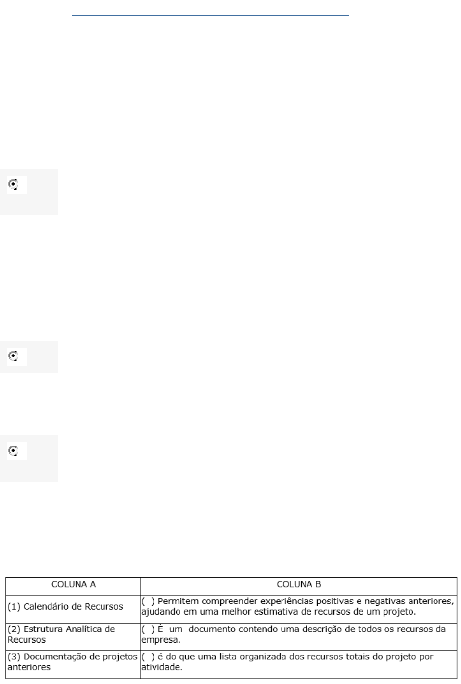 Gestão de Projetos - 2ª tentativa – Apol 01 Questão 1/10 - Gestão de Projetos GPROJ - Sobre as características essenciais do processo de planejamento, marque V para Verdadeiro ou F para Falso e assinale a alternativa correta. ( ) A primeira delas é a determinação dos recursos necessários ao cumprimento dos objetivos. ( ) A principal é o cálculo das estimativas de tempo para as atividades. ( ) O segundo passo está em identificar as atividades e recursos necessários para a realização do projeto. ( ) A determinação do prazo de conclusão do projeto em si é a primeira etapa a ser considerada. B b) F – F – V – F Questão 2/10 - Gestão de Projetos GPROJ - Analise as opções a seguir e assinale a alternativa correta. De modo geral, o ciclo de vida de um projeto comporta quatro fases, momentos ou desdobramentos distintos. É importante termos em mente que em cada uma dessas fases ocorre uma transição para a fase seguinte sem que, no entanto, seja necessário o término efetivo da fase anterior para o início da seguinte. A fase que consiste na organização das ações necessárias para transformarmos o desejo subjetivo em produto objetivo é a fase de: A Planejamento Questão 3/10 - Gestão de Projetos GPROJ - Analise as opções a seguir e assinale a alternativa correta. “É a reunião de uma série de projetos vinculados, inclusive geograficamente, em um determinado setor ou empresa como um todo”. A afirmação acima se refere ao conceito de: B Programa Questão 4/10 - Gestão de Projetos GPROJ - A estimativa de recursos é uma etapa importante do planejamento de um projeto e significa avaliar tudo o que será necessário para poder executar uma atividade de um pacote de trabalho. Muitos documentos e informações são referências necessárias para uma adequada estimativa de recursos de projeto. Analise a tabela abaixo. Relacione a coluna A (documentos) com a coluna B (caracterização dos documentos) e, em seguida, assinale a alternativa que apresenta a sequência CORRETA: D 3 – 1 – 2 Questão 5/10 - Gestão de Projetos GPROJ - Analise as afirmativas abaixo: ( ) São ferramentas para coletar os requisitos: Entrevistas, Dinâmicas de grupo, Questionários e pesquisas. ( ) A coleta de requisitos é uma atividade que acontece dentro do grupo de processos de monitoramento e controle do projeto ( ) A matriz de rastreabilidade de requisitos é uma ferramenta que relaciona as funcionalidades e funções do produto com as suas origens (os requisitos) do produto ou do projeto. ( ) O Plano de Gerenciamento dos Requisitos estabelece como os requisitos serão documentados, analisados e gerenciados ao longo da vida do projeto. Considerando C para as afirmativas corretas e I para as afirmativas incorretas, assinale a alternativa que apresenta a sequência correta. C c) C, I, C, C Questão 6/10 - Gestão de Projetos GPROJ - De acordo com o estudado sobre Gestão de custos do projeto, analise as sentenças a seguir e assinale a alternativa correta. O Guia PMBOK sugere que: I – sejam registradas detalhadamente todas as mudanças relacionadas com a linha de base de custos; II - sejam evitadas mudanças incorretas, inadequadas ou não aprovadas e, ainda, que estas não se incluam nos custos relatados ou na utilização de recursos; III - sejam amplamente divulgadas às partes interessadas as mudanças aprovadas, em especial observando qual informação interessa a cada stakeholder; IV - a equipe de gestão e suas auxiliares devem agir no sentido de manter as extrapolações dos custos dentro de limites seguros e aceitáveis. D As sentenças I, II, III e IV estão corretas. Questão 7/10 - Gestão de Projetos GPROJ - No gerenciamento do tempo em projetos dependência obrigatória indica que a atividade dependente não pode acontecer de outra forma senão aquela que foi desenhada no diagrama, enquanto dependência arbitradas (ou desejadas) demonstram boas práticas, ou seja, o que seria bom, mais confortável, mais desejável, ou com menor risco ou menor custo, mas que poderiam ser modificadas se necessário.Analise as afirmações abaixo: ( ) As dependências obrigatórias são também chamadas de “hard logic”; e as dependências arbitradas (ou desejadas) são também chamadas de “soft logic”. ( ) É uma exemplo de dependência obrigatória: A impossibilidade de instalar as janelas de uma casa antes de termos as paredes construídas. ( ) É um exemplo de dependência arbitrada: Seria ideal picar e deixar disponível para o cozinheiro todos os ingredientes para preparo de um prato antes dele começar a cozinhar, porém, se for necessário , pode-se iniciar o preparo com apenas os ingredientes utilizados no início da receita picados. ( ) É um exemplo de dependência arbitrada: A impossibilidade de testar um protótipo antes do mesmo ser confeccionado. Considerando V para as afirmativas verdadeiras e F para as afirmativas falsas, assinale a alternativa que apresenta a sequência correta. B V, V, V, F Questão 8/10 - Gestão de Projetos GPROJ - No que se refere o PMO (Project management office), analise as proposições e marque V para as alternativas corretas e F para as erradas. Em seguida, assinale a alternativa que contém a sequência correta de resposta. ( ) A principal atividade de um PMO é desenvolver o planejamento do projeto. ( ) A principal atividade de um PMO é supervisionar e gerenciar o projeto. ( ) Cabe ao PMO atuar como uma “autoridade” nas decisões referentes a determinada fase do projeto. ( ) O PMO cuida dos aspectos relacionados aos recursos humanos, selecionando, remanejando, treinando ou compartilhando o pessoal envolvido com o projeto. B F – V – V – V Questão 9/10 - Gestão de Projetos GPROJ - O escritório de gestão de projetos está encarregado do processo de integração. São vários os documentos que são elaborados, no sentido de dialogar com diversos setores organizacionais, mas, conforme o guia PMBOK, alguns deles são d