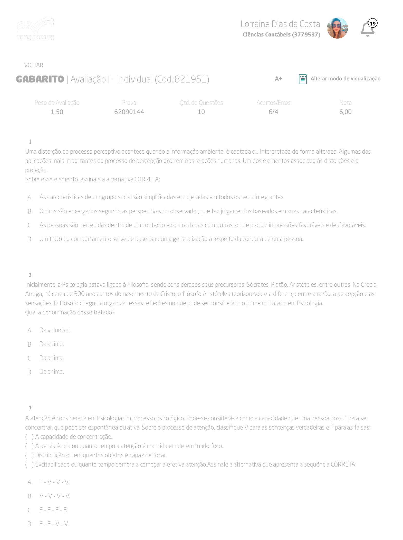 21/04/23, 19:31 AVA https://ava2.uniasselvi.com.br/subject/grades-and-tests/answer-book/eyJ0ZXN0Ijp7InRlc3RDb2RlIjoiODIxOTUxIiwiZGVzY3JpcHRpb24iOiJBdmFsaWHDp8OjbyBJIC0gSW5kaXZpZHVhbCIsInBhcmFtZXRlciI6MTI5Mj… 1/3 GABARITO | Avaliação I - Individual (Cod.:821951) Peso da Avaliação 1,50 Prova 62090144 Qtd. de Questões 10 Acertos/Erros 6/4 Nota 6,00 Uma distorção do processo perceptivo acontece quando a informação ambiental é captada ou interpretada de forma alterada. Algumas das aplicações mais importantes do processo de percepção ocorrem nas relações humanas. Um dos elementos associado às distorções é a projeção. Sobre esse elemento, assinale a alternativa CORRETA: A As características de um grupo social são simplificadas e projetadas em todos os seus integrantes. B Outros são enxergados segundo as perspectivas do observador, que faz julgamentos baseados em suas características. C As pessoas são percebidas dentro de um contexto e contrastadas com outras, o que produz impressões favoráveis e desfavoráveis. D Um traço do comportamento serve de base para uma generalização a respeito da conduta de uma pessoa. Inicialmente, a Psicologia estava ligada à Filosofia, sendo considerados seus precursores: Sócrates, Platão, Aristóteles, entre outros. Na Grécia Antiga, há cerca de 300 anos antes do nascimento de Cristo, o filósofo Aristóteles teorizou sobre a diferença entre a razão, a percepção e as sensações. O filósofo chegou a organizar essas reflexões no que pode ser considerado o primeiro tratado em Psicologia. Qual a denominação desse tratado? A Da voluntad. B Da animo. C Da anima. D Da anime. A atenção é considerada em Psicologia um processo psicológico. Pode-se considerá-la como a capacidade que uma pessoa possui para se concentrar, que pode ser espontânea ou ativa. Sobre o processo de atenção, classifique V para as sentenças verdadeiras e F para as falsas: ( ) A capacidade de concentração. ( ) A persistência ou quanto tempo a atenção é mantida em determinado foco. ( ) Distribuição ou em quantos objetos é capaz de focar. ( ) Excitabilidade ou quanto tempo demora a começar a efetiva atenção.Assinale a alternativa que apresenta a sequência CORRETA: A F - V - V - V. B V - V - V - V. C F - F - F - F. D F - F - V - V. VOLTAR A+ Alterar modo de visualização 1 2 3 Lorraine Dias da Costa Ciências Contábeis (3779537) 19 21/04/23, 19:31 AVA https://ava2.uniasselvi.com.br/subject/grades-and-tests/answer-book/eyJ0ZXN0Ijp7InRlc3RDb2RlIjoiODIxOTUxIiwiZGVzY3JpcHRpb24iOiJBdmFsaWHDp8OjbyBJIC0gSW5kaXZpZHVhbCIsInBhcmFtZXRlciI6MTI5Mj… 2/3 Desde o seu surgimento enquanto ciência, a Psicologia vem expandindo o seu campo de estudo. Muitos estudiosos contribuíram para o crescimento dos conhecimentos na área da Psicologia, fato que contribuiu para que, atualmente, a Psicologia possua uma multiplicidade de modelos teóricos. Diante disso, assinale a alternativa CORRETA que indica o que estuda a psicologia do desenvolvimento: A Estuda as mudanças que ocorrem no ciclo de vida de uma pessoa. B Estuda a evolução pessoal de uma pessoa. C Estuda a evolução nos relacionamentos de uma pessoa. D Estuda a evolução profissional de uma pessoa. Desde o seu surgimento enquanto ciência, a Psicologia vem expandindo o seu campo de estudo. Após Wundt, muitos outros estudiosos contribuíram para o crescimento dos conhecimentos na área da Psicologia, fato que contribuiu para que, atualmente, a Psicologia possua uma multiplicidade de modelos teóricos. Assinale a alternativa CORRETA que representa a definição de Psicologia da personalidade: A Busca a integração ampla e compreensiva dos dados obtidos por todos os setores de investigação psicológica. B Ramo da psicologia que lida com diagnósticos e tratamento de problemas e desordens psicológicas. C Ramo da Psicologia que faz interface com a estatística e trata da utilização de números no estudo dos fenômenos naturais. Investigam e aperfeiçoam a teoria e aplicação de testes psicológicos. D Estuda as mudanças que ocorrem no ciclo de vida de uma pessoa. Estuda o comportamento anormal do ser humano, como as neuroses e as psicoses (BRAGHIROLLI, 1990).A que o exposto se refere? FONTE: BRAGHIROLLI, E. M. Psicologia geral. 9. ed. Porto Alegre: Vozes, 1990. A Psicopedagogia. B Pedagogia. C Neurologia. D Psicopatologia. Galeno, então, a partir das formulações de Hipócrates, distinguiu quatro temperamentos primários, que foram nomeados de acordo com os humores predominantes no corpo de cada pessoa. A respeito de quais são elas, assinale a alternativa INCORRETA: A Colérico. B Melancólico e fleumático C Vigoroso. D Sanguíneo. Realiza pesquisa, diagnóstico, acompanhamento psicológico e atenção psicoterápica individual ou em grupo, através de diferentes abordagens teóricas. Assinale a alternativa CORRETA que apresenta qual é o profissional a que a afirmação se refere: A Psicólogo do trânsito. B Psicólogo educacional. C Psicólogo clínico. 4 5 6 7 8 Lorraine Dias da Costa Ciências Contábeis (3779537) 19 21/04/23, 19:31 AVA https://ava2.uniasselvi.com.br/subject/grades-and-tests/answer-book/eyJ0ZXN0Ijp7InRlc3RDb2RlIjoiODIxOTUxIiwiZGVzY3JpcHRpb24iOiJBdmFsaWHDp8OjbyBJIC0gSW5kaXZpZHVhbCIsInBhcmFtZXRlciI6MTI5Mj… 3/3 D Psicólogo organizacional e do trabalho. Analise a charge: A realidade denunciada pela charge remete a uma das distorções de percepção de grande parte população mundial. A que o exposto se refere? A Estereótipos e preconceitos. B Contraste e estereótipos. C Efeito halo e preconceitos. D Projeção e contraste. Desde o seu surgimento enquanto ciência, a Psicologia vem expandindo o seu campo de estudo. Sabe-se que no Brasil existem várias áreas de atuação para os psicólogos. Assinale a alternativa CORRETA que representa a função do Psicólogo Educacional: A Age como um facilitador do processo ensinoaprendizagem e atua no âmbito da educação, n