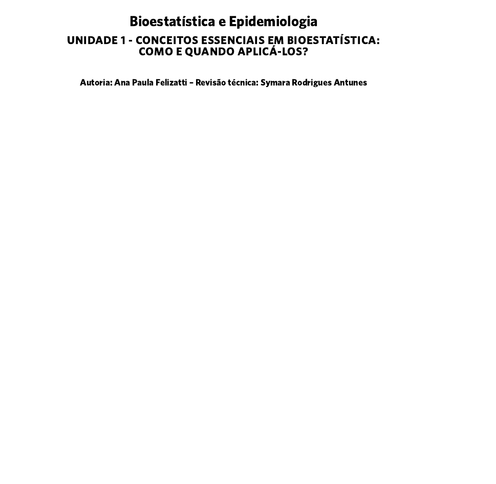 Autoria: Ana Paula Felizatti – Revisão técnica: Symara Rodrigues Antunes Bioestatística e Epidemiologia UNIDADE 1 - CONCEITOS ESSENCIAIS EM BIOESTATÍSTICA: COMO E QUANDO APLICÁ-LOS? Caro (a) estudante, nesta unidade, vamos abordar os principais conceitos em bioestatística e como aplicá-los em diferentes casos. A estatística é uma ciência amplamente utilizada em diversas áreas de conhecimento – exatas, humanas ou biológicas. Ela é essencial na solução de questões investigativas. Por exemplo, como medir a probabilidade de uma doença estar se alastrando em uma população de milhões de habitantes? Não é viável mensurar manualmente, coletando informações sobre cada um dos habitantes daquele local, não é mesmo? Por isso, a estatística torna-se uma ferramenta-chave, pois permite que dados sejam interpretados com confiança a partir de uma determinada população e uma condição ou característica de interesse. Você certamente já utilizou estatística em sua rotina ou se deparou com dados estatísticos em diversas situações. De fato, a estatística passou a ser um recurso multidisciplinar a partir do século XVII, quando aplicada nas áreas de investigação científica da saúde pública, indústria e comércio e para estudos demográficos. Já no século seguinte, XVIII, ela passou a ser aplicada em estudos meteorológicos, antropométricos, econômicos, sociais e biológicos. Na grande área das ciências biológicas, a estatística empresta suas ferramentas para a criação de uma subárea, chamada de bioestatística, utilizada para mensurar diversos problemas das áreas de saúde e ciências biológicas. Vamos a alguns exemplos da aplicação da bioestatística: como identificar efeitos colaterais de determinado medicamento em humanos? Como avaliar se os dados obtidos em uma pesquisa clínica são estatisticamente significantes ou não? É importante destacar que para os dados serem válidos é necessário não só a estatística, mas outros meios, principalmente o desenho experimental. Além disso, a bioestatística é um dos pilares do rastreamento de doenças, permitindo que informações sobre o nível de disseminação e contenção sejam avaliadas e utilizadas para o estabelecimento de medidas de prevenção. Vamos começar? Bons estudos! Introdução 1.1 Principais medidas e conceitos em bioestatística A bioestatística é a aplicação de ferramentas estatísticas na grande área das ciências biológicas. De modo geral, a estatística é uma ciência que objetiva extrair informações de um conjunto amostral, ou seja, sintetizar numericamente o que é de fato significativo em um conjunto observado. Expandindo o conceito para a bioestatística, temos que o objetivo desta ciência é justamente compreender o que um conjunto de dados biológicos está indicando (POCINHO; FIGUEIREDO, 2004). Assim, a bioestatística surge com uma ferramenta importantíssima para responder aos crescentes questionamentos científicos ao longo da evolução do conhecimento. Mas como os estudos utilizando bioestatística são iniciados? Primeiro, é necessário estabelecer a hipótese do estudo. Por exemplo, os sintomas de determinada doença são iguais em todas as faixas etárias? Uma vez definido o questionamento hipotético, inicia-se o desenho experimental e analítico para que ele seja respondido. Em seguida, é necessário determinar a população e o conjunto amostral que serão testados (ANDRADE; OGLIARE, 2013). A população pode ser definida como o somatório dos elementos interessantes ao estudo – no nosso exemplo, temos a população de diferentes faixas etárias acometida por uma determinada doença. A escolha da população pode se diferenciar em relação a: origem, natureza e tamanho. Conheça um pouco mais sobre esses elementos (VIEIRA, 2008). O canal Estatística Interativa aborda no vídeo (2018) o surgimento da bioestatística, discutindo sobre uma das estudiosas pioneiras da área, Florence Nightingale, e todo o contexto histórico que levou a aplicação da estatística em dados biológicos. Assista (https://www.youtube.com/watch? v=diM7gG7Z37c&ab_channel=Estat%C3%A) Você quer ver? https://www.youtube.com/watch?v=diM7gG7Z37c&ab_channel=Estat%C3%A User Realce User Realce User Realce User Realce User Realce User Realce User Realce Na maioria dos casos, é inviável analisar uma população completa dada sua complexidade e número de elementos. Por isso, para análises estatísticas, uma amostra é retirada para gerar um conjunto representativo. O processo de determinação da amostra é baseado em um plano de amostragem, em que o tamanho amostral e as características de interesse são previamente definidos para assegurar se, de fato, aquele conjunto será válido para representar a população geral (VIEIRA, 2008; BALDI; MOORE, 2014). Observe, a seguir, um exemplo do que seria a amostragem. #PraCegoVer: imagem traz um diagrama com três círculos concêntricos. O círculo maior é identificado com população geral; o do meio, com população-alvo; e o menor é identificado como amostra. Observe que uma amostra é selecionada a partir de uma população-alvo, que, por sua vez, faz parte de uma população geral. Podemos associar esse tipo de amostragem considerando como exemplo a população de uma cidade como sendo a população geral, as pessoas diabéticas dessa população como a população-alvo, e, por fim, a seleção de algumas pessoas diabéticas para determinado estudo como sendo a amostra. Origem É relativa aos elementos que compõem a população (pessoas ou animais, objetos, acontecimentos). 1 Natureza Diz respeito a sua existência (população real ou hipotética, existente ou não). 2 Tamanho É relativo à quantificação dos elementos, podendo ser um conjunto finito ou infinito de elementos. 3 Figura 1 - Exemplo de amostragem Fonte: Fonte: Elaborada pela autora, 2020. User Realce User Realce User Realce User Realce User Realce 