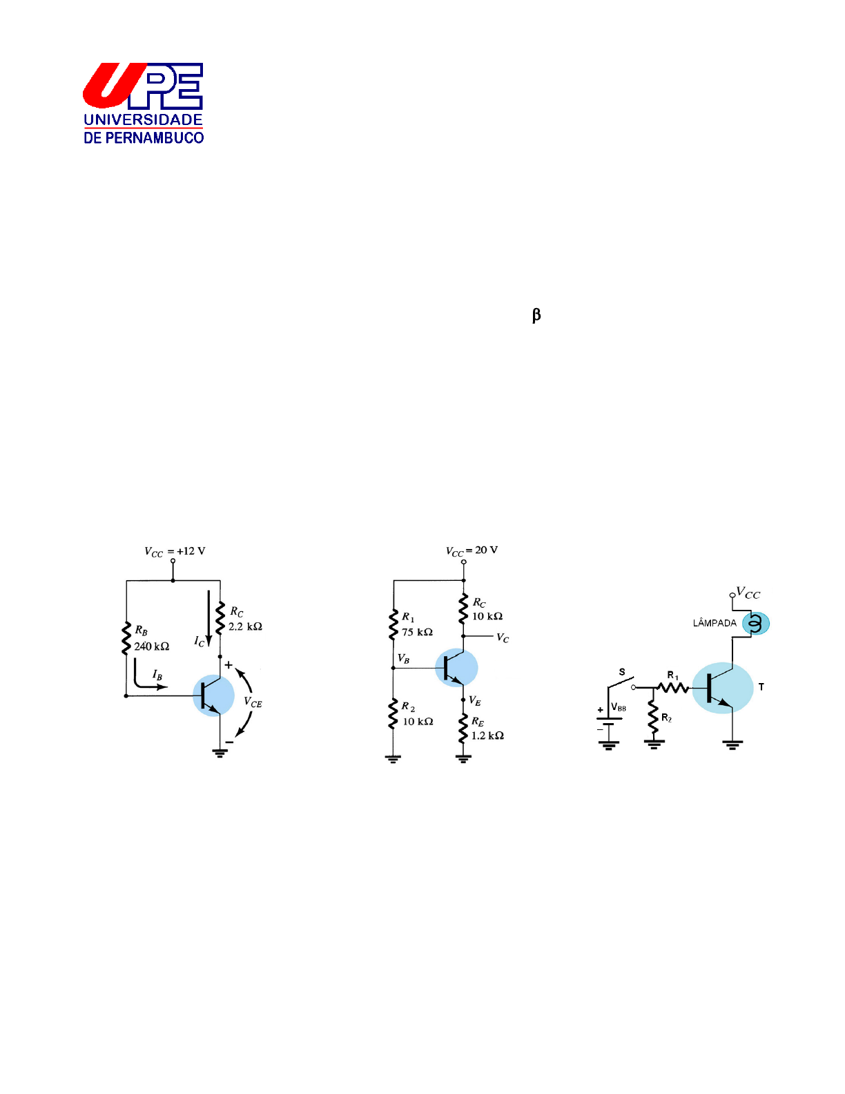 ESCOLA POLITÉCNICA DEPARTAMENTO DE ENGENHARIA ELÉTRICA Prof. FRANCISCO ARNALDO DE OLIVEIRA RUFINO ELETRÔNICA 2 - SEGUNDO EXERCÍCIO ESCOLAR 1) Quais as TRÊS CONDIÇÕES necessárias para que um Transistor Bipolar de Junção (TBJ) funcione na região ativa? 2) Calcular as correntes elétricas IB , IC e IE e as tensões VRC e VCE no circuito eletrônico mostrado na figura 1. Desenhar a RETA DE CARGA, indicando a localização do ponto “Q”. O transistor é de silício e = 60. Qual a região de trabalho do transistor? 3) Calcular: VB, VE, IE, IC,VRC, VCE e VC no circuito eletrônico mostrado na figura 2, utilizando um transistor de silício. Qual a região de trabalho do transistor? Qual o tipo de polarização utilizado? Qual a potência elétrica dissipada pelo transistor? 4) A chave elétrica “ S ” do circuito mostrada na figura 3, pode ligar e desligar a bateria VBB = 2V aos resistores R1 = R2 = 2K2. Sendo o transistor “ T ” o mesmo da questão 3 e observando os demais componentes do circuito, explique detalhadamente como o mesmo funciona. Qual a principal função do resistor R2 ? Figura 1 Figura 2 Figura 3 “Se você ACHA QUE PODE ou QUE NÃO PODE, você está certo.” ( Henry Ford ).