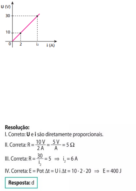 No diagrama a seguir está representada a curva característica de um resistor mantido em temperatura constante. I. O resistor em questão é ôhmico. II. A resistência elétrica do resistor é igual a 5 Ω e isso significa que são necessários 5 volts para produzir nele 1 ampère de corrente. III. A intensidade de corrente i2 indicada no diagrama é igual a 6 A. IV. Se esse resistor for percorrido por uma corrente de 2 A durante 20 s, consumirá 400 J de energia. São corretas as seguintes afirmações: a) Apenas I, II e III. b) Apenas I, II e IV. c) Apenas I e II. d) Apenas I e IV. e) Todas.