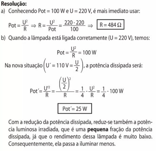 Considere uma lâmpada de incandescência com as seguintes especificações (valores nominais): 100 W–220 V. a) Calcule a resistência elétrica dessa lâmpada operando corretamente. b) Ignorando a variação da resistência elétrica com a temperatura, calcule a potência dissipada pela lâmpada se for ligada a uma rede de 110 V.