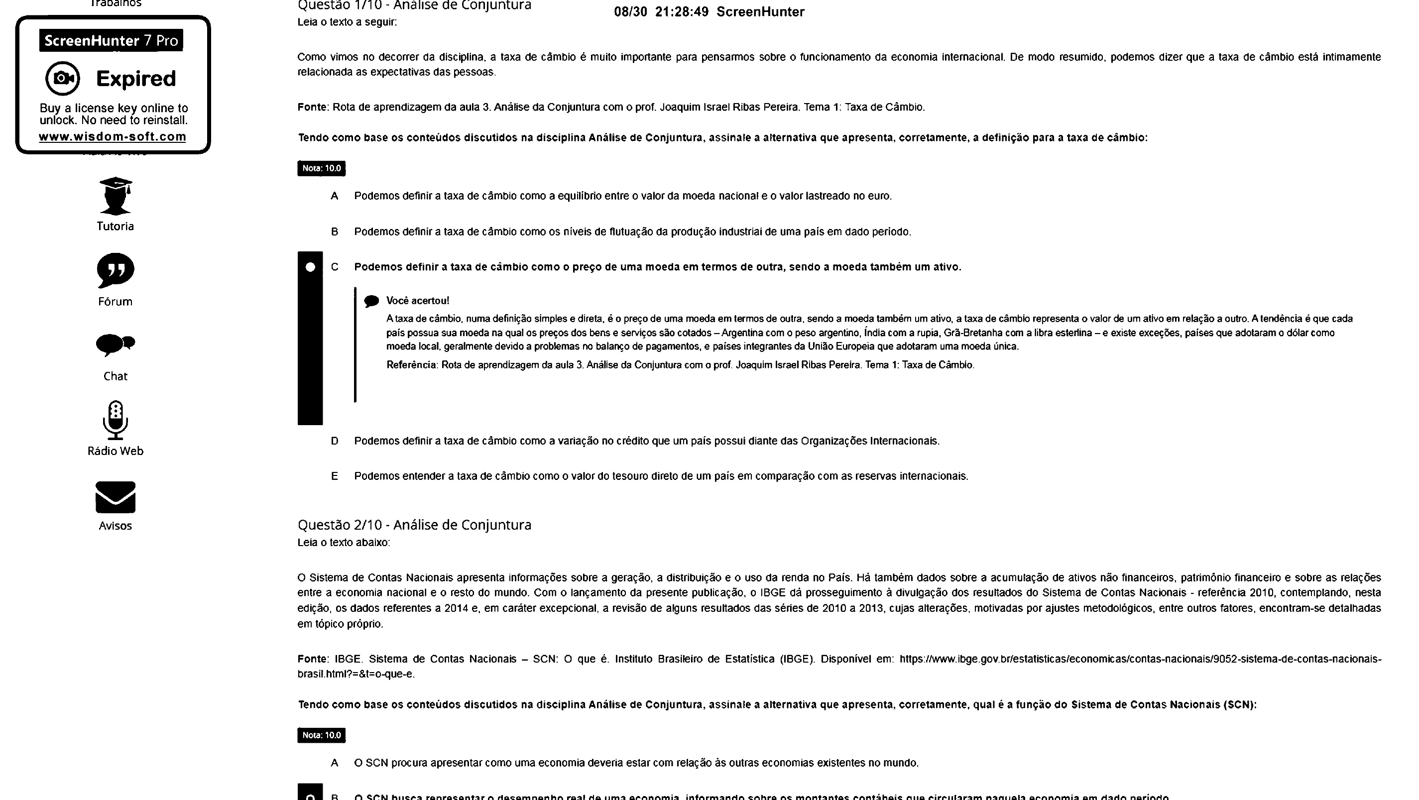 iraDäinos 08/30 21:28:49 ScreenHunter ScreenHunter 7 Pro (3) Expired Buy a license key online to unlock. No need to reinstall. w w w .w is d o m -s o f t .c o m >£■1 Tutoria 0 Fórum Chat Rádio Web Avisos Como vimos no decorrer da disciplina, a taxa de câmbio é muito importante para pensarmos sobre o funcionamento da economia internacional. De modo resumido, podemos dizer que a taxa de câmbio está intimamente relacionada as expectativas das pessoas. Fonte: Rota de aprendizagem da aula 3. Análise da Conjuntura com o prof. Joaquim Israel Ribas Pereira. Tema 1: Taxa de Câmbio. Tendo como base os conteúdos discutidos na disciplina Análise de Conjuntura, assinale a alternativa que apresenta, corretamente, a definição para a taxa de câmbio: Questão i n ü - Analise de conjuntura Leia o texto a seguir: Nota: 10.0 A Podemos definir a taxa de câmbio como a equilíbrio entre o valor da moeda nacional e o valor lastreado no euro. B Podemos definir a taxa de câmbio como os níveis de flutuação da produção industriai de uma país em dado período. C Podemos definir a taxa de câmbio como o preço de uma moeda em termos de outra, sendo a moeda também um ativo. Você aceitou! A taxa de câmbio, numa definição simples e direta, é o preço de uma moeda em termos de outra, sendo a moeda também um ativo, a taxa de câmbio representa o valor de um ativo em relação a outro. A tendência é que cada país possua sua moeda na qual os preços dos bens e serviços são cotados - Argentina com o peso argentino, índia com a rupia, Grã-Bretanha com a libra esterlina - e existe exceções, países que adotaram o dólar como moeda local, geralmente devido a problemas no balanço de pagamentos, e países integrantes da União Europeia que adotaram uma moeda única. Referência: Rota de aprendizagem da aula 3. Análise da Conjuntura com o prof. Joaquim Israel Ribas Pereira. Tema 1: Taxa de Câmbio. D Podemos definir a taxa de câmbio como a variação no crédito que um país possui diante das Organizações Internacionais. E Podemos entender a taxa de câmbio como o valor do tesouro direto de um país em comparação com as reservas internacionais. Questão 2/10 - Análise de Conjuntura Leia o texto abaixo: O Sistema de Contas Nacionais apresenta informações sobre a geração, a distribuição e o uso da renda no País. Há também dados sobre a acumulação de ativos não financeiros, patrimônio financeiro e sobre as relações entre a economia nacional e o resto do mundo. Com o lançamento da presente publicação, o IBGE dá prosseguimento à divulgação dos resultados do Sistema de Contas Nacionais - referência 2010, contemplando, nesta edição, os dados referentes a 2014 e, em caráter excepcional, a revisão de alguns resultados das séries de 2010 a 2013, cujas alterações, motivadas por ajustes metodológicos, entre outros fatores, encontram-se detalhadas em tópico próprio. Fonte: IBGE. Sistema de Contas Nacionais - SCN: O que é. Instituto Brasileiro de Estatística (IBGE). Disponível em: https://www.ibge.gov.br/estatisticas/economicas/contas-nacionais/9052-sistema-de-contas-nacionais- brasil.html?=&t=o-que-e. Tendo como base os conteúdos discutidos na disciplina Análise de Conjuntura, assinale a alternativa que apresenta, corretamente, qual é a função do Sistema de Contas Nacionais (SCN): Nota: 10.0 O SCN procura apresentar como uma economia deveria estar com relação às outras economias existentes no mundo. R D Cí^Kl h iicA a ronrû cû n t.ir r\ H a ca m n a n h n raa I Ha um a a m n A m h infnrm anrtft cn h ra a c m rm tan tac i-A ntáha ic n u a i ' im i la n m n am ia la o m n ^ m ia am HaHst narírtHA http://www.wisdom-soft.com https://www.ibge.gov.br/estatisticas/economicas/contas-nacionais/9052-sistema-de-contas-nacionais-brasil.html?=&t=o-que-e https://www.ibge.gov.br/estatisticas/economicas/contas-nacionais/9052-sistema-de-contas-nacionais-brasil.html?=&t=o-que-e i'iicnc / nMnm \ ScreenHunter 7 Pro (3) Expired Buy a license key online to unlock. No need to reinstall. w w w .w is d o m -s o f t .c o m O Sistema de Contas Nacionais apresenta informações sobre a geração, a distribuição e o uso da renda no País. Há também dados sobre a acumulação de ativos não financeiros, patrimônio financeiro e sobre as relações entre a economia nacional e o resto do mundo. Com o lançamento da presente publicação, o IBGE dá prosseguimento à divulgação dos resultados do Sistema de Contas Nacionais - referência 2010, contemplando, nesta edição, os dados referentes a 2014 e, em caráter excepcional, a revisão de alguns resultados das séries de 2010 a 2013, cujas alterações, motivadas por ajustes metodológicos, entre outros fatores, encontram-se detalhadas em tópico próprio. Fonte: IBGE. Sistema de Contas Nacionais - SCN: O que é. Instituto Brasileiro de Estatística (IBGE). Disponível em: https://www.ibge.gov.br/estatisticas/economicas/contas-nacionais/9052-sistema-de-contas-nacionais- brasil.html?=&t=o-que-e. Tendo como base os conteúdos discutidos na disciplina Análise de Conjuntura, assinale a alternativa que apresenta, corretamente, qual é a função do Sistema de Contas Nacionais (SCN): Questão 2/10-Análise de Conjuntura 08/30 21:28:52 ScreenHunter Leia o texto abaixo: Nota: 10.0 O SCN procura apresentar como uma economia deveria estar com relação às outras economias existentes no mundo. O SCN busca representar o desempenho real de uma economia, informando sobre os montantes contábeis que circularam naquela economia em dado período. ^ Você aceitou! Como explica Simonsen e Cysne (1985), a contabilidade nacional ou o sistema de contas nacionais procura representar o desempenho real de uma economia, ou seja, informar da maneira mais precisa os montantes contábeis que circularam naquela economia em dado período. Referência: Rota de aprendizagem da aula 2. Análise da Conjuntura com o prof. Joaquim Israel Ribas Pereira. Tem
