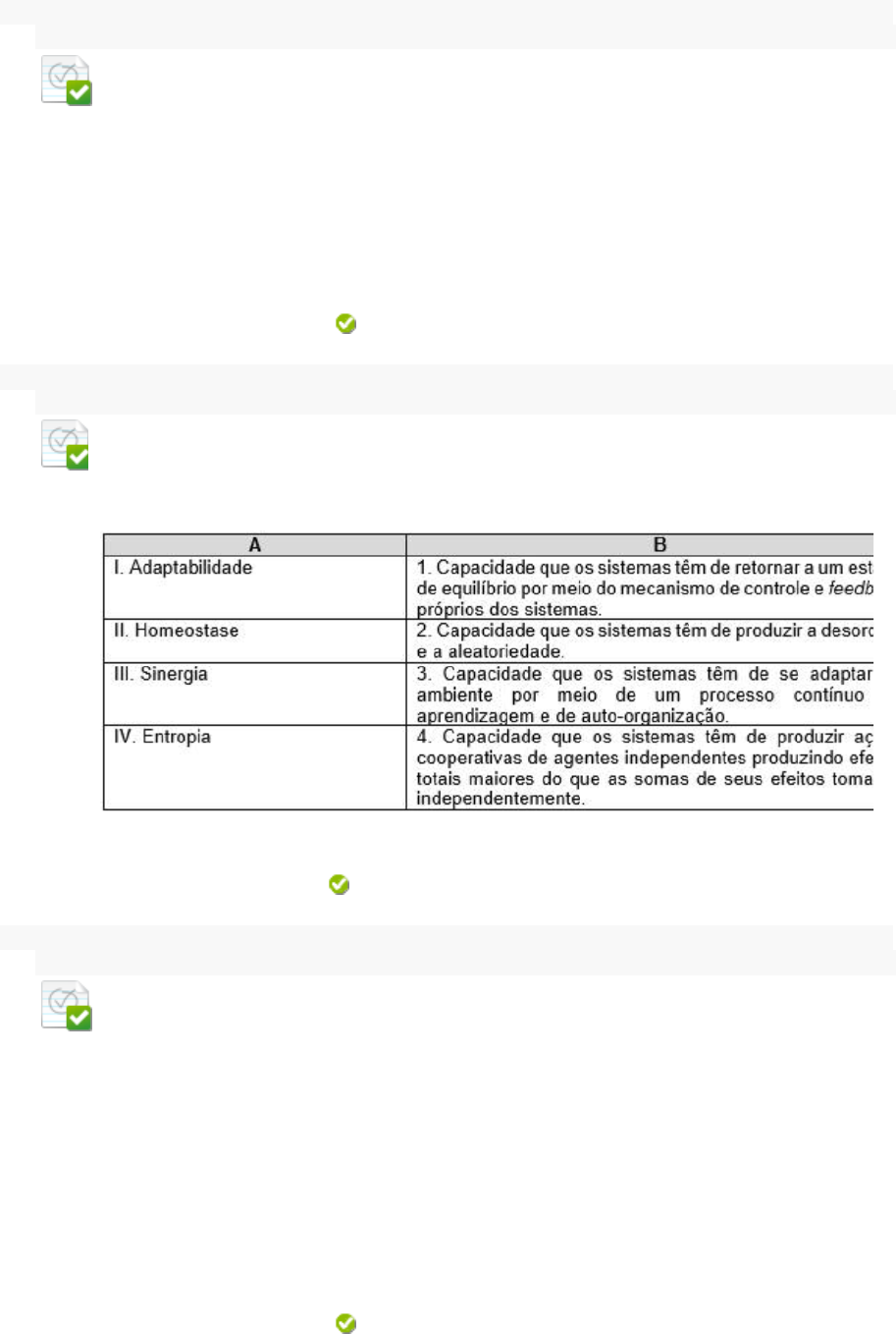 Pergunta 1 0,25 em 0,25 pontos Analise as proposições a seguir sobre os conceitos de sistema: I. Sistema é um conjunto estruturado de partes que se mantêm em interação, na busca da consecução de um ou de vários objetivos; II. Um sistema trabalha com as entradas e as saídas, mas sem a necessidade de um mecanismo de feedback; III. Os elementos que compõe um sistema são chamados de objetos, que atuam, exclusivamente, dentro do sistema, sem sair ou entrar do mesmo. É correto o que se afirma em: Resposta Selecionada: d. I, apenas. Pergunta 2 0,25 em 0,25 pontos Os sistemas, de forma geral, são dotados de propriedades. Alguns autores mencionam, pelo menos, quatro propriedades. Observe o quadro a seguir que apresenta, na coluna A, estas propriedades e, na coluna B, as características delas: Assinale a alternativa que faz a associação correta entre as colunas: Resposta Selecionada: c. I-3, II-1, III-4, IV-2. Pergunta 3 0,25 em 0,25 pontos Analise as proposições a seguir sobre os conceitos e as características dos sistemas de informação: I. Um sistema de informação não pode ser definido como um software, mas como uma infraestrutura completa de TI; II. Os sistemas de informação representam um conjunto de elementos ou de componentes inter‐relacionados que coleta (entrada), manipula (processo), armazena e dissemina os dados (saída) e as informações, e fornece uma reação corretiva (mecanismo de realimentação) para alcançar um objetivo; III. Um dos objetivos dos sistemas de informação é a excelência operacional por meio da redução de custo oriunda da automatização de tarefas. É correto o que se afirma em: Resposta Selecionada: b. II e III, apenas. Pergunta 4 0,25 em 0,25 pontos Ao observamos a concepção, a criação e a utilização de um SI percebemos três dimensões distintas que nos permitem compreender as relações entre um SI no nosso cotidiano. Qual das alternativas a seguir apresenta estas três dimensões? Resposta Selecionada: e. Organizacional, humana e tecnológica. Pergunta 5 0,25 em 0,25 pontos Considerando a classificação dos sistemas de informação, qual das opções a seguir apresenta aquele situado no nível mais estratégico? Resposta Selecionada: d. Sistemas de apoio à decisão. Pergunta 6 0,25 em 0,25 pontos Uma empresa do ramo atacadista, por questões de negócios, decidiu implementar um sistema de informação que permitisse acumular um número de transações operacionais e só, depois, proceder com o processamento dos dados. Qual seria este sistema? Resposta Selecionada: c. SPT Batch. Pergunta 7 0,25 em 0,25 pontos Analise as proposições a seguir sobre os sistemas ERP: I. O ERP opera com os mais diversos bancos de dados para atender aos mais diversos módulos do negócio; II. Os sistemas ERP promovem a integração das organizações sob a perspectiva funcional (envolvendo diversos departamentos) e sob a perspectiva sistêmica; III. O dimensionamento da quantidade e de quais os módulos serão utilizados em um ERP varia de organização para organização, ainda que elas integrem o mesmo ramo de negócio. É correto o que se afirma em: Resposta Selecionada: b. II e III, apenas. Pergunta 8 0,25 em 0,25 pontos Considerando os módulos de um sistema ERP e as suas classificações, qual das alternativas a seguir pode ser um exemplo de um módulo vertical? Resposta Selecionada: e. Módulo de administração de medicamentos e exames em um hospital. Pergunta 9 0,25 em 0,25 pontos Todo o processo de tomada de decisão precisa ser conduzido a partir de um embasamento técnico. Assim, é necessário que seja qual for o tipo de decisão a ser tomada, a qualidade no processo tem ou deve ser, sempre, perseguida. Observe o quadro a seguir que apresenta, na coluna A, as dimensões da qualidade na tomada de decisão e, na coluna B, uma descrição destas dimensões: Assinale a alternativa que faz a associação correta entre as colunas: Resposta Selecionada: b. I-2, II-4, III-1, IV-3. Pergunta 10 0,25 em 0,25 pontos Em uma organização do ramo educacional, percebeu-se a necessidade de resolver um problema não estruturado, que se refere à abertura ou não de turmas e cursos, bem como às suas consequências. Qual é o tipo de sistema de informação a ser utilizado? Resposta Selecionada: d. Sistema de apoio à decisão.