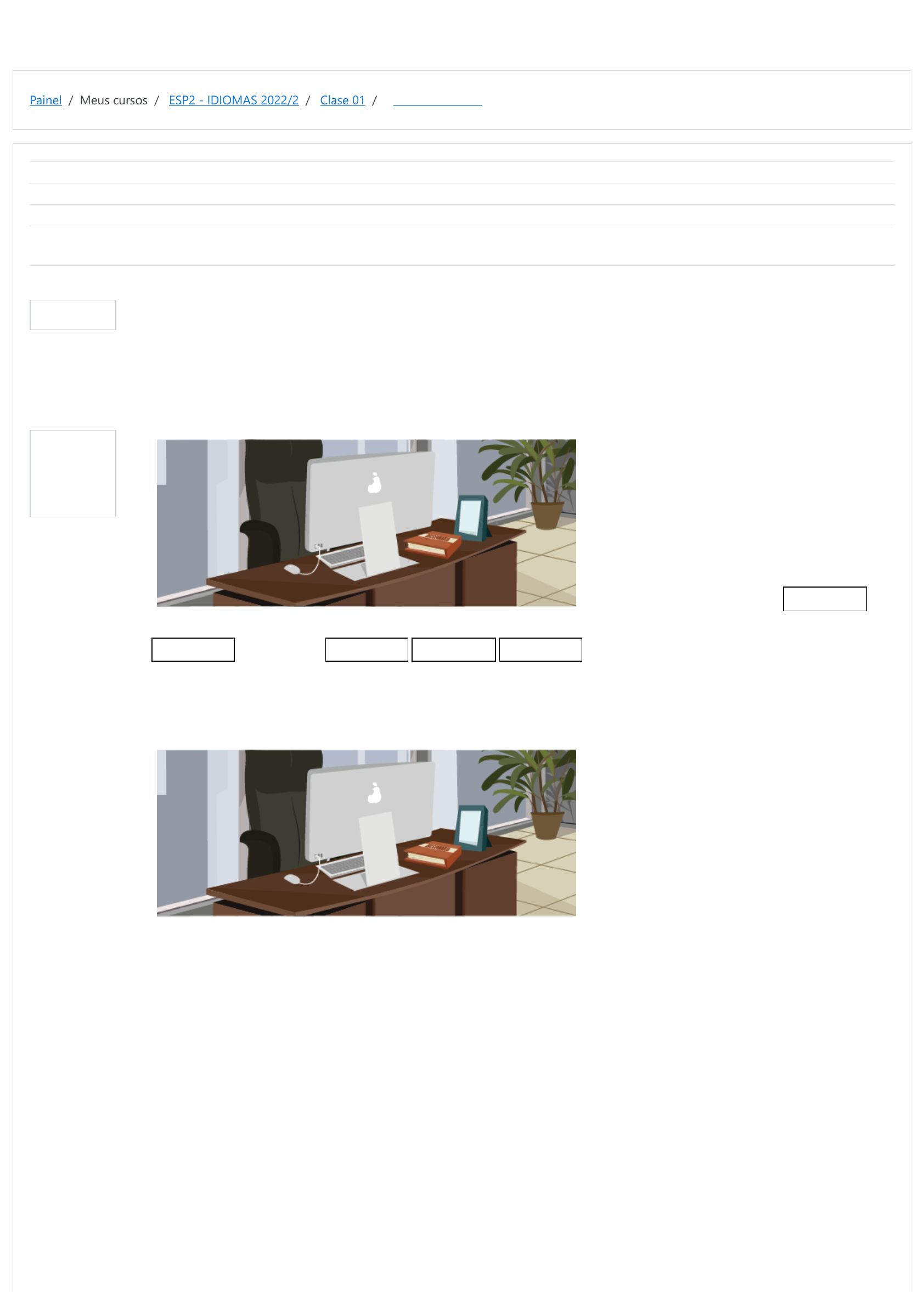 Painel / Meus cursos / ESP2 - IDIOMAS 2022/2 / Clase 01 / ¿Dónde está eso? Informação Questão 1 Correto Atingiu 2,50 de 2,50 Iniciado em terça, 27 set 2022, 21:54 Estado Finalizada Concluída em terça, 27 set 2022, 21:55 Tempo empregado 1 minuto 22 segundos Avaliar 10,00 de um máximo de 10,00(100%) En esta clase estudiaste cómo indicar el lugar de algo a alguien, haciendo uso de las locuciones adverbiales. Observa las imágenes y rellena los espacios en blanco de las oraciones que hay a continuación, con las palabras correspondientes. Si prefieres , utilizas el ratón, está del ordenador. Sua resposta está correta. A resposta correta é: Si prefieres , utilizas el ratón, está [a la derecha] del ordenador. a la izquierda a la derecha aquí abajo al fondo allí arriba https://moodle.ifsul.edu.br/novohamburgo/my/ https://moodle.ifsul.edu.br/novohamburgo/course/view.php?id=317 https://moodle.ifsul.edu.br/novohamburgo/course/view.php?id=317#section-3 https://moodle.ifsul.edu.br/novohamburgo/mod/quiz/view.php?id=50870 Questão 2 Correto Atingiu 2,50 de 2,50 Questão 3 Correto Atingiu 2,50 de 2,50 del despacho hay una papelera. Sua resposta está correta. A resposta correta é: [al fondo] del despacho hay una papelera. están las hojas y las carpetas están . Sua resposta está correta. A resposta correta é: [allí arriba] están las hojas y las carpetas están [aquí abajo]. al fondo a la derecha aquí abajo allí arriba a la izquierda allí arriba al fondo aquí abajo a la izquierda a la derecha Questão 4 Correto Atingiu 2,50 de 2,50 El diccionario está del ordenador. Sua resposta está correta. A resposta correta é: El diccionario está [a la derecha] del ordenador. ◄ ¿Qué hay que hacer? Seguir para... ¡A conectarse! ► a la derecha aquí abajo al fondo a la izquierda allí arriba https://moodle.ifsul.edu.br/novohamburgo/mod/quiz/view.php?id=50869&forceview=1 https://moodle.ifsul.edu.br/novohamburgo/mod/quiz/view.php?id=50871&forceview=1