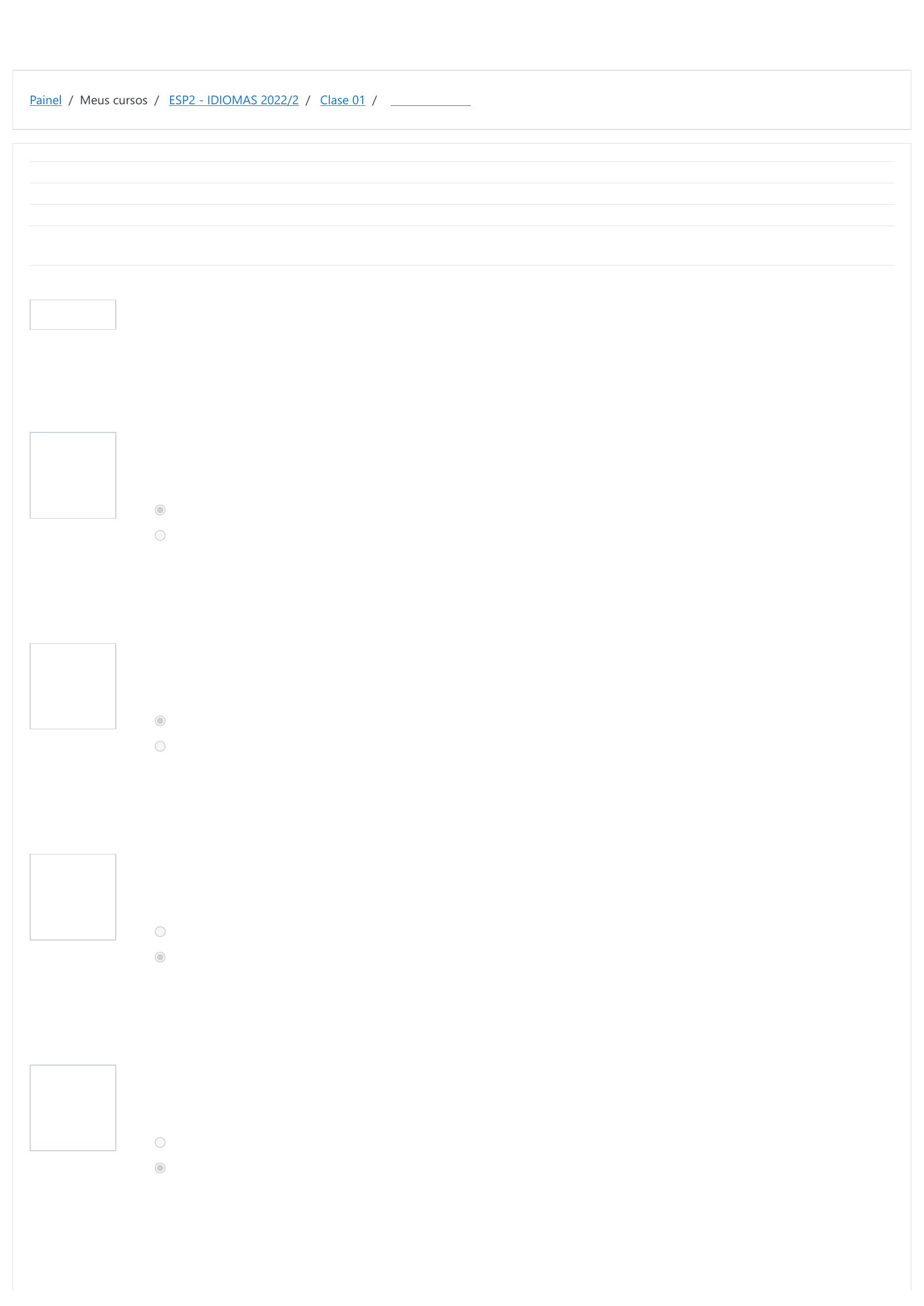 Painel / Meus cursos / ESP2 - IDIOMAS 2022/2 / Clase 01 / ¡A relacionarse! Informação Questão 1 Correto Atingiu 2,00 de 2,00 Questão 2 Correto Atingiu 2,00 de 2,00 Questão 3 Correto Atingiu 2,00 de 2,00 Questão 4 Correto Atingiu 2,00 de 2,00 Iniciado em terça, 27 set 2022, 21:58 Estado Finalizada Concluída em terça, 27 set 2022, 21:59 Tempo empregado 28 segundos Avaliar 10,00 de um máximo de 10,00(100%) En las oraciones, a continuación, hay errores en cuanto al uso de las preposiciones, o sea, faltan o tienen su empleo incorrecto. Marca verdadero para las frases que están escritas de manera correcta o falso para las incorrectas y verifica tus respuestas. Tengo que traducir este artículo para español. Escolha uma opção: Verdadeiro Falso A resposta correta é 'Verdadeiro'. Victoria va a trabajar en la oficina de tu padre. Escolha uma opção: Verdadeiro Falso A resposta correta é 'Verdadeiro'. El congreso fue noticiado al vivo para todo el país. Escolha uma opção: Verdadeiro Falso A resposta correta é 'Falso'. Hemos llegado retrasados pela causa del embotellamiento. Escolha uma opção: Verdadeiro Falso A resposta correta é 'Falso'. https://moodle.ifsul.edu.br/novohamburgo/my/ https://moodle.ifsul.edu.br/novohamburgo/course/view.php?id=317 https://moodle.ifsul.edu.br/novohamburgo/course/view.php?id=317#section-3 https://moodle.ifsul.edu.br/novohamburgo/mod/quiz/view.php?id=50872 Questão 5 Correto Atingiu 2,00 de 2,00 ¿Vas de autobús o de metro? Escolha uma opção: Verdadeiro Falso A resposta correta é 'Falso'. ◄ ¡A conectarse! Seguir para... Hablando en entrevistas ► https://moodle.ifsul.edu.br/novohamburgo/mod/quiz/view.php?id=50871&forceview=1 https://moodle.ifsul.edu.br/novohamburgo/mod/quiz/view.php?id=50874&forceview=1