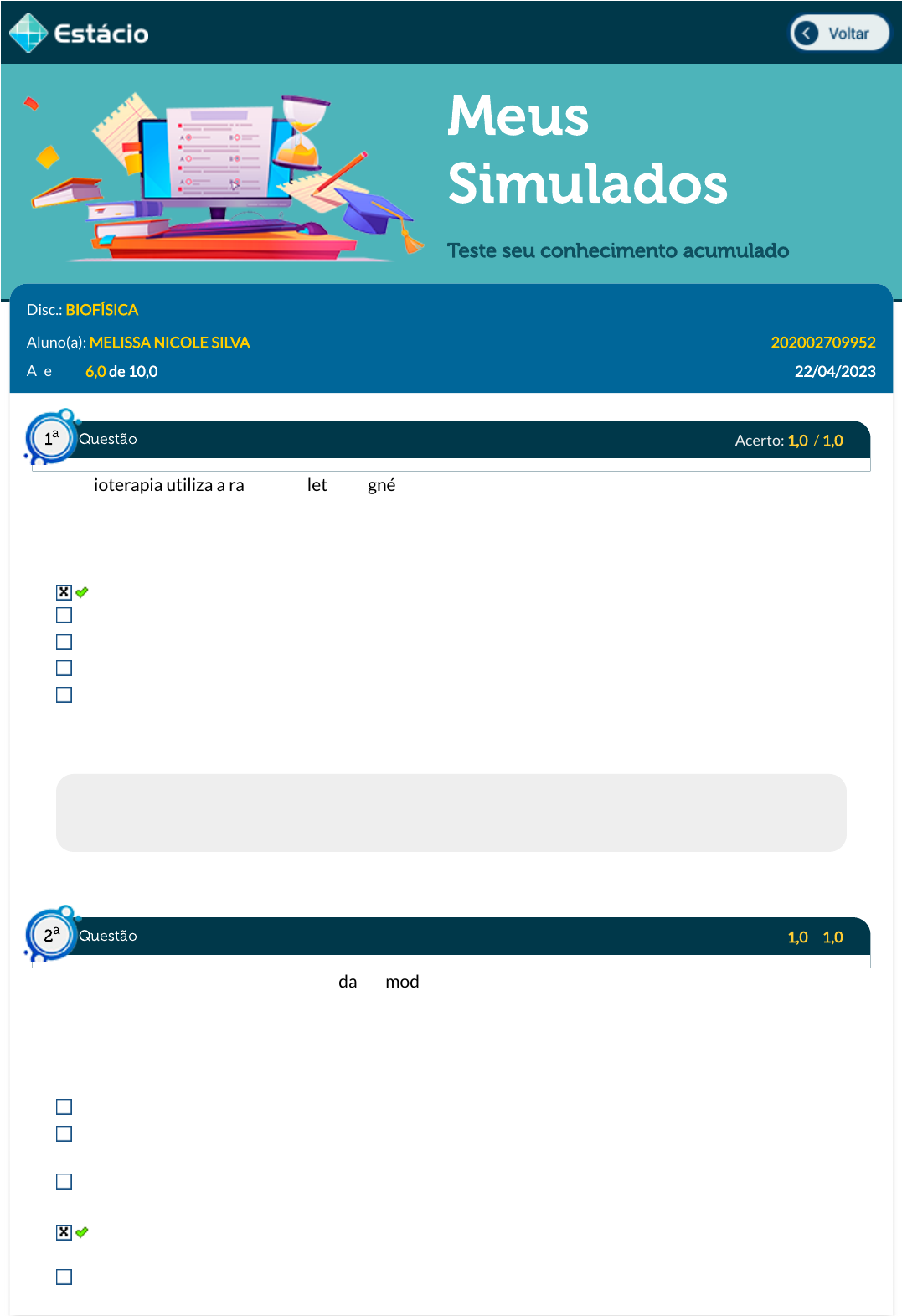 22/04/23, 19:01 Estácio: Alunos https://simulado.estacio.br/alunos/ 1/5 Meus Simulados Teste seu conhecimento acumulado Disc.: BIOFÍSICA Aluno(a): MELISSA NICOLE SILVA 202002709952 Acertos: 6,0 de 10,0 22/04/2023 Acerto: 1,0 / 1,0 A Fisioterapia utiliza a radiação eletromagnética para provocar aumento da temperatura tecidual, o que chamamos de hipertermia. Um dos aparelhos usados é a lâmpada de infravermelho, que emite radiação infravermelha, provocando aquecimento super�cial na pele. Podemos inferir que esse tipo de terapia doa calor para o corpo através de qual mecanismo? Irradiação Evaporação Convecção Condução Transmissão Respondido em 22/04/2023 20:23:20 Explicação: A resposta correta é:Irradiação Acerto: 1,0 / 1,0 "Então, de acordo com a Segunda Lei da Termodinâmica, há sempre uma tendência para as áreas quentes se resfriarem e as áreas frias se aquecerem - assim cada vez menos trabalho poderá ser obtido. Até que �nalmente, quando tudo estiver numa mesma temperatura, você não poderá mais obter nenhum trabalho disso, mesmo que toda a energia continue lá" (Isaac Asimov). Com base no texto, assinale a alternativa correta: Áreas frias no Universo tendem permanecer frias até atingirem o equilíbrio térmico A entropia é o princípio físico que explica o fenômeno de transferência de calor dos corpos quentes para os corpos frios, estando relacionada a Terceira Lei da Termodinâmica No Universo, a energia é criada na forma de calor, que passa sempre de um corpo mais quente para um corpo mais frio Quando ocorre uma transformação termodinâmica, uma parte da energia é aproveitada, e outra é desperdiçada em forma desorganizada e inútil, conhecida como energia térmica A energia no Universo tende a se manter constante com o passar do tempo Respondido em 22/04/2023 20:25:34 Questão1 a Questão2 a https://simulado.estacio.br/alunos/inicio.asp javascript:voltar(); 22/04/23, 19:01 Estácio: Alunos https://simulado.estacio.br/alunos/ 2/5 Explicação: Quando ocorre uma transformação termodinâmica, uma parte da energia é aproveitada, e outra é desperdiçada em forma desorganizada e inútil, conhecida como energia térmica Acerto: 1,0 / 1,0 Os canais iônicos são poros formados por proteínas integrais da dupla camada fosfolipídica da membrana celular. Muitos canais iônicos dos neurônios comportam-se como se fossem um portão que se abre permitindo a passagem de alguns íons em determinadas condições e se fecham em outras. Os canais de potássio estão mais abertos quando a célula está em repouso. Mudanças nos canais iônicos podem alterar esse potencial de repouso fazendo com que canais de sódio se abram. Como consequência desse processo, ocorre uma despolarização da membrana devido à: entrada de íons K+ tornando o meio intracelular menos negativo do que o extracelular saída de íons Na+ tornando o meio extracelular menos negativo do que o intracelular saída de íons K+ tornando o meio intracelular menos negativo do que o extracelular entrada de íons Na+ tornando o meio extracelular menos negativo do que o intracelular entrada de íons Na+ tornando o meio intracelular menos negativo do que o extracelular. Respondido em 22/04/2023 20:30:56 Explicação: A resposta correta é: entrada de íons Na+ tornando o meio intracelular menos negativo do que o extracelular. Acerto: 1,0 / 1,0 Várias substâncias atravessam a membrana plasmática e, com isso, garantem que a célula receba substâncias necessárias para seu funcionamento e elimine produtos para o meio externo. Em alguns casos, o transporte ocorre de maneira passiva, porém, em outros, o transporte é ativo e caracteriza-se: por ocorrer a favor do gradiente de concentração. por independer do gradiente de concentração. por envolver gasto de energia. por ocorrer sem gasto de ATP. por não ocorrer em células animais. Respondido em 22/04/2023 20:31:26 Explicação: A reposta correta é: por envolver gasto de energia. Acerto: 0,0 / 1,0 Questão3 a Questão4 a Questão5 a 22/04/23, 19:01 Estácio: Alunos https://simulado.estacio.br/alunos/ 3/5 Uma onda com frequência de 50 kHz está na faixa do: Nenhuma das alternativas Ultrassom Infrassom Som audível grave Som audível agudo Respondido em 22/04/2023 20:32:11 Explicação: A resposta correta é: Ultrassom Acerto: 0,0 / 1,0 Ondas sonoras com frequências acima de 20 kHz são chamadas de ultrassom (ondas ultrassonoras). Após a Segunda Guerra Mundial, o alto desenvolvimento das técnicas de sonar e radar estimulou o uso de sons acústicos no corpo humano. Os irmãos Dussik (Karl Theodore e Friederich Dussik) foram os primeiros a usar a US para �ns diagnósticos, tentando localizar tumores cerebrais por meio de imagens de atenuação por transmissão de US. As ondas de ultrassom podem ser produzidas através da estimulação elétrica de materiais que possuem a capacidade de transformarem energia elétrica em energia mecânica (vibração), e por isso são chamados materiais: Mecanomagnéticos Hidromagnéticos Mecanoelétricos Piezoelétricos Piezomagnéticos Respondido em 22/04/2023 20:32:41 Explicação: A resposta correta é: Piezoelétricos Acerto: 1,0 / 1,0 A descrição abaixo refere-se a qual classe de alavancas? ¿São caracterizadas pelo fato do fulcro estar localizado entre a força motriz e a resistência. No corpo humano, tais alavancas podem ser exempli�cadas pela movimentação dos músculos agonistas e antagonistas nas direções opostas em relação a uma articulação". Interpotente. Interresistente. Intermitente. Intermóvel. Inter�xa. Respondido em 22/04/2023 20:33:31 Questão6 a Questão7 a 22/04/23, 19:01 Estácio: Alunos https://simulado.estacio.br/alunos/ 4/5 Explicação: A resposta correta é: Inter�xa. Acerto: 1,0 / 1,0 A respeito dos sistemas de alavancas comuns à área da biomecânica, assinale a opção correta. Nas alavancas de primeira classe, também denominadas inter�xas, o ponto d