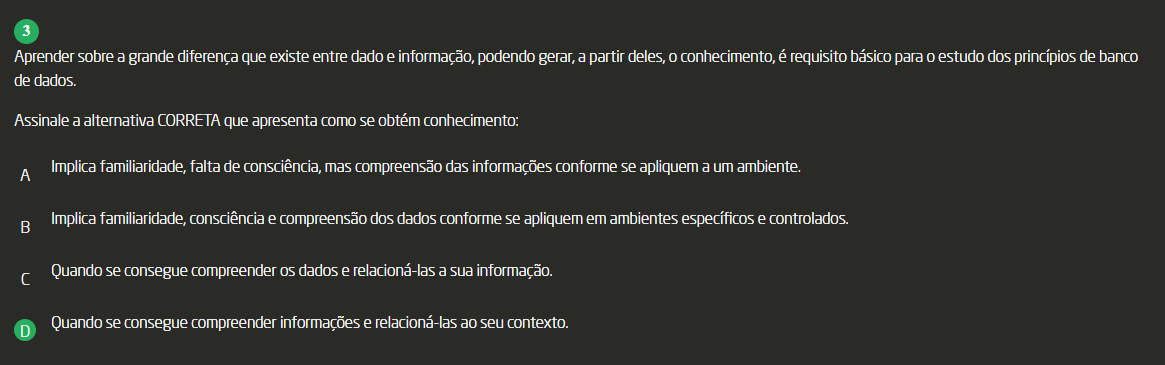 Aprender sobre a grande diferença que existe entre dado e informação, podendo gerar, a partir deles, conhecimento, é requisito básico para estudo dos princípios de banco de dados. Assinale a alternativa CORRETA que apresenta como se obtém conhecimento: A Implica familiaridade, falta de consciência, mas compreensão das informações conforme se apliquem a um ambiente. B Implica familiaridade, consciência e compreensão dos dados conforme se apliquem em ambientes específicos e controlados. Quando se consegue compreender dados e relacioná-las a sua informação. C Quando se consegue compreender informações e relacioná-las ao seu contexto.