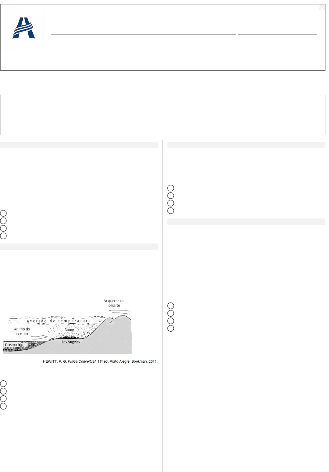 COLÉGIO ADVENTISTA DE CAMPO GRANDE Aluno(a): Matrícula: Data: Turma: Bimestre: Professor(a): Disciplina: Nota: Hidrostática 23/03/2020 Orientações a serem seguidas: 1° Assistam os vídeos sugeridos. 2° Leiam os módulos 1, 2 e 3. 3° Leiam os resumos do caderno 4° Respondam as questões da lista de exercícios online (UERJ) a b c d (UFU) a b c d (USS) a b c d (UEMG) a b c d Questão 1 Uma barca para transportar automóveis entre as margens de um rio, quando vazia, tem volume igual a 100 m 3 e massa igual a 4,0 × 10 4 kg. Considere que todos os automóveis transportados tenham a mesma massa de 1,5 × 10 3 kg e que a densidade da água seja de 1000 kg × m -3 . O número máximo de automóveis que podem ser simultaneamente transportados pela barca corresponde a: 10 40 80 120 Questão 2 Em Los Angeles, Estados Unidos, fumaça e outros poluentes atmosféricos constituem o smog, que fica aprisionado sobre a cidade, devido a um fenômeno chamado “Inversão de temperatura”. Isso ocorre quando o ar frio e de baixa altitude, vindo do oceano, é retido sob o ar quente que se move por cima das montanhas, vindo do deserto de Mojave. O fenômeno é representado no esquema a seguir: A principal propriedade física do smog, que dificulta sua dispersão, é sua umidade relativa. seu calor específico. sua densidade. seu coeficiente de dilatação volumétrico. Questão 3 Uma empresa de coleta de embalagens descartadas utiliza uma prensa hidráulica para a compactação desse material. A prensa tem dois êmbolos de áreas iguais a 25 cm 2 e 180 cm 2 . Sabendo que no êmbolo menor é aplicada uma força de 40 N, a força, em newtons, transmitida ao êmbolo maior é igual a: 150 255 288 312 Questão 4 Densidade Quando me centro em mim, cresce a minha densidade. Mais massa no mesmo volume das minhas possibilidades. Cheio, deixo de flutuar. htttp://www.spq.pt/. Acesso em 20/7/2014 Se, no contexto do poema, os versos acima fossem relacionados a um objeto sólido, este flutuaria, se colocado num líquido de menor densidade. este afundaria, se colocado num líquido de maior densidade. este afundaria, se colocado num líquido de menor densidade. este flutuaria, independentemente da densidade do líquido. (ENEM PPL) a b c d e (IFSul) a b c d (UFRN) a b c d (UnB) a b Questão 5 O acúmulo de plásticos na natureza pode levar a impactos ambientais negativos, tanto em ambientes terrestres quanto aquáticos. Uma das formas de minimizar esse problema é a reciclagem, para a qual é necessária a separação dos diferentes tipos de plásticos. Em um processo de separação foi proposto o seguinte procedimento: I. Coloque a mistura de plásticos picados em um tanque e acrescente água até a metade da sua capacidade. II. Mantenha essa mistura em repouso por cerca de 10 minutos. III. Retire os pedaços que flutuaram e transfira-os para outro tanque com uma solução de álcool. IV. Coloque os pedaços sedimentados em outro tanque com solução de sal e agite bem. Qual propriedade da matéria possibilita a utilização do procedimento descrito? Massa. Volume. Densidade. Porosidade. Maleabilidade. Questão 6 Em uma balança de pratos, ilustrada pela figura ao lado, colocamos em um de seus pratos um recipiente de massa desprezível, contendo 1 litro de mercúrio, cuja densidade é 13,6 g/cm 3 , e no outro prato um recipiente, também de massa desprezível, contendo certo volume de água, cuja densidade é 1 g/cm 3 . Para que a balança tenha a horizontal como posição de equilíbrio, o volume de água contido no segundo recipiente é de 1 litro. 6,8 litros. 13,6 litros. 27,2 litros. Questão 7 Numa estação de tratamento de água para consumo humano, durante uma das etapas do tratamento, a água passa por tanques de cimento e recebe produtos como sulfato de alumínio e hidróxido de cálcio. Essas substâncias fazem as partículas finas de impurezas presentes na água se juntarem, formando partículas maiores e mais pesadas, que se vão depositando, aos poucos, no fundo do tanque. Após algumas horas nesse tanque, a água que fica sobre as impurezas, e que está mais limpa, é passada para outro tanque, onde o tratamento continua. As partículas maiores e mais pesadas se depositam no fundo do tanque porque o peso delas é menor que o empuxo exercido sobre elas. delas é maior que o empuxo exercido sobre elas. do líquido deslocado é maior que o empuxo. do líquido deslocado é menor que o empuxo. Questão 8 Considere que, nos cefalópodes marinhos descritos no texto, o deslocamento seja realizado com o auxílio de uma estrutura que, por meio de contrações, implementa uma espécie de propulsão a jato, expelindo parte da água do mar contida em seu interior. De maneira simplificada, essa estrutura pode ser modelada por um cone circular reto, e, no processo de contração, o raio da base do cone diminui, e sua altura permanece constante, mantendo-se a forma de um cone circular reto. Considere, ainda, uma situação hipotética em que a redução do raio da base do cone de um cefalópode seja de 3 cm para 1 cm, ao final do processo de contração; a altura do cone seja de 12 cm; e toda a água contida no interior do cone seja expelida instantaneamente à velocidade de 1 m/s. Nessa situação, faça o que se pede no item a seguir, que é do tipo B, desprezando, para a marcação na folha de respostas, a parte fracionária do resultado final obtido, após efetuados todos os cálculos solicitados. Calcule, em cm/s, a variação de velocidade máxima que o cefalópode descrito pode obter, ao final de um processo de contração, caso a massa total do cefalópode, na situação anterior ao início da expulsão da água, seja de 400 g e a densidade da água no local, de 1 g/cm 3 . CERTO ERRADO