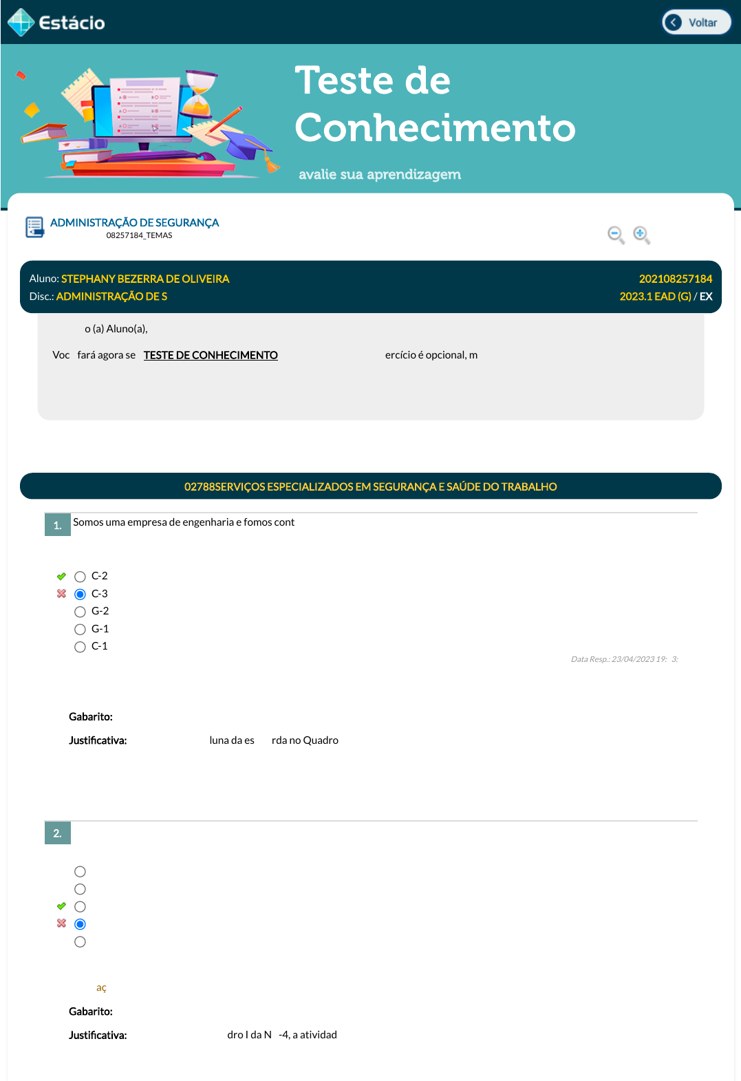 23/04/2023, 19:44 Estácio: Alunos https://simulado.estacio.br/alunos/ 1/5 Teste de Conhecimento avalie sua aprendizagem Somos uma empresa de engenharia e fomos contratados para elaborar um estudo de implantação de uma CIPA. Antes da reunião, o cliente nos informou que a empresa possui CNAE 10.11-2. Com apenas essa informação, e utilizando o quadro III da NR-05, identi�que a seguir qual o Grupo de Risco da atividade principal desta empresa: Fomos contratados para auxiliar uma empresa de cultivo de café na região mineira do Brasil. Utilizando o quadro I da NR-04, identi�que a seguir qual é o grau de risco desta atividade: ADMINISTRAÇÃO DE SEGURANÇA Lupa DGT0856_202108257184_TEMAS Aluno: STEPHANY BEZERRA DE OLIVEIRA Matr.: 202108257184 Disc.: ADMINISTRAÇÃO DE S 2023.1 EAD (G) / EX Prezado (a) Aluno(a), Você fará agora seu TESTE DE CONHECIMENTO! Lembre-se que este exercício é opcional, mas não valerá ponto para sua avaliação. O mesmo será composto de questões de múltipla escolha. Após responde cada questão, você terá acesso ao gabarito comentado e/ou à explicação da mesma. Aproveite para se familiarizar com este modelo de questões que será usado na sua AV e AVS. 02788SERVIÇOS ESPECIALIZADOS EM SEGURANÇA E SAÚDE DO TRABALHO 1. C-2 C-3 G-2 G-1 C-1 Data Resp.: 23/04/2023 19:43:59 Explicação: Gabarito: C-2 Justi�cativa: Identi�cada na coluna da esquerda no Quadro III da NR-05, pertence ao Grupo C-2, veri�cado na coluna da direita, e, portanto, as demais opções estarão erradas. 2. 4 2 3 1 5 Data Resp.: 23/04/2023 19:44:10 Explicação: Gabarito: 3 Justi�cativa: De acordo com o Quadro I da NR-4, a atividade Cultivo de Café é enquadrada com o Grau de Risco 3, conforme é visto na coluna da direita, e, portanto, as demais opções estarão erradas. javascript:voltar(); javascript:voltar(); javascript:diminui(); javascript:aumenta(); 23/04/2023, 19:44 Estácio: Alunos https://simulado.estacio.br/alunos/ 2/5 Para aferir posteriormente os custos indiretos de um acidente de trabalho, o contador de uma empresa fez o cálculo custos por absorção de uma unidade de produção, para tanto o mesmo deve somar custos diretos e custos indiretos, que são, respectivamente: Segundo a NR 01 - Disposições Gerais, cabe ao empregador implementar medidas de prevenção, ouvidos os trabalhadores, de acordo com a seguinte ordem de prioridade: (Pref. Cascavel/PR/2020) A manutenção que ocorre em intervalos regulares de tempo, independentemente do desempenho do equipamento ou mecanismo, de acordo com um planejamento com base em estudos estatísticos, estado do equipamento, local de instalação, condições elétricas que o suprem, dados os fabricantes. Marque a alternativa que apresenta esse tipo de manutenção. 02503GESTÃO DE SEGURANÇA E SAÚDE DO TRABALHO 3. pessoal e energia elétrica material de limpeza e telefone água e limpeza material de consumo e matéria-prima pessoal e matéria-prima Data Resp.: 23/04/2023 19:44:16 Explicação: Pelo método de absorção os custos com pessoal, assim como pessoas, limpeza e matéria-prima são custos diretamente envolvidos em cada produto ou serviço, logo são diretos. O custo com energia elétrica terá que ser dividido por toda a empresa (custos indiretos),assim como o telefone e os gastos com água. 4. Eliminação dos fatores de risco; adoção de medidas de proteção individual; minimização e controle dos fatores de risco, com a adoção de medidas de proteção coletiva; minimização e controle dos fatores de risco, com a adoção de medidas administrativas ou de organização do trabalho. Minimização e controle dos fatores de risco, com a adoção de medidas administrativas ou de organização do trabalho; minimização e controle dos fatores de risco, com a adoção de medidas de proteção coletiva; eliminação dos fatores de risco; e adoção de medidas de proteção individual. Eliminação dos fatores de risco; minimização e controle dos fatores de risco, com a adoção de medidas de proteção coletiva; minimização e controle dos fatores de risco, com a adoção de medidas administrativas ou de organização do trabalho; e adoção de medidas de proteção individual. Adoção de medidas de proteção individual; minimização e controle dos fatores de risco, com a adoção de medidas de proteção coletiva; minimização e controle dos fatores de risco, com a adoção de medidas administrativas ou de organização do trabalho; e eliminação dos fatores de risco. Minimização e controle dos fatores de risco, com a adoção de medidas de proteção coletiva; minimização e controle dos fatores de risco, com a adoção de medidas administrativas ou de organização do trabalho; adoção de medidas de proteção individual; e eliminação dos fatores de risco. Data Resp.: 23/04/2023 19:44:22 Explicação: existe uma sequência com as prioridades a serem colocadas em prática em um programa de gerenciamento de riscos, a sequência é eliminação dos fatores de risco; minimização e controle dos fatores de risco, com a adoção de medidas de proteção coletiva; minimização e controle dos fatores de risco, com a adoção de medidas administrativas ou de organização do trabalho; e adoção de medidas de proteção individual. 02290AS RELAÇÕES DO SESMT NAS ORGANIZAÇÕES 5. detectiva. não planejada. preditiva. preventiva. corretiva. Data Resp.: 23/04/2023 19:44:27 Explicação: 23/04/2023, 19:44 Estácio: Alunos https://simulado.estacio.br/alunos/ 3/5 Dentre as manutenções que se apresentem, a qual corresponde ao tipo de manutenção que realiza acompanhamento periódico, com base em coleta de dados dos equipamentos em produção, sendo esta realizada de forma com que a inspeção ou monitoramento sejam dinâmicos. Marque a a�rmação correta sobre a e�cácia e a e�ciência operacional em relação a produção: A primeira revolução industrial provocou grandes mudanças no tr