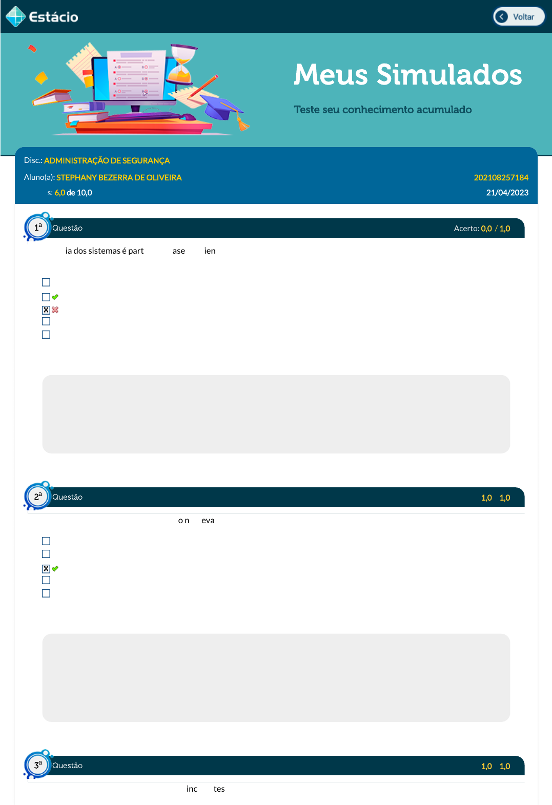 23/04/2023, 19:33 Estácio: Alunos https://simulado.estacio.br/alunos/ 1/5 Meus Simulados Teste seu conhecimento acumulado Disc.: ADMINISTRAÇÃO DE SEGURANÇA Aluno(a): STEPHANY BEZERRA DE OLIVEIRA 202108257184 Acertos: 6,0 de 10,0 21/04/2023 Acerto: 0,0 / 1,0 A teoria dos sistemas é parte da ênfase Ambiente. Ela estabelece que a empresa pode ser percebida como um sistema. Ao adotá-la, uma organização poderá: Prioriza a preocupação com as necessidades e os relacionamentos das pessoas. Melhorar as interações com os componentes do ambiente de negócios. Melhora a capacidade de adaptação da empresa as variações do meio ambiente. Melhorar a sua estrutura corporativa de sistemas de informação. Atuar sobre o comportamento individual dos trabalhadores. Respondido em 21/04/2023 09:13:48 Explicação: A Teoria dos Sistemas leva as organizações a se perceberem como participantes de um grande sistema que reúne todos os participantes do setor de negócios onde atua, e com os quais mantém interações. Com esse entendimento, as empresas podem melhorá-las. Sobre as outras opções: não é um tema de informática; refere-se à teoria comportamental; melhoria da capacidade de adaptação à variações do meio ambiente refere-se à Teoria da Contingência; priorizar a preocupação com as necessidades e os relacionamentos das pessoas refere-se à Teoria da Relações Humanas Acerto: 1,0 / 1,0 O estudo das teorias da administração nos leva a crer que as empresas, para alcançar o sucesso, precisam procurar: Não contar com as pessoas para alcançar esse sucesso empresarial. Buscar apenas estratégias vencedoras e que não apresentem riscos. Adotar a melhor estratégia e os melhores recursos que puder, aceitando os riscos. Seguir uma série de roteiros formulados para administrar cada indústria. Nunca tomar decisões que apesentem riscos de falhas ou perdas para a empresa. Respondido em 21/04/2023 09:15:36 Explicação: Não há roteiros prontos para o sucesso ou a tomada de decisão sem riscos de insucesso. São muitas as variáveis internas e externas da empresa que podem afetar a chances de sucesso. As empresas precisam buscar as melhores estratégias que considerar adequadas, e alocar os melhores recursos que dispor. Assim elas terão mais chances de sucesso, mas ainda haverá riscos de insucesso. Sobre as demais opções: (a) Não existem esses roteiros para administrar cada indústria; (b) Todas as decisões envolvem riscos de sucesso ou insucesso; (d) Todas as estratégias apresentam riscos; (e) As pessoas são fundamentais pois são elas que tomam as decisões e assumem os riscos. Acerto: 1,0 / 1,0 Na elaboração do PCMSO, as questões incidentes sobre o trabalhador individualmente como também sobre a coletividade de trabalhadores deverão ser consideradas, privilegiando o instrumental clínico-epidemiológico na abordagem da relação entre Questão1 a Questão2 a Questão3 a https://simulado.estacio.br/alunos/inicio.asp javascript:voltar(); 23/04/2023, 19:33 Estácio: Alunos https://simulado.estacio.br/alunos/ 2/5 sua saúde e o trabalho. Identi�que a seguir um tema que deve ser incluído: Veri�cação e combate à Covid-19 junto aos trabalhadores Rastreamento e diagnóstico precoce dos agravos à saúde relacionados ao trabalho Só podem ser previstas as doenças possíveis de acometer os trabalhadores Ter caráter emergencial Buscar soluções para os incidentes Respondido em 21/04/2023 09:18:23 Explicação: Gabarito: Rastreamento e diagnóstico precoce dos agravos à saúde relacionados ao trabalho Justi�cativa: Conforme determina a NR-07, na elaboração do PCMSO, as questões incidentes sobre o trabalhador individualmente como também a coletividade de trabalhadores, deverão ser consideradas privilegiando o instrumental clínico-epidemiológico na abordagem da relação entre sua saúde e o trabalho. Esse programa deverá possuir os seguintes temas: Caráter de prevenção; Rastreamento e diagnóstico precoce dos agravos à saúde relacionados ao trabalho, inclusive os agravos à saúde de natureza subclínica; Constatação da existência de casos de doenças pro�ssionais; Danos irreversíveis à saúde dos trabalhadores. Acerto: 0,0 / 1,0 Conforme determina a NR-07 na elaboração do PCMSO, indique a seguir o que está diretamente relacionado aos exames complementares realizados pelos trabalhadores no quadro I: Rigor do médico Agentes Riscos Capacidade �nanceira da empresa Idade do trabalhador Respondido em 21/04/2023 09:20:12 Explicação: Gabarito: Agentes Justi�cativa: Conforme determina a NR-07, em seu Quadro I, devem ser considerados os Agentes para serem determinados quais exames complementares mínimos deverão ser exigidos. Não fazendo nenhuma alteração para essa determinação os Riscos (serão considerados no Quadro II); a idade do trabalhador; a capacidade �nanceira da empresa; ou o rigor do médico. Acerto: 1,0 / 1,0 Sobre os Serviços Especializados em Engenharia de Segurança e Medicina do Trabalho (SESMT) e a Comissão Interna de Prevenção de Acidentes (CIPA), a�rma-se que (PETROBRAS/2011) cabe ao SESMT elaborar mapa de riscos, com a assessoria da CIPA. tanto o SESMT quanto a CIPA fazem inspeções de segurança quantitativas cabe à CIPA promover anualmente, em conjunto com o SESMT, onde houver, a Semana Interna de Prevenção de Acidentes de Trabalho - Sipat. é obrigatória a presença de pro�ssional do SESMT entre os membros titulares da CIPA, designados pelo empregador compete ao SESMT recomendar ao empregador o EPI adequado ao risco existente; nas empresas desobrigadas a constituir estes serviços, essa competência será da SRTE. Respondido em 21/04/2023 09:22:00 Explicação: dentre as competências da CIPA, há a responsabilidade na elaboração da Semana Interna de Prevenção de Acidentes de Trabalho, mas a elaboração da SIPAT será feita em conjunto com a equipe SESMT. Questão4 a Questão5 a 23/04/2023, 19