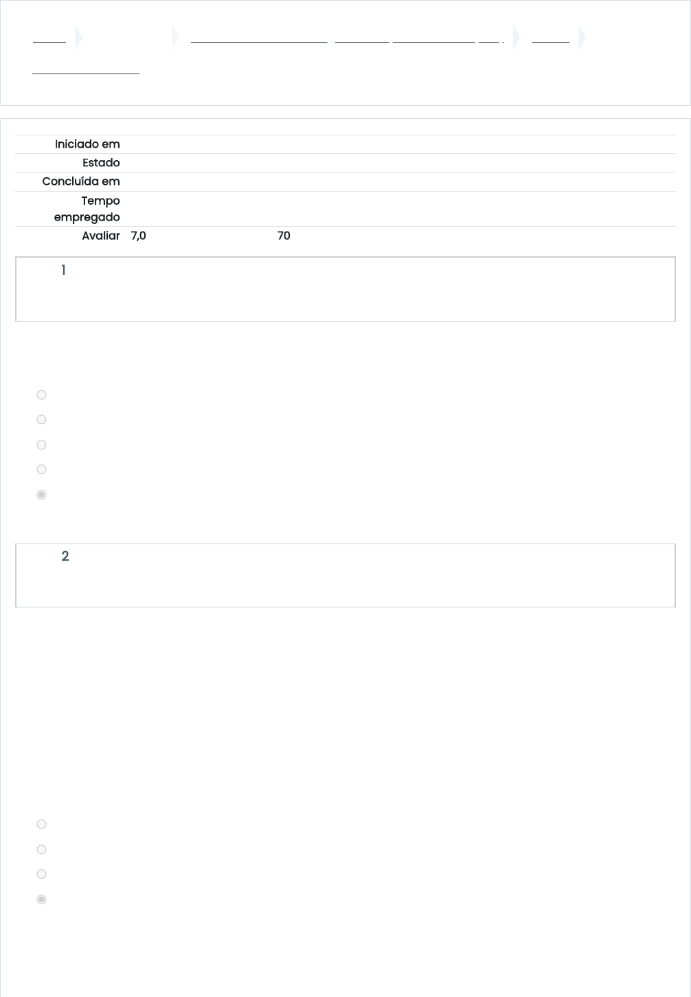 24/04/2023, 08:20 Prova Bimestral - P1: Revisão da tentativa https://www.moodle.fsa.br/mod/quiz/review.php?attempt=13990&cmid=7987 1/6 ; Painel Meus cursos TG_2023_1SEM Metodologia da Pesquisa Científica (EAD) Provas Prova Bimestral - P1 Iniciado em quarta, 19 abr 2023, 16:24 Estado Finalizada Concluída em quarta, 19 abr 2023, 17:04 Tempo empregado 40 minutos 11 segundos Avaliar 7,0 de um máximo de 10,0(70%) Questão 1 Correto Atingiu 1,0 de 1,0 Questão 2 Correto Atingiu 1,0 de 1,0 A maneira pela qual se realiza uma pesquisa e cria-se ciência denomina-se: Método criacionista. Modus operandi. Senso comum. Método acadêmico. Método científico. Avalie as seguintes asserções e a relação proposta entre elas. I. Na pesquisa quantitativa, são utilizadas ferramentas como questionários e software para geração de estatísticas com base na coleta de dados. PORQUE II. Na pesquisa quantitativa, o pesquisador não analisa e nem interpreta os resultados, mas, simplesmente os constata por meio dos números. A respeito dessas asserções, assinale a opção correta. A asserção I é uma proposição verdadeira, e a II é uma proposição falsa. As asserções I e II são proposições verdadeiras, mas a II não é uma justificativa da I. A asserção I é uma proposição falsa, e a II é uma proposição verdadeira. As asserções I e II são proposições verdadeiras, e a II é uma justificativa da I. https://www.moodle.fsa.br/my/ https://www.moodle.fsa.br/course/view.php?id=509 https://www.moodle.fsa.br/course/view.php?id=509§ion=6 https://www.moodle.fsa.br/mod/quiz/view.php?id=7987 24/04/2023, 08:20 Prova Bimestral - P1: Revisão da tentativa https://www.moodle.fsa.br/mod/quiz/review.php?attempt=13990&cmid=7987 2/6 Questão 3 Incorreto Atingiu 0,0 de 1,0 Questão 4 Correto Atingiu 1,0 de 1,0 O censo ou recenseamento demográfico é um estudo estatístico referente a uma população que possibilita o recolhimento de várias informações, tais como o número de homens, mulheres, crianças e idosos, onde e como vivem as pessoas. Esse estudo é realizado, normalmente, de dez em dez anos, na maioria dos países. O censo populacional do IBGE – Instituto Brasileiro de Geografia e Estatística é uma pesquisa do tipo: Qualitativa e aplicada. Quali-quanti (método misto). Quantitativa e aplicada. Qualitativa e básica. Quantitativa e básica. O Discurso Sobre o Método, por vezes traduzido como Discurso do Método, ou ainda 'Discurso Sobre o Método Para Bem Conduzir a Razão na Busca da verdade Dentro da Ciência', é um tratado matemático e filosófico publicado em Leiden, Holanda, em 1637. É nesta obra que se dá criação do método científico, atribuída ao autor: Max Weber. René Descartes. Michel Foucault. Immanuel Kant. Albert Einstein. 24/04/2023, 08:20 Prova Bimestral - P1: Revisão da tentativa https://www.moodle.fsa.br/mod/quiz/review.php?attempt=13990&cmid=7987 3/6 Questão 5 Correto Atingiu 1,0 de 1,0 Questão 6 Incorreto Atingiu 0,0 de 1,0 Analise os exemplos de pesquisas que se seguem: I. Determinação de procedimentos para a despoluição do rio Tamanduateí. II. Aplicação de energia nuclear em territórios improdutivos. III. Teoria da relatividade. IV. Proposta de mecanismos que diminuam a infecção hospitalar. São exemplos de pesquisas práticas, somente: II, III, e IV. I, II, e III. I e II. I, II e IV. III e IV. O resumo do artigo de Menendez-Menendez citado: Uma recente estratégia publicitária, denominada femvertising, parece determinada a acabar com o sexismo que sempre acompanhou grande parte da publicidade. Trata-se de uma proposta que não apenas supera os paradigmas sexistas, mas também incorpora elementos de empoderamento das mulheres. No entanto, não está isenta de riscos, por seu caráter ambivalente e pelos interesses de gênero que compromete. O presente artigo faz uma reflexão sobre o que já existe na bibliografia e compara com uma campanha publicitária. As conclusões sugerem que se trata de um fenômeno complexo que exige aprofundamento em sua análise para diagnosticar seu compromisso com a igualdade. Artigo disponível em https://doi.org/10.7440/res68.2019.08. Este tipo de artigo está relacionado à técnica de: Documental. Estudo de caso. Pesquisa-ação. Participativa. https://doi.org/10.7440/res68.2019.08 24/04/2023, 08:20 Prova Bimestral - P1: Revisão da tentativa https://www.moodle.fsa.br/mod/quiz/review.php?attempt=13990&cmid=7987 4/6 Questão 7 Correto Atingiu 1,0 de 1,0 Questão 8 Correto Atingiu 1,0 de 1,0 Uma das premissas do ensino superior é a disseminação e a produção do conhecimento. Neste contexto, muitos serão os trabalhos acadêmicos que deverão ser elaborados no ambiente universitário. Para desenvolvê-los, no entanto, é necessário se atentar a uma série de regras. Afinal, os projetos necessitam de padronização para manter uma unidade nos materiais produzidos. As regras que estabelecem padrões estruturais para qualquer tipologia de trabalho científico no Brasil são regidas pela(s) Normas APA (American Psychological Association). Normas da ABNT (Associação Brasileira de Normas Técnicas). Normas Regulamentadoras (NR) acadêmicas institucionais. Lei de Diretrizes e Bases da Educação Brasileira. Regras do CNE (Conselho Nacional de Educação). Dentre as várias técnicas de entrevista utilizadas pelos pesquisadores, existe uma que necessita que o pesquisador conduza a entrevista de acordo com alguns procedimentos específicos, como: encontrar as pessoas com o perfil determinado, incluir todos os participantes no processo e elaborar o relatório da reunião incluindo as informações sobre o perfil dos participantes, o histórico da reunião, data e duração e quais foram os dados coletados. A denominação dessa técnica é: Entrevista projetiva. Grupo focal. Entrevista aberta. Entrevista semiestruturada. 24/04/2023, 08:20 Prova Bimestral - P1: Revisão da tentativa https://www.moodle.fsa.br/mod/qu