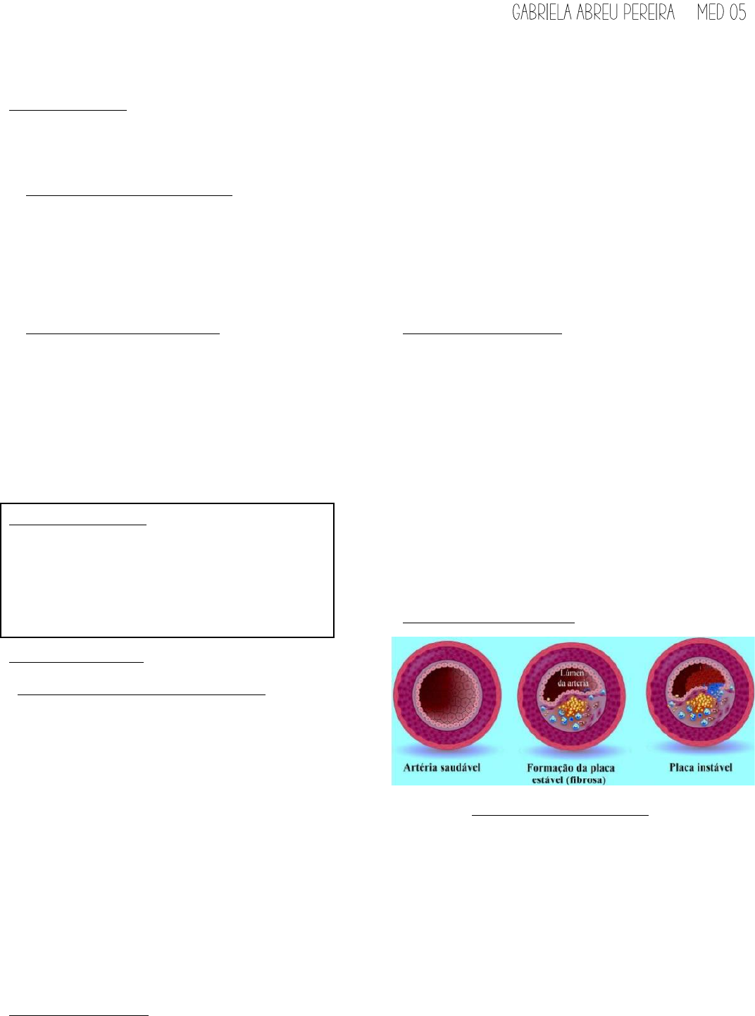– Doença arterial coronariana (DAC) INTRODUÇÃO - Doença causada pela obstrução das coronárias, que pode resultar em isquemia ou infarto -> Doença aterosclerótica crônica: sinais e sintomas se manifestaram durante esforço/estresse, sem instabilidade de placa: - Sintomática: angina estável (angina pectoris) - Assintomática: isquemia silenciosa -> Síndrome coronariana aguda: obstrução total ou parcial do vaso, causada pela formação de trombo sobre a placa instável -> sintomas ocorrem até em repouso, instabilidade de placa: - Angina instável - Infarto sem supra de ST - Infarto com supra de ST Termos importantes - Isquemia => desequilíbrio entre a oferta e o consumo de O2 - Necrose celular => resultado de uma isquemia grave e persistente CAUSAS DA DAC - Aterosclerose coronariana (principal) - Embolia coronariana - Vasculites - Dissecção coronariana - Drogas (cocaína) -> vaso espasmo - Anemia - Hipertensão pulmonar - Hipertireoidismo -> aumenta demanda de O2 - Taquicardia supraventricular - Cardiomiopatia hipertrófica EPIDEMIOLOGIA - Uma das principais causas de internação - Principal causa de óbito no país - 300 mil casos de SCA/ano -> 1 óbito a cada 7 casos - Aumento de casos com o envelhecimento da população, dietas gordurosas, aumento da incidência de DM2, HAS e obesidade - Forma assintomática = 2/3% da população - Mortalidade em queda em países ricos FATORES DE RISCO - HAS (causa lesão e disfunção no endotelial) - DM (processo inflamatório nos vasos) - Tabagismo - Obesidade - Dislipidemia - Sedentarismo - História familiar - Idade: homens > 45 anos e mulheres > 55 anos PLACA DE ATEROMA - Paciente hipertenso e dislipidêmico* -> LDL livre oxida, força do sangue nas paredes -> danos funcionais no endotélio -> disfunção endotelial -> aumenta expressão de moléculas de adesão -> LDL começa acumular na intima -> migração de macrófagos para parede do vaso -> macrófago ingere gordura -> formação de macrófagos espumosos -> recruta outras moléculas de defesa -> formação de fibrose -> degradação de toda parede do vaso -> placa começa a crescer para a luz do vaso -> DAC crônica -> parede da placa se rompe (placa instável) -> core fica exposto -> ativa cascata de coagulação -> formação do trombo -> SCA FISIOPATOLOGIA - Desequilíbrio entre oferta x demanda - Obstrução entre 50 – 80% => reserva coronariana pode suprir - Obstrução > 80% => reserva coronariana é insuficiente - Miocárdio se torna hipocinesico, acinésico ou discinésico - 20 minutos => tempo entre oclusão e necrose - Grau e apresentação da SCA, dependem de diversos fatores: *Quanto mais severa a obstrução, maior a chance de infarto com supra *Condicionamento do coração -> em pacientes mais velhos, tem a presença de vasos colaterais *Reserva que as coronárias são capazes de manter *Condição do miocárdio Obstrução das coronárias -> isquemia -> modificação do miocárdio (hipocinesico, acinésico ou discinésico) -> necrose ANATOMIA DAS CORONÁRIAS - São ramos do tronco coronário - Coronárias enchem por fluxo retrogrado ANGINA ESTÁVEL (DAC) - Apresentação crônica e sintomática da DAC - Isquemia transitória induzida por esforço -> aumento da demanda - Ocorre após a obstrução ≥ 50% do lúmen arterial - Mais comum no sexo masculino -> Manifestações mais comuns: - Dor torácica: Angina Pectoris -> dor em aperto que piora diante de atividade física, irradia para membro superior esquerdo, melhora com repouso *Outras localizações: mandíbula e epigástrio *Duração < 10 min *Desencadeada por esforços - Equivalentes anginosos: *Dispneia *Náuseas e vômitos *Sudorese fria *Palidez *Síncope *Choque e morte súbita -> mais comum SCA -> Diagnóstico - Características típicas (tem 3/3) e atípica (tem 2/3) 1. Sensação de aperto, peso ou pressão retroesternal 2. Início durante esforço físico ou emoções 3. Alivio após repouso ou uso de nitrato sublingual (1-5 min) Obs.: sinal de Levine -> sinal comum das anginas -> Classificação funcional (não cai na prova) I – Apenas esforços intensos (prolongados ou muito rápidos), atividades ordinárias não II – Atividades ordinárias, porém com pouca limitação III – Atividades ordinárias com limitação significativa IV – Qualquer atividade desencadeia angina -> Investigação do paciente - Anamnese: características da dor, fatores de risco, histórico de eventos isquêmicos e histórico familiar - Exame físico: *Normalmente sem alterações *Durante angina: B3, B4, estertores bibasais, desdobramento de B2 *Investigar outros sinais de aterosclerose (sopro carotídeo, claudicação intermitente, massa abdominal pulsátil) - Exames complementares: *Hemograma, lipidograma, função renal, Gj, HbA1c, microalbuminúria, função tireoidiana, PCR (relação direta com instabilidade da placa) *ECG para todos os pacientes com dor torácica -> Teste adicionais - Só faz teste adicional pacientes típicos e pacientes atípicos com diversos fatores de risco - Devem ser realizados em pacientes com probabilidade pré-teste intermediaria de DAC (10- 90%) - Nos pacientes de alta probabilidade servem para predição de risco - Escolha do teste depende do condicionamento físico e a tolerância de esforço a. Teste ergométrico - Mais utilizado - Até 1/3 de falso + ou – - Confirma diagnostico e estratifica prognostico - Medida ECG/PA continuo durante o esforço - Contraindicações: angina em repouso nas ultimas 48 horas, RCR instável, estenose aórtica grave, IC descompensada, IAM recente b. Cintilografia de perfusão miocárdica - Confirma diagnostico e estratifica prognostico - Avalia consequência da isquemia - Avaliação de radiotraçados no miocárdio - Stress: esforço físico ou farmacológico (dipiridamol) c. Eco com stress - Esforço físico ou drogas (dipiridamol, adenosina, dobutamina + atropina), estimulação atrial transesofágica; - Diagnostica isquemia diante de 