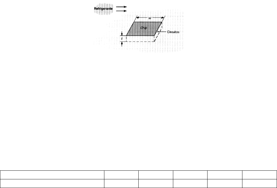 1 Lista de exercícios – Caps. 1, 2 e 3 TMEC030 Transferência de Calor e Massa – Período Especial 2017/2 1. (Incropera, 6ed, 1.7) Um circuito integrado (chip) quadrado de silício (k = 150 W/m·K) possui w = 5 mm de lado e espessura t = 1 mm. O chip está alojado no interior de um substrato de tal modo que as suas superfícies laterais e inferior estão isoladas termicamente, enquanto sua superfície superior encontra-se exposta a uma substância refrigerante. Se 4 W estão sendo dissipados pelos circuitos que se encontram montados na superfície inferior do chip, qual a diferença de temperatura que existe entre as suas superfícies inferior e superior, em condições de regime estacionário? Resp: 1,1ºC 2. (Incropera, 6ed, 1.14) Ar a 40ºC escoa sobre um cilindro longo, com 25 mm de diâmetro, que possui um aquecedor elétrico no seu interior. Durante uma bateria de testes foram tomadas medidas da potência dissipada por unidade de comprimento do cilindro, P , necessária para manter a temperatura da superfície do cilindro em 300ºC para diferentes velocidades V da corrente de ar, medidas em uma posição afastada da superfície. Os resultados obtidos foram os seguintes: Velocidade do ar, V (m/s) 1 2 4 8 12 Potência, P (W) 450 658 983 1507 1963 a) Determine o coeficiente de transferência de calor por convecção para cada velocidade. Resp: 22,1; 32,3; 48,2; 73,9; 96,2. b) Supondo que o coeficiente convectivo dependa da velocidade de escoamento do ar de acordo com uma relação do tipo nVCh , determine os parâmetros C e n a partir dos resultados da parte (a). Resp: 22,12; 0,6. 3. (Incropera, 6ed, 1.25) Uma sonda interplanetária esférica, de diâmetro 0,5 m, contém circuitos eletrônicos que dissipam 150 W. Se a superfície da sonda possui uma emissividade de 0,8 e não recebe radiação de outras fontes como, por exemplo, do sol, qual a sua temperatura superficial? Resp: 254,7 K 4. (Incropera, 6ed, 1.36) Um aquecedor de sangue é usado durante transfusão de sangue para um paciente. Este dispositivo deve aquecer o sangue, retirado do banco de sangue a 10ºC, até 37ºC a uma vazão de 200 ml/min. O sangue passa por um tubo com comprimento de 2 m e uma seção transversal retangular com 6,4 mm x 1,6 mm. A que taxa com que o calor deve ser 2 adicionado ao sangue para cumprir o aumento de temperatura desejado? Admita que as propriedades do sangue sejam similares às da água. Resp: 375 W. 5. (Incropera, 6 ed, 1.39) Um secador de cabelos pode ser idealizado como um duto circular através do qual um pequeno ventilador sopra ar ambiente e dentro do qual o ar é aquecido ao escoar sobre uma resistência elétrica na forma de fio helicoidal. a) Se o aquecedor for projetado para operar com um consumo de potência elétrica Pelet = 500 W e para aquecer o ar de uma temperatura ambiente Tent = 20ºC para uma temperatura de saída Tsai = 45ºC, em qual vazão volumétrica ele deve operar? A perda de calor de seu revestimento externo para o ar ambiente e sua vizinhança pode ser desprezada. Se o duto tiver um diâmetro D = 70 mm, qual é a velocidade do ar na saída Vsai? A densidade do ar e o calor específico do ar podem ser aproximados por ρ = 1,10 kg/m3 e cp = 1007 J/kgK, respectivamente. Resp: 0,0181 m3/s; 4,7 m/s. b) Considere um comprimento do duto do aquecedor de L = 150 mm e uma emissividade de sua superfície de ε = 0,8. Se o coeficiente associado à transferência de calor por convecção natural do revestimento externo para o ambiente for de h = 4 W/m2K, e a temperatura do ar e da vizinhança for de T = 20ºC, confirme que a perda de calor pelo revestimento externo é, de fato, desprezível. A temperatura superficial média do revestimento externo pode ser considerada igual a Ts = 40ºC. Resp: 5,97 W. 6. (Incropera, 6 ed, 1.47) Uma esfera pequena de ferro puro, com calor específico de 447 J/kgK e massa de 0,515 kg, é subitamente imersa em uma mistura gelo-água. Finos fios de termopar mantêm a esfera suspensa. Observa-se que a sua temperatura varia de 15 para 14ºC em 6,35 s. O experimento é repetido com uma esfera metálica de mesmo diâmetro, com composição desconhecida e massa de 1,263 kg, com a mesma variação de temperatura observada ocorrendo em 4,59 s. Qual é o calor específico do material desconhecido? Resp: 132 J/kgK. 7. (Incropera, 6ed, 1.49) Oxigênio líquido, que possui ponto de ebulição de 90K e um calor latente de vaporização de 214 kJ/kg, é armazenado em um recipiente esférico cuja superfície externa possui um diâmetro de 500 mm e está a uma temperatura de -10ºC. O recipiente é guardado em um laboratório cujo ar e paredes se encontram a 25ºC. Se a emissividade da superfície é de 0,20 e o coeficiente de transferência de calor associado à convecção natural na 3 superfície externa do recipiente é de 10W/m2K, qual é a taxa, em kg/s, na qual o vapor de oxigênio deve ser retirado do sistema? Resp: 1,41x10-3 kg/s. 8. (Incropera, 6ed, 1.60) A parede de um forno utilizado para tratar peças plásticas possui uma espessura L = 0,05 m e a sua superfície externa está exposta ao ar e a uma grande vizinhança. O ar e a vizinhança encontram-se a 300K. Sendo a temperatura da superfície externa igual a 400K, e o seu coeficiente de transferência de calor por convecção e a sua emissividade iguais a h = 20 W/m2K e ε = 0,8, respectivamente, qual é a temperatura da superfície interna, se a parede possuir uma condutividade térmica k = 0,7 W/mK? Resp: 600K. 9. (Incropera, 6 ed, 1.70) Um fluxo solar de 700 W/m2 incide sobre um coletor solar plano usado para aquecer água. A área do coletor é de 3 m2 e 90% da radiação solar atravessam a cobertura de vidro e é absorvida pela placa absorvedora. Os 10% restantes são refletidos para fora do coletor. A água escoa através de tubos presos no lado inferior da placa absorvedora e é aquecida da temperatura de entrada Tent até uma temperatura de saída Tsai. A cobertura do vidro, operando a 
