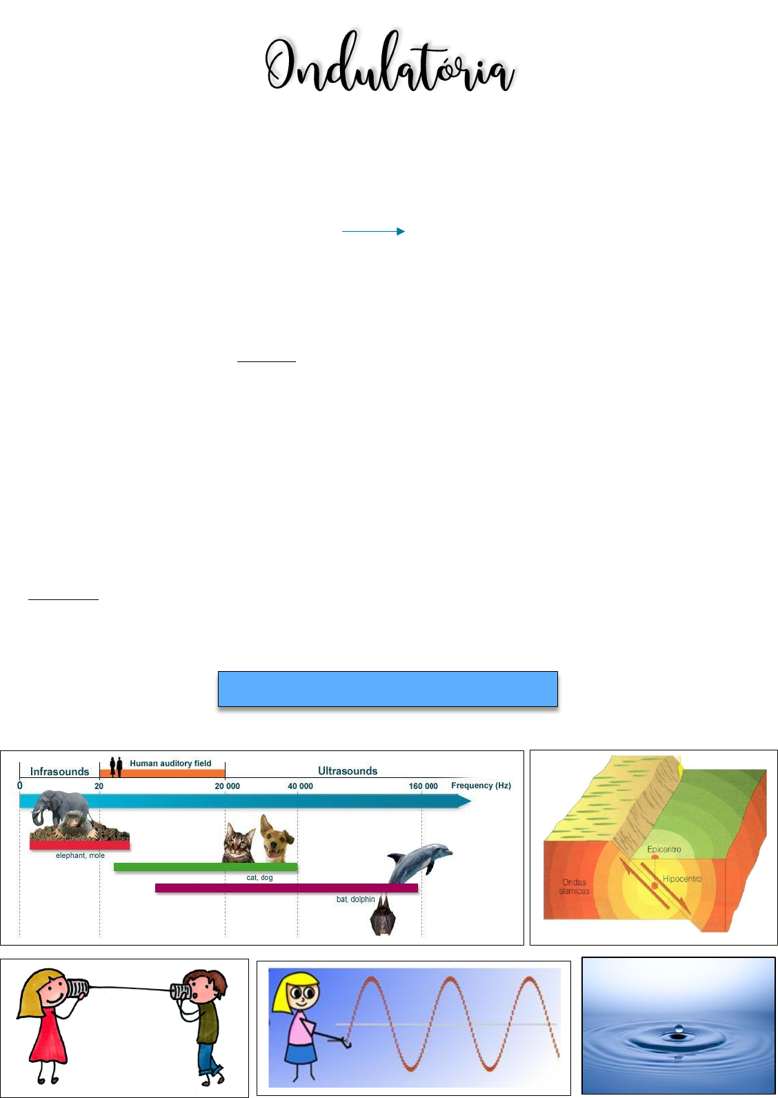A onda é um pulso de energia que se propaga sem levar matéria. Perturbação Pulso de energia Ex: Um murro na água (energia + matéria) Energia: força aplicada no murro Matéria: Mão → Só o que se propaga é a energia Tipos de onda Quanto à natureza da onda → Mecânicas: Precisam de um meio material para se propagarem Ex: Som, onda na água, onda na corda OBS: No espaço (vácuo) as ondas mecânicas não se propagam, pois não há matéria nenhuma. Situação: Experiência dos copos ligados por uma corda → Se há perturbação de um lado, a onda chega ao outro GERA + DENSO O MEIO + VELOCIDADE quanto mais matéria, melhor para ela se propagar A ondulatória estuda as características, propriedades e fenômenos das ondas e oscilações. → Eletromagnéticas: Não precisam de um meio para se propagarem (mas podem se propagar na matéria) Ex: rádio, micro-ondas, infravermelho, luz visível, raio-x, raio gama OBS: No espaço (vácuo) as ondas eletromagnéticas se propagam muito melhor Situação: Ondas infravermelho (energia térmica) → Sensores que detectam a presença de alguém no local, através do calor que o corpo emite → Cobras também possuem sensores e detectam o calor das presas, mesmo no escuro + DENSO O MEIO - VELOCIDADE quanto mais matéria, pior para ela se propagar Quanto ao meio de propagação → Unidimensional: uma dimensão. (ex: onda na corda) → Bidimensional: duas dimensões, superfícies planas (ex: onda no mar) → Tridimensional: três dimensões (ex: som ou luz) Quanto a direção de vibração das ondas → Transversais: vibram na direção perpendicular à sua propagação → Longitudinais: vibram na mesma direção que a sua propagação Elementos da onda • Crista: as cristas da onda são os pontos mais altos da onda. • Vale: os vales da onda são os pontos mais baixos da onda. • Comprimento de onda: o comprimento de onda é a distância entre duas cristas consecutivas ou dois vales consecutivos. Também pode ser a medida de uma crista e um vale, correspondendo ao tamanho da onda. • Amplitude: a amplitude é a diferença entre a crista ou vale e o ponto de equilíbrio (ponto zero), correspondendo à altura da onda. • Período: é o tempo que leva para que a onda conclua uma oscilação completa. • Frequência: o número de oscilações realizadas pela onda em um determinado tempo (Hz). É a identidade da onda, cada onda possui uma frequência específica OBS: Período e Frequência são inversamente proporcionais • Velocidade: velocidade com que uma onda atravessa um meio. Ex: velocidade do som no ar → 340 m/s velocidade do som na água → 1500 m/s Ex: velocidade da luz → 3,0 x 108 m/s Equação fundamental Em que: • v: velocidade de propagação (m/s) • λ: comprimento de onda (m) • f: frequência de oscilação (Hz) Atenção: comprimento de onda e a frequência são inversamente proporcionais. Assim, para uma mesma velocidade, se o comprimento de onda aumentar, a frequência deve diminuir. T= 1 f https://mundoeducacao.uol.com.br/fisica/velocidade-propagacao-uma-onda.htm Fenômenos ondulatórios Os fenômenos ondulatórios descrevem os distintos comportamentos das ondas ao encontrarem um obstáculo. • Reflexão: a onda bate no obstáculo e volta. Nesse fenômeno, a luz não muda sua velocidade, já que não houve alteração de meio. • Refração: a onda muda sua velocidade e comprimento de propagação se alterado o meio. • Difração: permite que a onda atravesse uma fenda ou contorne um obstáculo e se espalhe ou se alargue do outro lado da fenda. SONAR: Sistema de audição de golfinhos, baleias e morcegos • Absorção: fenômeno que ocorre quando ao ser emitida sobre os corpos, a luz é absorvida por eles. Com isso, ela permite que vejamos as cores dos objetos, dependendo exclusivamente da cor da luz emitida e da cor do objeto. • Dispersão: fenômeno que ocorre quando uma onda, constituída de várias outras, ao entrar em um meio material diferente, refrata e se dissocia em suas componentes. • Interferência: ocorre quando a onda esbarra em outra onda. Há dois tipos de interferências: construtiva e destrutiva. → construtiva: somatório das ondas forma uma onda resultante de maior amplitude. → destrutiva: elas se anulam, gerando uma onda resultante de baixa amplitude ou nula. • Ressonância: quando uma onda externa tem a mesma frequência de vibração que a de algum corpo. Nessa situação a vibração externa é absorvida pela interna e, assim, a vibração natural é ampliada. → a ressonância depende da frequência • Polarização: pode ser entendida como uma espécie de filtro para as ondas transversais. A polarização seleciona apenas uma direção de vibração entre todas as direções de vibração de uma onda. Isso é feito por meio de um polarizador, que deixa passar apenas as vibrações em uma única direção.