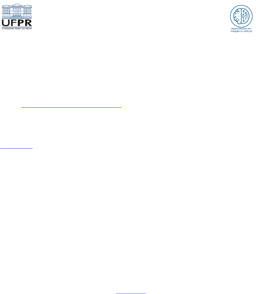 UFPR – Universidade Federal do Paraná Setor de Educação Profissional e Tecnológica Especialização em Inteligência Artificial Aplicada Turma 2023 PRIMEIRA CHAMADA A seguir a relação dos alunos(as) selecionados(as) em primeira chamada para o curso de Especialização em Inteligência Artificial Aplicada – Turma 2023 da UFPR. Para confirmar sua matrícula, você deve enviar até o dia 16/02/2023 (quinta-feira) por meio do preenchimento do seguinte formulário: https://forms.gle/yvaoRZbYYqxR5SeU6 Não haverá pagamento de matrícula, as 18 mensalidades do curso iniciam em 10/04/2023. Caso não deseje se matricular, peço a gentileza em nos informar pelo e-mail: iaa@ufpr.br . Aquele(a) que não confirmar a matrícula até o dia 16/02, perderá a vaga e uma segunda chamada será feita no dia 17/02. Caso nem todos(as) se matriculem, todos(as) os(as) inscritos(as) sejam chamados(as) e sobrem vagas remanescentes, as inscrições serão reabertas. As aulas começam no dia 25/02 às 9h no Setor de Educação Profissional e Tecnológica da UFPR na Rua Dr Alcides Vieira Arcoverde, 1225 Jardim das Américas - Curitiba/PR (após a confirmação da matrícula você receberá todas as informações para o início das aulas). Curitiba, 14 de fevereiro de 2023. Coordenação do curso de Especialização em Inteligência Artificial Aplicada – UFPR iaa@ufpr.br UFPR – Universidade Federal do Paraná Setor de Educação Profissional e Tecnológica Especialização em Inteligência Artificial Aplicada Turma 2023 SELECIONADOS EM PRIMEIRA CHAMADA (ordem alfabética) Alessandro Franco Farinhaque Maderna Leite Alexandra Ferrari Alexandre Kawamura Alisson Crespim Vieira Ana Vitória Valois Gonçalves Anderson Augusto Da Costa De Morais Anderson Carlos Rachid André Felipe Zilio Da Silva Bruno Hammerschmidt Cláudio Rosa Lopes Claudio Wolszczak Cleison Silva Protes Cardoso Coutinho Joao Mataca Daniel Pereira Pilati Junior Danilo Daniel Cordeiro Dayenne Caroline De Souza Diego Michel Hartwig Elaine Cristina Pelizari Everton Osnei Cesario Fabricio Pio Nogueira Fernando Cesar De Oliveira Gerson Luiz Gusso Guo Ling Hedward Django Cordeiro Janerson Dias Dos Santos João Carlos Barumby João Felipe Oliveira Floriano De Souza Julia Gouvêa Santos Juliany Helen Das Graças Pinto Levi Carvalho De Oliveira Junior Luana Gomes De Souza Povroznik Marcelo Lampe Zacharias Marcio Jose De Oliveira Sell Marcos Roberto De Abreu Marcos Santos De Souza Junior Mateus Antunes Da Costa Baptista Miraceli Bonjardim Waldemar Otávio Augusto Gonçalves Larrosa Renan Romanio Alves Santos Rodrigo Alexander Schinemann Sear Jasube Soares De Castro Sílvio Júnio Baro Dantas Thiago De Paula Drulla Thiago Felipe Mosson Teixeira Thiago Schaedler Uhlmann Valdinei José Saugo Victor Carvalho De Andrade Lima Wagner Alexandre Chaves Weslley Antonio Queiroz Felix Yuri Silva De Brito