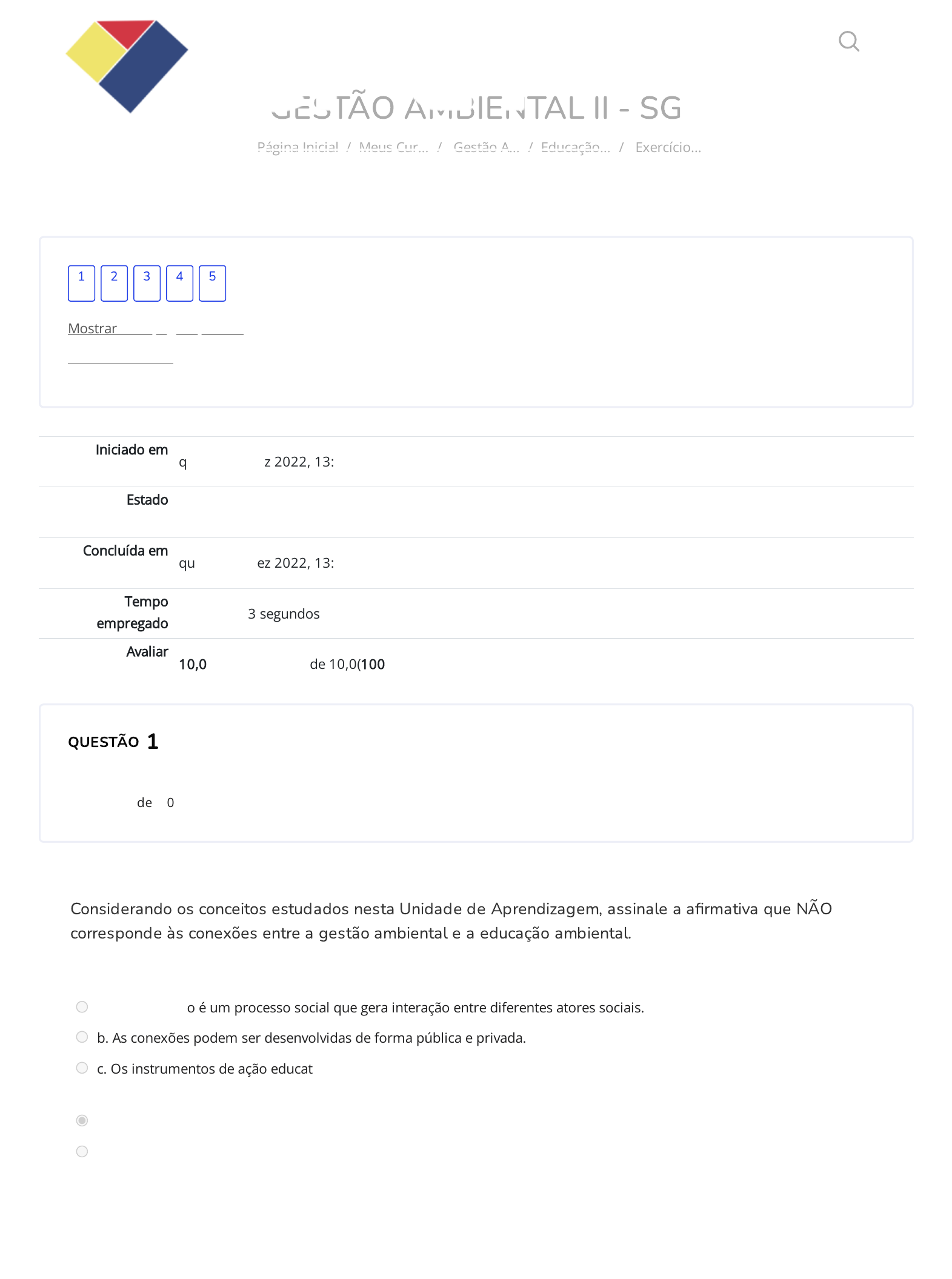 21/12/2022 13:56 Exercício de Fixação - Educação Ambiental: Revisão da tentativa https://cpetead.com.br/mod/quiz/review.php?attempt=3359578&cmid=48294 1/4 GESTÃO AMBIENTAL II - SG Página Inicial / Meus Cur… / Gestão A… / Educação… / Exercício… Iniciado em quarta, 21 Dez 2022, 13:54 Estado Finalizada Concluída em quarta, 21 Dez 2022, 13:55 Tempo empregado 1 minuto 33 segundos Avaliar 10,0 de um máximo de 10,0(100%) QUESTÃO Correto Atingiu 2,0 de 2,0 Mostrar uma página por vez Terminar revisão 1 2 3 4 5 1 Considerando os conceitos estudados nesta Unidade de Aprendizagem, assinale a a�rmativa que NÃO corresponde às conexões entre a gestão ambiental e a educação ambiental. Escolha uma opção: a. Essa conexão é um processo social que gera interação entre diferentes atores sociais. b. As conexões podem ser desenvolvidas de forma pública e privada. c. Os instrumentos de ação educativa e social que determinam a transformação das estruturas sociais, visando à construção de valores e conceitos. d. Os conceitos ecopedagógicos não estão relacionados com os conceitos pedagógicos da educação ambiental. e. O processo de articular agentes sociais e ações participativas. Sua resposta está correta. A resposta correta é: Os conceitos ecopedagógicos não estão relacionados com os conceitos pedagógicos da educação ambiental. https://cpetead.com.br/ https://cpetead.com.br/course/view.php?id=2045 https://cpetead.com.br/mod/quiz/view.php?id=48294 https://cpetead.com.br/mod/quiz/review.php?attempt=3359578&cmid=48294&showall=0 https://cpetead.com.br/mod/quiz/view.php?id=48294 https://cpetead.com.br/ 21/12/2022 13:56 Exercício de Fixação - Educação Ambiental: Revisão da tentativa https://cpetead.com.br/mod/quiz/review.php?attempt=3359578&cmid=48294 2/4 QUESTÃO Correto Atingiu 2,0 de 2,0 QUESTÃO Correto Atingiu 2,0 de 2,0 2 A Política Nacional de Educação Ambiental (Lei n. 9795/1999) de�ne os princípios básicos que devem ser adotados para a educação ambiental. Na sequência são apresentadas cinco sentenças sobre os princípios dessa lei, mas uma delas não está correta. Indique a sentença INCORRETA. Escolha uma opção: a. A educação ambiental é um processo contínuo e permanente. b. O meio ambiente deve ser considerado somente como meio natural e com enfoque da sustentabilidade. c. A diversidade individual e cultural deve ser respeitada. d. A educação ambiental deve ser conduzida de forma inter, multi e transdisciplinar. e. A educação ambiental deve realizar uma avaliação crítica do processo educativo. Sua resposta está correta. A resposta correta é: O meio ambiente deve ser considerado somente como meio natural e com enfoque da sustentabilidade. 3 Sobre o conceito de educação ambiental de�nido na Política Nacional de Educação Ambiental, é CORRETO a�rmar: Escolha uma opção: a. Os valores sociais modi�cam nossas atitudes somente com relação à conservação do meio ambiente. b. Os processos visam somente à mudança de conduta dos indivíduos. c. A mudança de valores provocada pela educação ambiental se limita à melhoria da qualidade de vida. d. A construção de valores voltados à conservação da natureza é um objetivo da educação ambiental. e. A construção de novos valores é uma meta da educação ambiental para a conservação do ambiente, mas não garante a melhoria da qualidade de vida. Sua resposta está correta. A resposta correta é: A construção de valores voltados à conservação da natureza é um objetivo da educação ambiental. 21/12/2022 13:56 Exercício de Fixação - Educação Ambiental: Revisão da tentativa https://cpetead.com.br/mod/quiz/review.php?attempt=3359578&cmid=48294 3/4 QUESTÃO Correto Atingiu 2,0 de 2,0 QUESTÃO Correto Atingiu 2,0 de 2,0 4 Leia as a�rmativas: I. A educação ambiental pode ser formal e não formal. II. A educação formal deve estar presente do ensino fundamental ao médio. III. A educação formal deve abranger todas as modalidades de ensino, como educação de jovens e adultos e educação especial. IV. A sensibilização da coletividade pode ser alcançada somente com a educação formal. Indique a alternativa INCORRETA. Escolha uma opção: a. Somente a a�rmativa I. b. As a�rmativas II e III. c. As a�rmativas I e IV d. As a�rmativas II e IV. e. Somente a a�rmativa III. Sua resposta está correta. A resposta correta é: As a�rmativas II e IV. 5 Considerando o histórico da educação ambiental, é INCORRETO a�rmar: Escolha uma opção: a. A Década da Educação para o Desenvolvimento Sustentável ocorreu entre 2005 e 2014. b. Na Rio 92 foi enfatizado o respeito a todas as formas de vida. c. Em resposta às recomendações da Conferência de Estocolmo (1972), foi realizado o Encontro Internacional em Educação Ambiental, promovido pela Unesco em Belgrado (1975). d. O ano de 1981 foi importante para a educação ambiental no Brasil com a publicação do documento “Projeto de informações sobre educação ambiental” e a criação da Política Nacional de Meio Ambiente. e. A Primeira Conferência sobre Educação Ambiental, que ocorreu na Geórgia em 1977, não teve representatividade para a evolução dessa temática. Sua resposta está correta. A resposta correta é: A Primeira Conferência sobre Educação Ambiental, que ocorreu na Geórgia em 1977, não teve representatividade para a evolução dessa temática. 21/12/2022 13:56 Exercício de Fixação - Educação Ambiental: Revisão da tentativa https://cpetead.com.br/mod/quiz/review.php?attempt=3359578&cmid=48294 4/4 ◄ Conteúdo de Estudo - Educação Ambiental Seguir para... Conteúdo de Estudo - Sociedade e Ambiente – questões legais II ► Quem somos Cursos Certi�cação Unidades Contato Copyright © 2021 CPET - Centro de Pro�ssionalização e Educação Técnica https://cpetead.com.br/mod/lti/view.php?id=48293&forceview=1 https://cpetead.com.br/mod/lti/