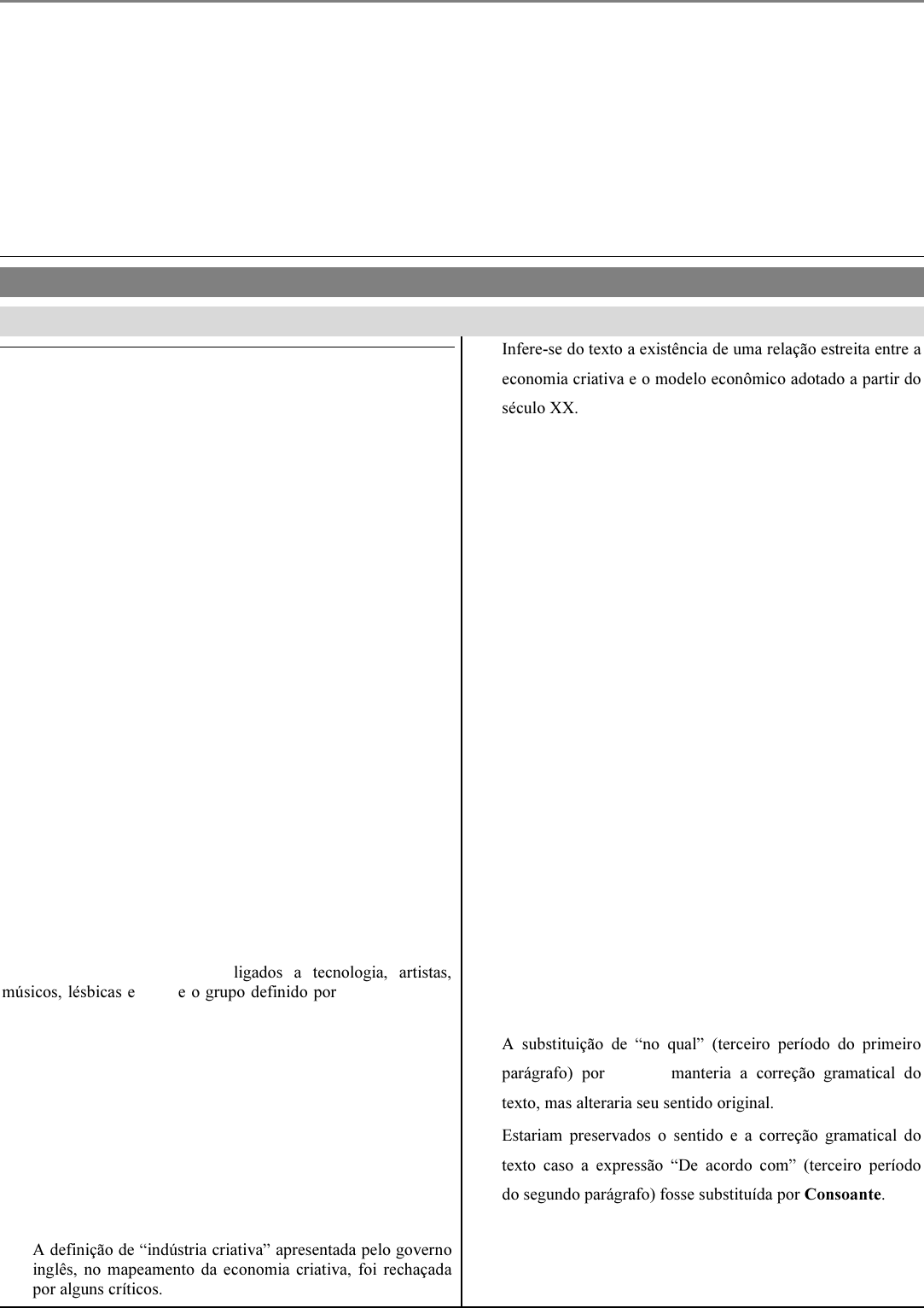 CEBRASPE – TCE/RJ – Edital: 2021 • Cada um dos itens das provas objetivas está vinculado ao comando que imediatamente o antecede. De acordo com o comando a que cada um deles esteja vinculado, marque, na Folha de Respostas, para cada item: o campo designado com o código C, caso julgue o item CERTO; ou o campo designado com o código E, caso julgue o item ERRADO. A nota em cada item das provas objetivas, feita com base nas marcações da Folha de Respostas, será igual a: 1,00 ponto, caso a resposta do candidato esteja em concordância com o gabarito oficial definitivo das provas; 1,00 ponto negativo, caso a resposta do candidato esteja em discordância com o gabarito oficial definitivo das provas. A ausência de marcação ou a marcação de ambos os campos não serão apenadas, ou seja, não receberão pontuação negativa. Para as devidas marcações, use a Folha de Respostas, único documento válido para a correção das suas respostas. • Em seu caderno de provas, caso haja item(ns) constituído(s) pela estrutura Situação hipotética: ... seguida de Assertiva: ..., os dados apresentados como situação hipotética devem ser considerados premissa(s) para o julgamento da assertiva proposta. • Eventuais espaços livres — identificados ou não pela expressão “Espaço livre” — que constarem deste caderno de provas poderão ser utilizados para rascunho. PROVAS OBJETIVAS -- CONHECIMENTOS BÁSICOS -- A preocupação com o desenvolvimento das indústrias criativas ocorre de forma não intuitiva e direcionada há muitos anos. Em 1918, o presidente dos Estados Unidos da América, Woodrow Wilson, promoveu a nascente indústria cinematográfica, considerando que “o comércio vai atrás dos filmes”, uma afirmação clássica sobre o fato de que as indústrias criativas têm um significado que vai muito além do seu impacto econômico imediato. O governo australiano publicou, em 1994, um documento chamado Creative Nation, no qual já apresentava alguns posicionamentos oficiais sobre a pauta. Nele, afirmava que “uma política cultural também é uma política econômica” e que “o nível de nossa criatividade determina substancialmente nossa capacidade de adaptação aos novos imperativos econômicos”. Após as eleições para primeiro-ministro do Reino Unido, em 1997, foi realizado o primeiro mapeamento concreto e aprofundado sobre a economia criativa em uma nação. Esse mapeamento causou polêmica quanto à conceituação de indústria criativa. De acordo com a definição do governo inglês, as indústrias criativas são aquelas atividades que têm origem na criatividade, na habilidade e no talento individual e que potencializam a geração de riqueza e empregos por meio da geração e da exploração da propriedade intelectual. Os críticos que analisaram o projeto de Tony Blair/DCMS consideraram que as colocações deixaram o contexto muito aberto, pois poderia englobar áreas como engenharia e indústria farmacêutica, que não têm conexão com a economia criativa. Como em qualquer área de pesquisa, alguns cientistas apresentam visões bem controversas. O pesquisador estadunidense Richard Florida, por exemplo, trouxe o conceito de classe criativa. Segundo Florida, regiões metropolitanas com alta concentração de trabalhadores ligados a tecnologia, artistas, músicos, lésbicas e gays e o grupo definido por high bohemians são áreas com alto potencial de crescimento neste milênio. Na visão de Florida, as cidades devem posicionar-se de forma diferente no novo milênio e virar todos os holofotes para a economia criativa. Vinnie de Oliveira. Economia criativa 4.0: o mundo não gira ao contrário. Edição do Kindle (com adaptações). Julgue os itens seguintes, no que diz respeito às ideias e a aspectos linguísticos do texto precedente. 1 O texto informa que o termo “economia criativa” foi empregado pela primeira vez pelo governo inglês, no mapeamento que realizou sobre o assunto. 2 A definição de “indústria criativa” apresentada pelo governo inglês, no mapeamento da economia criativa, foi rechaçada por alguns críticos. 3 Infere-se do texto a existência de uma relação estreita entre a economia criativa e o modelo econômico adotado a partir do século XX. 4 No segundo parágrafo, os termos “economia” (primeiro período) e “indústria” (segundo período) são empregados no texto como sinônimos. 5 O vocábulo “controversas” (primeiro período do último parágrafo) é empregado no texto com o mesmo sentido de condenáveis. 6 Na oração “as cidades devem posicionar-se de forma diferente no novo milênio” (último período do texto), conclui-se do emprego do vocábulo “se” que a oração está na voz passiva, isto é, a locução “devem posicionar-se” é, sintática e semanticamente, equivalente a devem ser posicionadas. 7 No trecho “uma afirmação clássica sobre o fato de que as indústrias criativas têm um significado que vai muito além do seu impacto econômico imediato” (segundo período do primeiro parágrafo), seriam mantidas a correção gramatical e a coerência do texto caso a forma verbal “vai” fosse substituída por vão, de forma que a concordância verbal passasse a ser estabelecida com o termo “as indústrias criativas”. 8 A substituição de “no qual” (terceiro período do primeiro parágrafo) por o qual manteria a correção gramatical do texto, mas alteraria seu sentido original. 9 Estariam preservados o sentido e a correção gramatical do texto caso a expressão “De acordo com” (terceiro período do segundo parágrafo) fosse substituída por Consoante. 10 A inserção do sinal indicativo de crase no vocábulo “a”, em “ligados a tecnologia” (terceiro período do último parágrafo), prejudicaria a correção gramatical do texto. FELIPE Riscado já existia FELIPE Realce FELIPE Realce FELIPE Realce FELIPE Realce FELIPE Riscado FELIPE Realce FELIPE Riscado FELIPE Riscad
