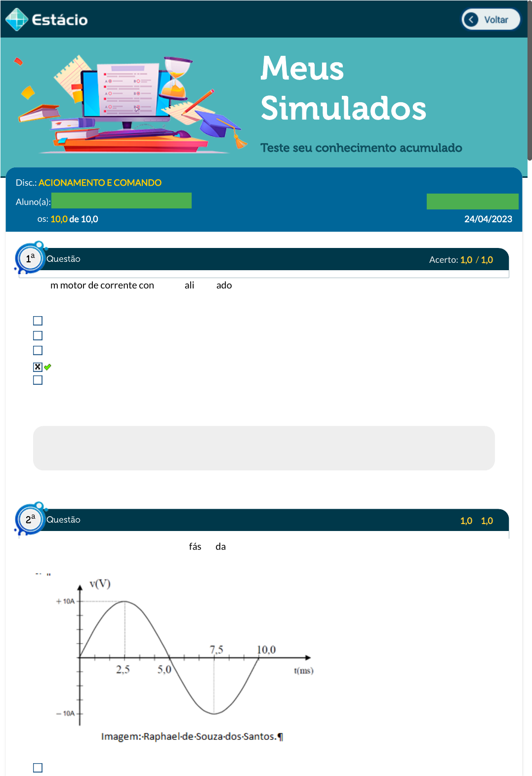 24/04/2023, 16:20 Estácio: Alunos https://simulado.estacio.br/alunos/ 1/1 Meus Simulados Teste seu conhecimento acumulado Disc.: ACIONAMENTO E COMANDO Aluno(a): DANILO DEIVISON SANTOS SILVA 202002304741 Acertos: 10,0 de 10,0 24/04/2023 Acerto: 1,0 / 1,0 Se um motor de corrente contínua é alimentado por uma fonte contínua de tensão de 12VCC e possui uma resistência equivalente de 12Ω, é possível a�rmar que a potência consumida, em watts, por esse motor será de: 36. 144. 24. 12. 1. Respondido em 24/04/2023 14:01:23 Explicação: A resposta certa é:12. Acerto: 1,0 / 1,0 Considerando o sinal alternado monofásico da �gura a seguir, determine o valor da tensão, em volts, no instante 7,5 ms. Considere a expressão do sinal V=30.senωt (V) e π=3,14 . +5. Questão1 a Questão2 a https://simulado.estacio.br/alunos/inicio.asp javascript:voltar();