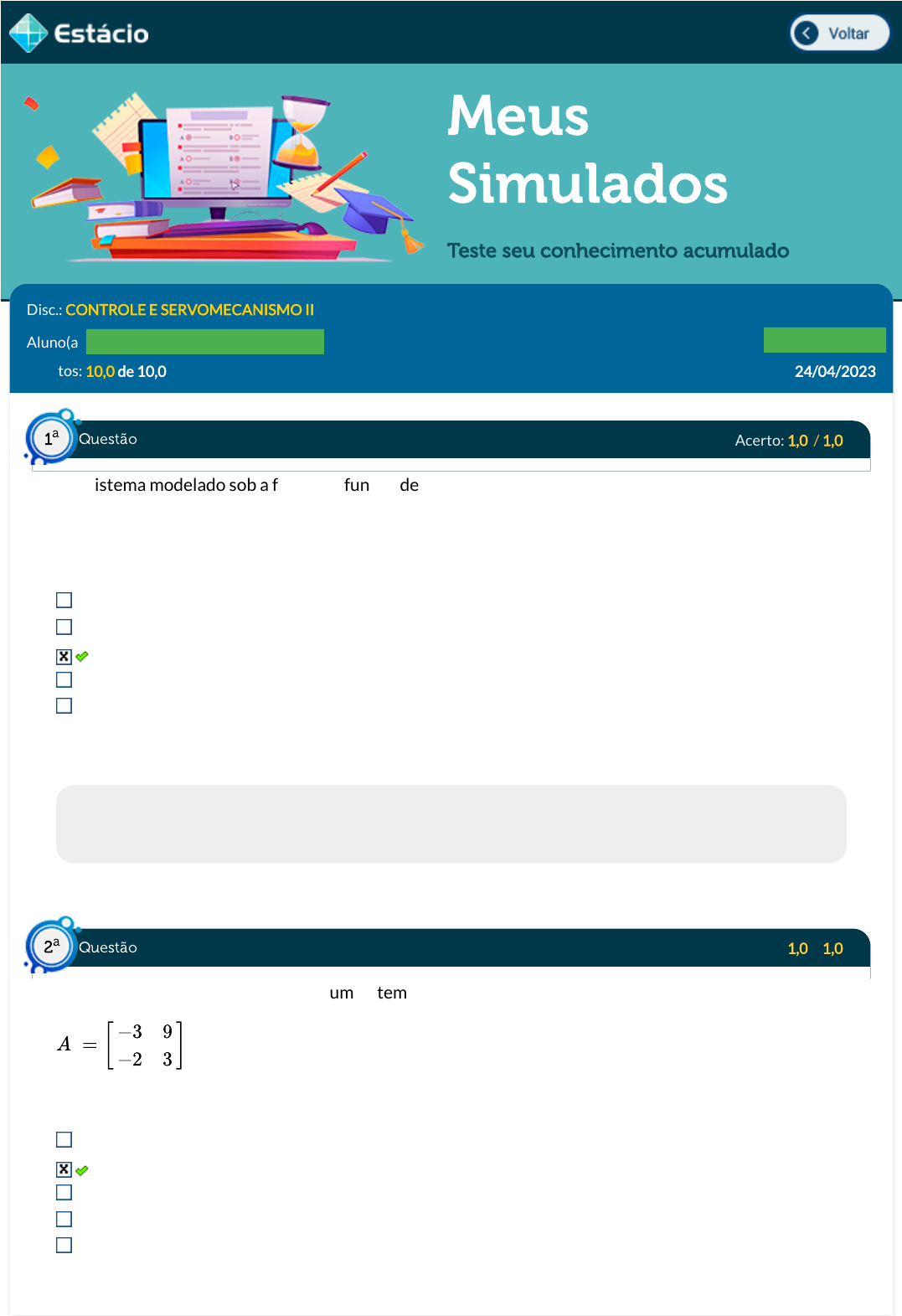 24/04/2023, 16:21 Estácio: Alunos https://simulado.estacio.br/alunos/ 1/5 Meus Simulados Teste seu conhecimento acumulado Disc.: CONTROLE E SERVOMECANISMO II Aluno(a): DANILO DEIVISON SANTOS SILVA 202002304741 Acertos: 10,0 de 10,0 24/04/2023 Acerto: 1,0 / 1,0 Um sistema modelado sob a forma de função de transferência apresenta os seguintes polos: -1+2j ; -1-2j ; +1+4j ; +1-4j ; -3 Com relação a esse sistema, pode ser a�rmado que não é BIBO, pois existem três polos no semiplano s esquerdo. é BIBO estável, pois seus estão no semiplano s direito. não é BIBO, pois existem dois polos no semiplano s direito. não é BIBO, pois existem polos complexos. é BIBO estável, pois o polo real possui valor negativo. Respondido em 24/04/2023 14:31:42 Explicação: A resposta correta é: não é BIBO, pois existem dois polos no semiplano s direito. Acerto: 1,0 / 1,0 A matriz de transição de estados de um sistema modelado em espaço de estado é: Quais serão os autovalores desse sistema? +5 e -1 +3j e -3j +3 e -3 -2 e -4 -1+2j e -1-2j Respondido em 24/04/2023 14:32:21 A = [−3 9 −2 3 ] Questão1 a Questão2 a https://simulado.estacio.br/alunos/inicio.asp javascript:voltar(); 24/04/2023, 16:21 Estácio: Alunos https://simulado.estacio.br/alunos/ 2/5 Explicação: A resposta correta é: +3j e -3j Acerto: 1,0 / 1,0 Considere a seguinte função de transferência discreta: Assinale a alternativa que contém a sua transformada Z inversa. Respondido em 24/04/2023 15:23:04 Explicação: A resposta correta é: Acerto: 1,0 / 1,0 Considere que a decomposição em frações parciais de determinada função de transferência discreta e biprópria obteve os seguintes conjuntos de polos e resíduos associados: Polos: Resíduos: Respondido em 24/04/2023 15:23:34 Explicação: A resposta correta é: Acerto: 1,0 / 1,0 X(z) = = N(z) D(z) 2z+2 z2−8z+15 x(n) = 2(8)nu(n) + 15(2)nu(n) x(n) = −4(5)nu(n) + 6(3)nu(n) x(n) = 7(5)n−1u(n − 1) + 2(8)n−1u(n − 1) x(n) = −4(5)n−1u(n − 1) + 6(3)n−1u(n − 1) x(n) = 6(5)n−1u(n − 1) − 4(3)n−1u(n − 1) x(n) = 6(5)n−1u(n − 1) − 4(3)n−1u(n − 1) p1 = 5 e p2 = 9 R1 = −6 e R2 = 8 x(n) = −6(5)n−1u(n − 1) + 8(9)n−1u(n − 1) x(n) = 5(−6)nu(n) + 9(8)nu(n) x(n) = 6(5)n−1u(n − 1) + 8(9)n−1u(n − 1) x(n) = −6(9)n−1u(n − 1) + 8(5)n−1u(n − 1) x(n) = 8(9)nu(n) − 6(5)nu(n) x(n) = 8(9)nu(n) − 6(5)nu(n) Questão3 a Questão4 a Questão5 a 24/04/2023, 16:21 Estácio: Alunos https://simulado.estacio.br/alunos/ 3/5 No processo de quantização de um sinal de tensão, cuja amplitude varia entre -5V a 5V, foram utilizados 16 bits de uma palavra com 2 bytes. Assinale a alternativa a seguir que contém a ordem de grandeza do erro de quantização: Respondido em 24/04/2023 15:28:20 Explicação: Resposta correta: Acerto: 1,0 / 1,0 Um sistema de controle discreto é representado pela seguinte função de transferência discreta: Sobre a estabilidade desse sistema, assinale a única alternativa correta: É estável porque possui os dois polos localizados no semiplano esquerdo do plano Z. É instável porque possui os dois polos localizados no semiplano direito do plano Z. É estável porque possui os dois polos localizados no interior do círculo unitário do plano Z. É instável porque possui os dois polos localizados fora do círculo unitário do plano Z. É instável porque possui um polo dos dois polos localizado fora do círculo unitário do plano Z. Respondido em 24/04/2023 15:24:06 Explicação: Resposta correta: É instável porque possui os dois polos localizados fora do círculo unitário do plano Z. Acerto: 1,0 / 1,0 A equação diferença de um sistema discreto é y(k+2) = - 0,8y(k) + u(k+1) + 2u(k). Qual é o polinômio característico de sua função de transferência discreta? z2 + 0,8 z2 + 2z + 0,8 z + 0,8 z2 + z + 2 z + 2 Respondido em 24/04/2023 15:25:07 Explicação: 5, 8593 ⋅ 10−3V 2, 4441 ⋅ 10−3V 1, 5V 0, 3662 ⋅ 10−3V 0, 1525 ⋅ 10−3V 0, 1525 ⋅ 10−3V G(z) = z z2+1,4z+1,3 Questão6 a Questão7 a 24/04/2023, 16:21 Estácio: Alunos https://simulado.estacio.br/alunos/ 4/5 Resposta correta: z2 + 0,8 Acerto: 1,0 / 1,0 No caso de realimentação de estados, se as posições �nais desejadas dos polos de um sistema de segunda ordem fossem s1= -2 e s2= -4, qual deveria ser o polinômio característico desejado? s2+6s+4 s2+2s+4 s2+5s+8 s2+6s+8 s2+4s+2 Respondido em 24/04/2023 15:25:21 Explicação: Resposta correta: s2+6s+8 Acerto: 1,0 / 1,0 Utilizando o método de Tustin e período de amostragem de T = 0,2s, para um contro lador PID com KP = 20, Ki = 8 e Kd = 2, qual deverá ser o coe�ciente do termo e(k - 1) na equação de diferença do controlador? -25,2 -35,2 -38,4 -28,0 -32,6 Respondido em 24/04/2023 15:26:58 Explicação: Resposta correta: -38,4 Acerto: 1,0 / 1,0 Um controlador PID foi ajustado pelo 2º método de Ziegler-Nichols, com valores de suas constantes de ganho derivativo e proporcional, respectivamente, de 24 e de 15,6. Nesse caso, qual deveria ser o período crítico Pc, em segundos, da oscilação sustentada obtida quando da realização dos testes para emprego do 2º método? 5,2 6,0 4,0 4,8 7,8 Questão8 a Questão9 a Questão10 a 24/04/2023, 16:21 Estácio: Alunos https://simulado.estacio.br/alunos/ 5/5 Respondido em 24/04/2023 15:27:30 Explicação: Resposta correta: 5,2