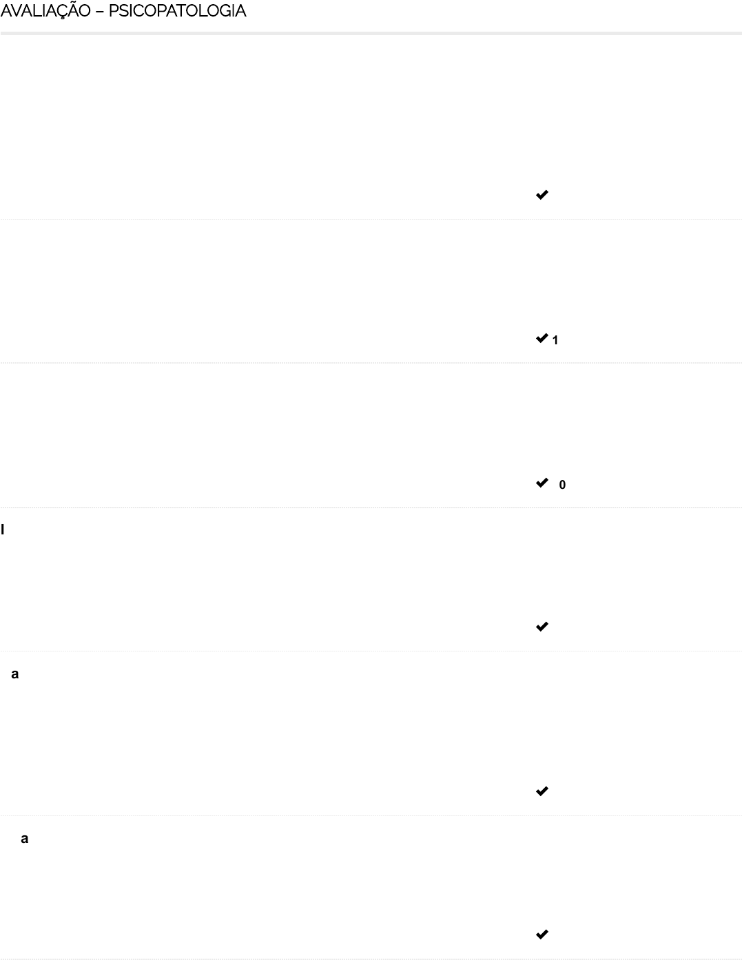 24/04/23, 17:19 Course Status – Facuminas https://ava.facuminasead.com.br/course-status/ 1/2 AVALIAÇÃO – PSICOPATOLOGIA PONTUAÇÃO TOTAL: 10PONTUAÇÃO OBTIDA 10 Segundo Teixeira (1997), as noções introduzidas por Pinel consolidaram novos conceitos operatórios, EXCETO: Resposta Marcada : Uma nosografia, com a conhecida divisão pineliana em três grandes classes, a saber: a mania, a demência e o idiotismo. PONTUAÇÃO TOTAL: 10PONTUAÇÃO OBTIDA 10 Existem alguns fatos importantes que marcam a psicopatologia desde o final da Segunda Guerra Mundial até o momento atual, sendo eles, EXCETO: Resposta Marcada : O estabelecimento de nosologias e sistemas diagnósticos desconhecidos. PONTUAÇÃO TOTAL: 10PONTUAÇÃO OBTIDA 10 Os princípios do movimento antimanicomial são, EXCETO: Resposta Marcada : O movimento antimanicomial é um movimento social, que organiza trabalhadores, famílias e usuários de Saúde Mental no combate às semelhantes formas de exclusão da loucura. PONTUAÇÃO TOTAL: 10PONTUAÇÃO OBTIDA 10 Influenciado por qual filósofo Pinel via o conhecimento como um processo cuja base é a observação empírica dos fenômenos que constituem a realidade? Resposta Marcada : Locke. PONTUAÇÃO TOTAL: 10PONTUAÇÃO OBTIDA 10 Na metade do século XVII, com a chegada do Renascimento (mundo moderno) houve um grande avanço da ciência e da tecnologia ocasionando o desenvolvimento da burocracia, da formalização da lei, da difusão das letras e da instrução, e o florescimento da economia de mercado levando à valorização: Resposta Marcada : Da racionalidade. PONTUAÇÃO TOTAL: 10PONTUAÇÃO OBTIDA 10 Qual foi o grande continuador das idéias de Pinel que aprofundou-as, enriquecendo-as, mantendo, porém, a concepção unitária da patologia mental grave? Resposta Marcada : Esquirol. 24/04/23, 17:19 Course Status – Facuminas https://ava.facuminasead.com.br/course-status/ 2/2 100 / 100 PONTUAÇÃO TOTAL: 10PONTUAÇÃO OBTIDA 10 Ao final de qual século em vários países da Europa aconteceu um movimento de cunho filantrópico que revolucionou a assistência dos alienados? Resposta Marcada : XVIII. PONTUAÇÃO TOTAL: 10PONTUAÇÃO OBTIDA 10 É uma ciência complexa, uma ciência natural, destinada à explicação causal dos fenômenos psíquicos mediante os recursos e teorias acerca dos nexos extraconscientes que determinam esses fenômenos; e é ciência do espírito, voltada para a descrição das vivências subjetivas, para a interpretação das suas expressões objetivas e para a compreensão de seus nexos internos e significativos. O trecho acima se refere a: Resposta Marcada : Psicopatologia. PONTUAÇÃO TOTAL: 10PONTUAÇÃO OBTIDA 10 Em 1822 Bayle (1799-1858) apresentou uma tese (“Pesquisas sobre as doenças mentais”) em que descreveu uma forma de alienação mental acompanhada de perturbações motoras e que evoluía em três fases. Com base nas alternativas, assinale a opção CORRETA: I. Delírio monomaníaco com exaltação. II. Delírio maníaco geral. III. Demência com amnésia. Resposta Marcada : Todas as alternativas estão corretas. PONTUAÇÃO TOTAL: 10PONTUAÇÃO OBTIDA 10 A psicopatologia está relacionada a múltiplas abordagens e referências teóricas. Destacamos seus principais métodos de investigação, sendo eles, EXCETO: Resposta Marcada : Psicoterapia. Total