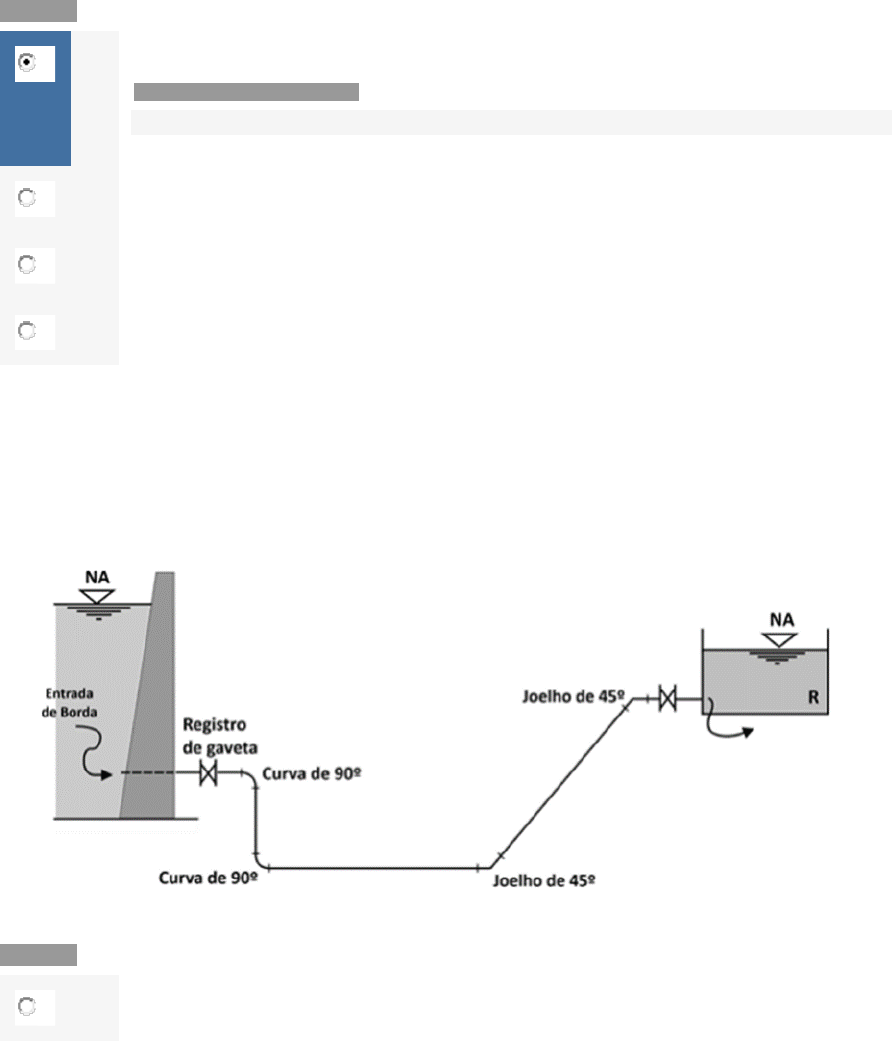 Questão 1/10 - Hidráulica Quando estudado o conduto forçado, algumas características podem ser admitidas observando a linha piezométrica. Analise as afirmações abaixo: i Para escoamento uniformes e com perda de carga distribuída a linha piezométrica é constante. ii É possível observar quedas abruptas na linha piezométrica quando há perdas de carga localizada. iii A linha piezométrica apresenta uma declividade acentuada quando são inseridas bombas hidráulicas. É correto afirmar: Nota: 10.0 A i e ii; Você assinalou essa alternativa (A) Você acertou! B ii e iii; C i e iii; D i, ii e iii. Questão 2/10 - Hidráulica Sabendo que a velocidade no escoamento da figura é 1,53 m/s, que K1 (curva 90º ) = 0,4, K2 (válvula de gaveta aberta) = 0,2, K3 (entrada na tubulação) = 1,0, K4 (joelho 45’) = 0,4 e K5 (saída do escoamento) = 1. Analise a figura a seguir: É correto afirmar que a perda de carga localizada total do escoamento é: Nota: 10.0 A 0,98m; B 1,48m; C 0,78m; D 0,48m. Você assinalou essa alternativa (D) Você acertou! Questão 3/10 - Hidráulica O conduto é considerado equivalente quando escoa uma mesma vazão, utilizando a mesma quantidade de energia (perda contínua total). A consideração de um conduto equivalente é uma simplificação nos cálculos de sistemas interligados. A equação utilizada para determinação da perda de carga equivalente e contínua é É correto afirmar que: Nota: 10.0 A é a perda contínua equivalente (m), é o fator de rugosidade equivalente (adimensional); Você assinalou essa alternativa (A) Você acertou! B é o diâmetro de maior valor nominal (m); C L é o comprimento do conduto de maior valor nominal (m). D é a perda contínua do maior diâmetro (m), é o fator de rugosidade mínimo do sistema (adimensional); Questão 4/10 - Hidráulica As redes de distribuição de água e esgoto utilizam tubulações paralelas, com diâmetros variáveis, e ocorre a entrada e/ou saída de outros escoamentos nas tubulações e existe uma rede interligada. Com relação a redes de distribuição é correto afirmar: Nota: 10.0 A Alterações de diâmetro, de direção e cruzamento entre tubos são denominados nós; Você assinalou essa alternativa (A) Você acertou! B A região compreendida entre os nós não tem significância nas determinações de vazão na tubulação, esta região é denominada trecho; C Quando se tem muitos anéis interligados é chamado de malha, o que inviabiliza a determinação da perda de carga total do sistema; D As malhas são trecho que possuem muitos anéis, comumente visto em cidades. Estas malhas acompanham os terrenos das residências. Questão 5/10 - Hidráulica A cavitação pode ocorrer ao longo da tubulação, e também em estruturas como vertedores, válvulas, bombas, orifícios e curvas. A cavitação é percebida como um estalo dependendo da dimensão das bolhas envolvidas. Para impedir a cavitação podem ser utilizadas algumas soluções. Analise as questões a seguir e assinale a alternativa correta para evitar ou corrigir a formação da cavitação. Nota: 10.0 A Aumento da pressão auxilia no escoamento mais rápido e preenche o conduto, evitando a formação de bolhas; B A redução da pressão em fases, instalando equipamentos ou tubulações com maior resistência; Você assinalou essa alternativa (B) Você acertou! C Aumento da ingestão de ar na tubulação para aumentar a alteração da massa específica do escoamento e reduzir a velocidade; D Implodir as bolhas de forma compulsória para reduzir a cavitação. Questão 6/10 - Hidráulica Nos condutos e em redes de abastecimento, é comum a perda de escoamento ao longo das tubulações. O escoamento de entrada, geralmente, é diferente do escoamento de saída do conduto, em que parte da vazão é consumida ou distribuída em determinados pontos das tubulações. Tal fenômeno é conhecido como distribuição em marcha. Para distribuição em marcha é correto afirmar: Nota: 10.0 A Para ocorrer a distribuição em marcha é necessária todas as tubulações conectadas a anéis de ferro, o que ocasiona perda de vazão. B É um fenômeno muito comum em tubulações urbanas de distribuição de água; Você assinalou essa alternativa (B) Você acertou! C Os projetos de tubulações não consideram a vazão em marcha; D Não há perda de carga nas tubulações utilizadas em distribuição de água urbana que apresentam distribuição em marcha. Questão 7/10 - Hidráulica O coeficiente de atrito (f) é uma característica adimensional utilizada na determinação da perda de carga. Com relação ao coeficiente de atrito é correto afirmar: Coeficiente de atrito é utilizado apenas para escoamentos laminares, onde apenas a velocidade é considerada. 1. Para melhor determinação do coeficiente de atrito é necessário conhecer a vazão, dimensão do conduto e a pressão. 2. O número de Reynolds e a rugosidade da tubulação interferem diretamente nos valores do coeficiente de atrito. 3. Pode-se utilizar o coeficiente de atrito para determinar diretamente a perda de carga resultante do atrito, sem necessidade de conhecer as demais informações do conduto, como: comprimento, diâmetro ou velocidade Nota: 10.0 A Coeficiente de atrito é utilizado apenas para escoamentos laminares, onde apenas a velocidade é considerada. B Para melhor determinação do coeficiente de atrito é necessário conhecer a vazão, dimensão do conduto e a pressão. C O número de Reynolds e a rugosidade da tubulação interferem diretamente nos valores do coeficiente de atrito. Você assinalou essa alternativa (C) Você acertou! D Pode-se utilizar o coeficiente de atrito para determinar diretamente a perda de carga resultante do atrito, sem necessidade de conhecer as demais informações do conduto, como: comprimento, diâmetro ou velocidade Questão 8/10 - Hidráulica A partir da figura a seguir, determine a vazão. Sabendo que o L1 = 1km e L2 = 0,8km, a vazão de es
