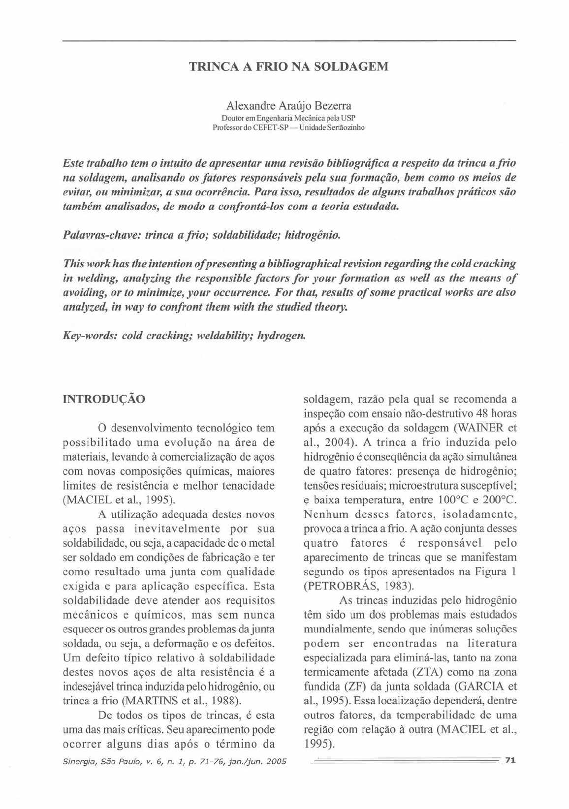 TRINCA A FRIO NA SOLDAGEM Alexandre Araújo Bezerra Doutor em Engenharia Mecânica pela USP Professor do CEFET-SP - Unidade Sertãozinho Este trabalho tem o intuito de apresentar uma revisão bibliográfica a respeito da trinca afrio na soldagem, analisando os fatores responsáveis pela sua formação, bem como os meios de evitar, ou minimizar, a sua ocorrência. Para isso, resultados de alguns trabalhos práticos são também analisados, de modo a confrontâ-los com a teoria estudada. Palavras-chave: trinca a frio; soldabilidade; hidrogênio. This work has the intention ofpresenting a bibliographical revision regarding the cold cracking in welding, analyzing the responsible factors for your formation as well as the means of avoiding, or to minimize, your occurrence. For that, results of some practical works are also analyzed, in way to confront them with the studied theory. Key-words: cold cracking; weldability; hydrogen. INTRODUÇÃO o desenvolvimento tecnológico tem possibilitado urna evolução na área de materiais, levando à comercialização de aços com novas composições químicas, maiores limites de resistência e melhor tenacidade (MACIEL et al., 1995). A utilização adequada destes novos aços passa inevitavelmente por sua soldabilidade, ou seja, a capacidade de o metal ser soldado em condições de fabricação e ter corno resultado urna junta com qualidade exigida e para aplicação específica. Esta soldabilidade deve atender aos requisitos mecânicos e químicos, mas sem nunca esquecer os outros grandes problemas da junta soldada, ou seja, a deformação e os defeitos. Um defeito típico relativo à soldabilidade destes novos aços de alta resistência é a indesejável trinca induzi da pelo hidrogênio, ou trinca a frio (MARTINS et al., 1988). De todos os tipos de trincas, é esta urna das mais críticas. Seu aparecimento pode ocorrer alguns dias após o término da Sinergia, São Paulo, v. 6, n. 1, p. 71-76, jan./jun. 2005 soldagem, razão pela qual se recomenda a inspeção com ensaio não-destrutivo 48 horas após a execução da soldagem (WAINER et al., 2004). A trinca a frio induzida pelo hidrogênio é conseqüência da ação simultânea de quatro fatores: presença de hidrogênio; tensões residuais; microestrutura susceptível; y baixa temperatura, entre 100°C e 200°C. Nenhum desses fatores, isoladamente, provoca a trinca a frio. A ação conjunta desses quatro fatores é responsável pelo aparecimento de trincas que se manifestam segundo os tipos apresentados na Figura 1 (PETROBRÁS, 1983). As trincas induzi das pelo hidrogênio têm sido um dos problemas mais estudados mundialmente, sendo que inúmeras soluções podem ser encontradas na literatura especializada para eliminá-Ias, tanto na zona termicamente afetada (ZTA) corno na zona fundida (ZF) da junta soldada (GARCIA et al., 1995). Essa localização dependerá, dentre outros fatores, da temperabilidade de urna região com relação à outra (MACIEL et al., 1995). Trinca a frio na soldagem Alexandre Bezerra Figura 1 - Tipos de trincas provocadas pelo hidrogênio. Porém, cada vez que um novo aço, com alto valor de limite de resistência, é produzido, o problema ressurge e novos estudos são necessários. Isso porque a susceptibilidade à formação das trincas a frio aumenta com o aumento da resistência dos aços. Desta forma, são exigidos maiores cuidados na soldagem e maior rigor na utilização de processos e consumíveis que depositem cordões com hidrogênio superior a 5 mlllOOg (GARCIA et al., 1995). A susceptibilidade às trincas induzidas pelo hidrogênio em aços de alta resistência pode ser avaliada através de diversos ensaios de soldabilidade. A finalidade desses ensaios é avaliar esse fenômeno e como o teor de hidrogênio, a tensão, a taxa de resfriamento e a temperatura influenciam na formação e propagação dessas indesejáveis trincas (MARTINS et al., 1988). Os ensaios de soldabilidade mais utilizados são o Tekken e o Lehigh, que são de auto-restrição, e, portanto, não avaliam a influência da variação do nível de tensão; e o TRC, RRC e implante, que são de restrição externa (MARTINS et al., 1988). O ensaio Tekken é o mais utilizado devido ao seu baixo custo, versatilidade, boa reprodutividade e facilidade de se quantificar a porcentagem de trincas, permitindo assim avaliar a formação de trincas tanto na ZF como na ZTA (GARCIA et al., 1995). Através dos ensaios TRC e RRC podem-se avaliar todos os fatores que influem na formação das trincas a frio na ZF, sendo aqui o problema do fabricante de consumível. 72 ~======================~ Já o ensaio de implante avalia a trinca a frio na ZTA, e aqui o problema é do fabricante do aço (MARTINS et al., 1988). Para se verificar o efeito da variação do nível de tensão imposta pela solda, além da influência do teor de hidrogênio, taxa de resfriamento e temperatura, pode ser utilizado o versátil Ensaio de Restrição Controlada, que é baseado no ensaio japonês LB- TRC, e derivado do ensaio TRC (MATSUDA et al., 1979). ANÁLISE DOS MECANISMOS DE FORMAÇÃO DAS TRINCAS A FRIO Presença do hidrogênio Comparado com outros intersticiais, o hidrogênio se difunde muito mais facilmente através do ferro-a. A 20°C, estima-se que os átomos de hidrogênio sejam capazes de pular a velocidades muito mais rápidas que a do carbono e do nitrogênio. Na verdade, isso tem conduzido Fast (1976) a sugerir que o hidrogênio se comporta mais como um próton que como um átomo. Por outro lado, a máxima solubilidade do hidrogênio no ferro a temperatura de fusão é apenas 30 ppm. Isso sugere que a difusão dos átomos de hidrogênio no ferro deve ocorrer praticamente independente de tensão (EASTERLING, 1992). Uma interessante característica das medidas da difusividade do hidrogênio nos aços ferríticos é a larga dispersão de resultados a temperaturas abaixo de 200°C. É usual assumir dois coeficientes de difusividade 